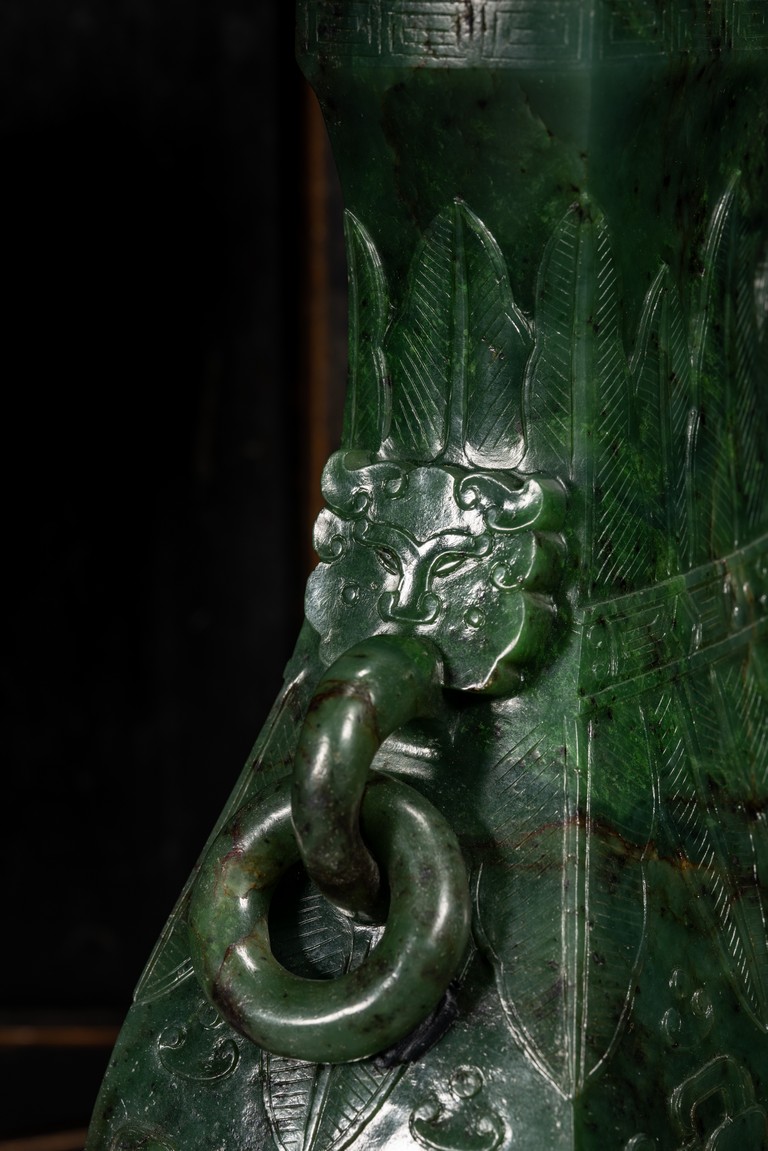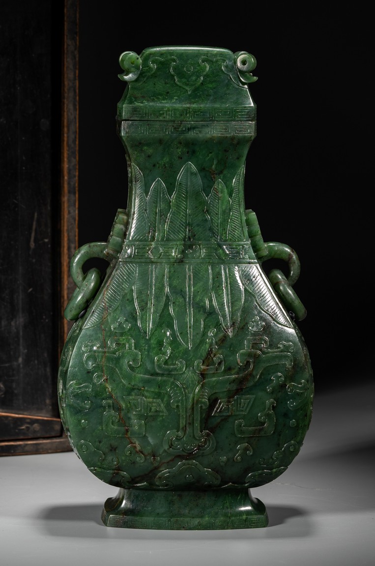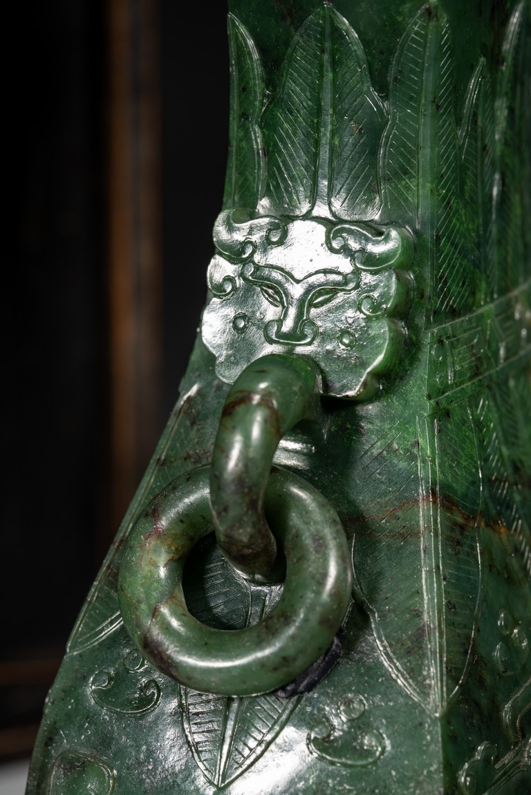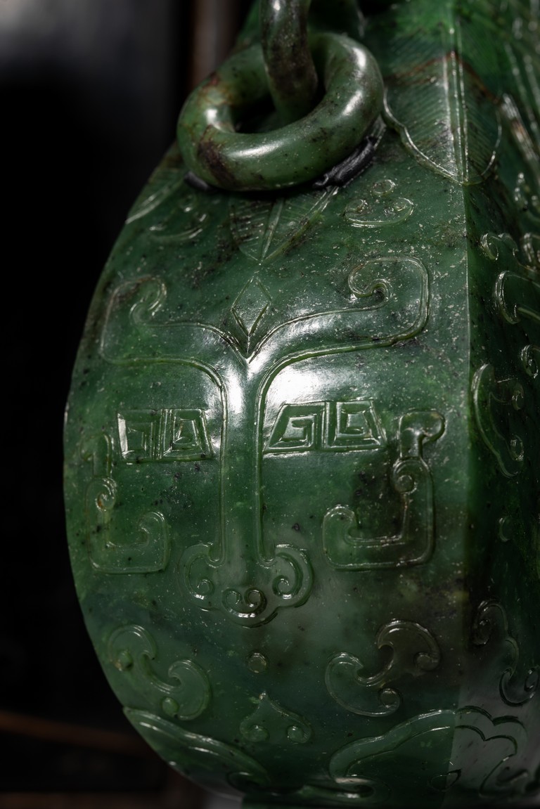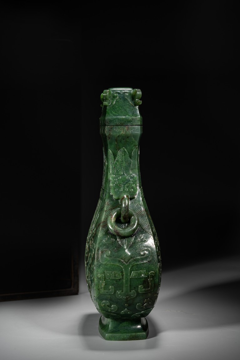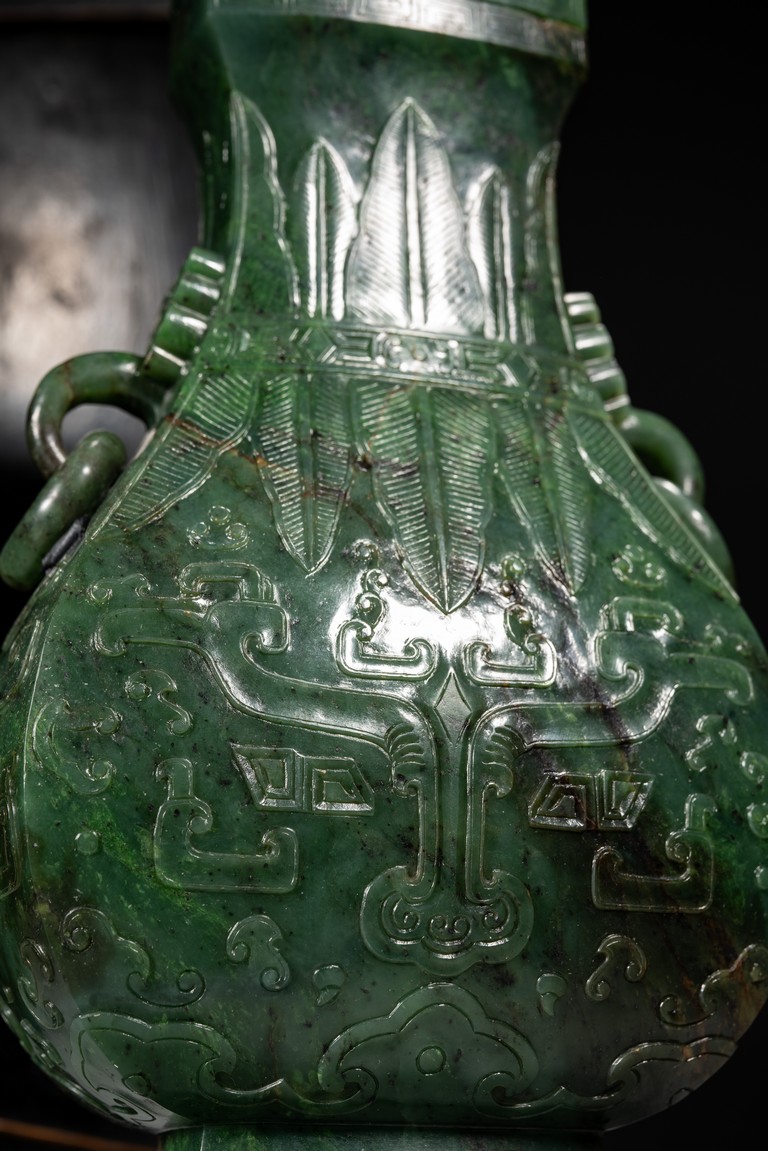 清代宮廷,特別是乾隆時期,有大量的仿照古代青銅器所制作的器物,尤其是玉壺、玉爐、玉瓶等室內陳設用品,這些器物以青銅器的造型為基礎,並融合了當時的風格特點,所制作出的器物既有古代的遺風,又具備了後代變化出來的各種不同的風格。此瓶紋飾細膩,雕工精湛,邊角配飾,正裝體統,圖案布局合理,造型古樸中不失靈動,具有典型清代乾隆期仿古玉器的意蘊。來源:紐約私人收藏 Provenance: Private collection, New York