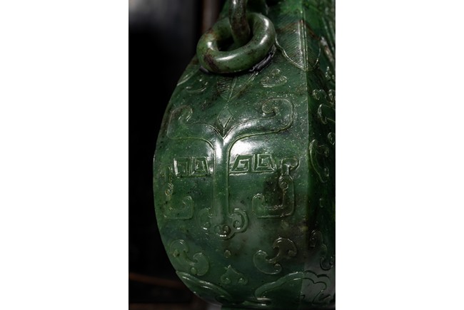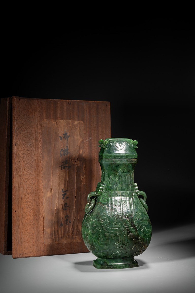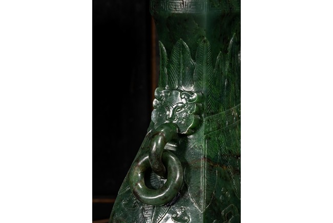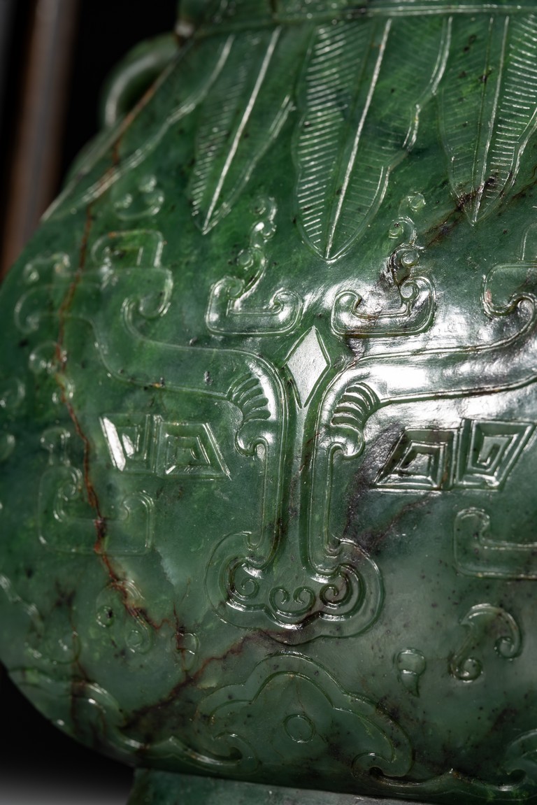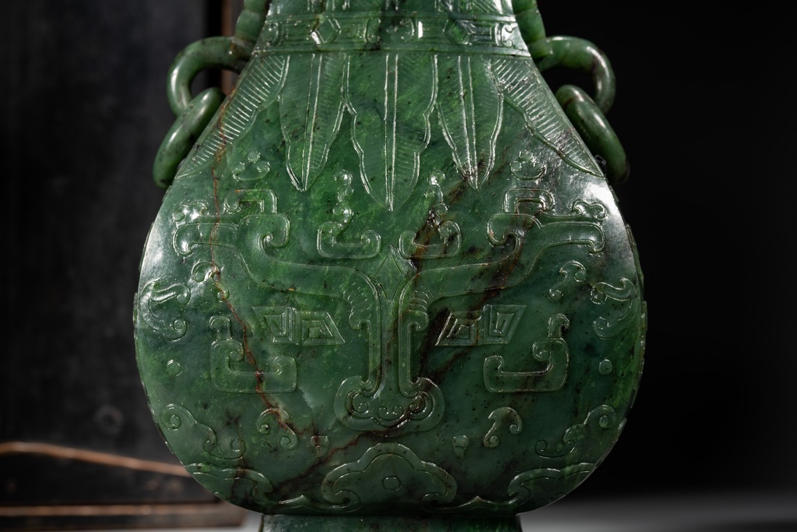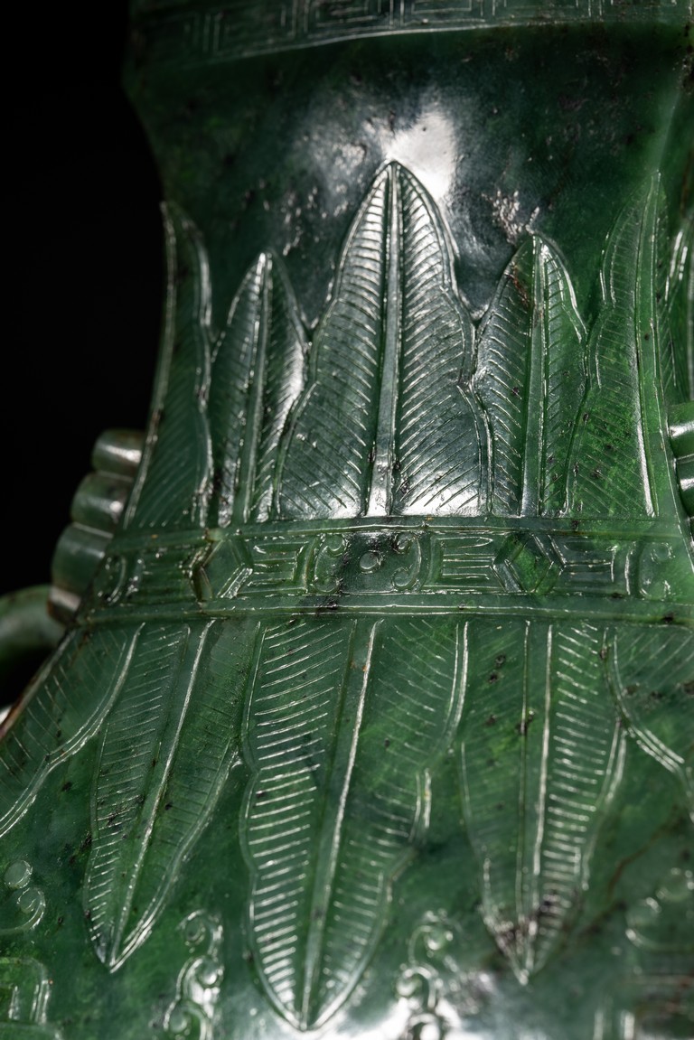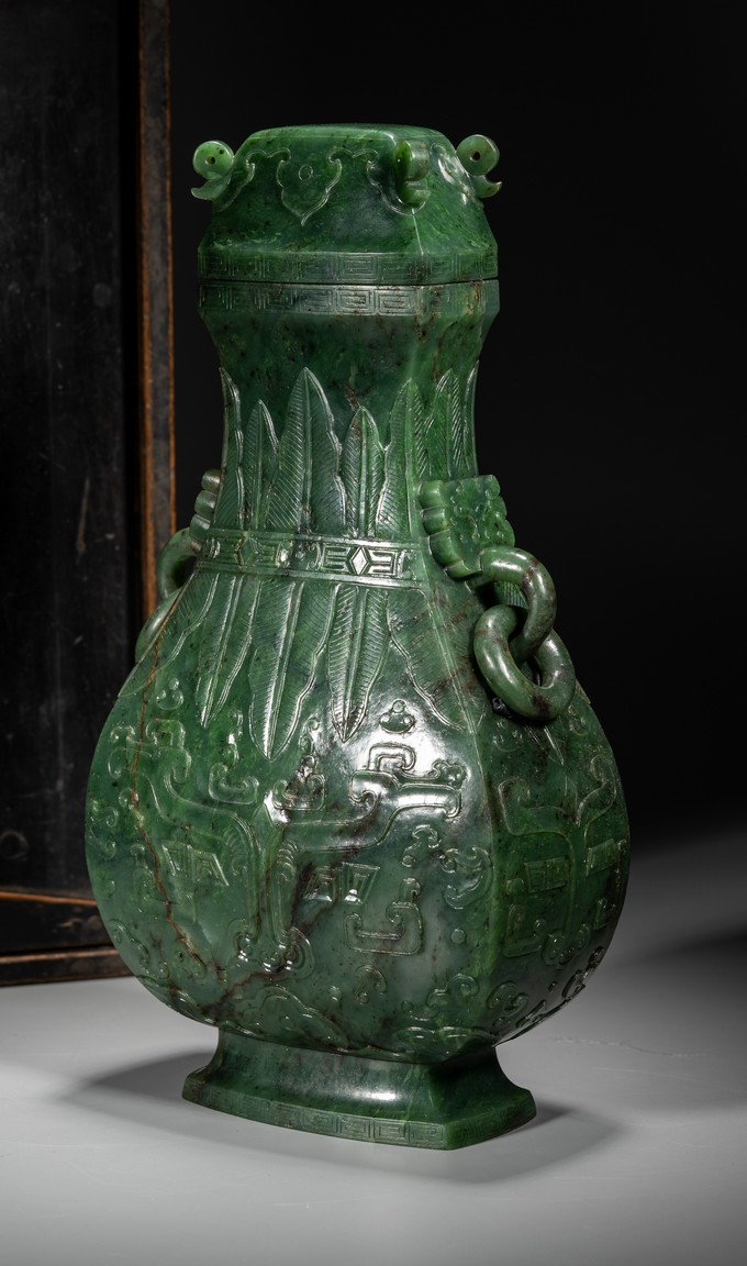 清代宮廷,特別是乾隆時期,有大量的仿照古代青銅器所制作的器物,尤其是玉壺、玉爐、玉瓶等室內陳設用品,這些器物以青銅器的造型為基礎,並融合了當時的風格特點,所制作出的器物既有古代的遺風,又具備了後代變化出來的各種不同的風格。此瓶紋飾細膩,雕工精湛,邊角配飾,正裝體統,圖案布局合理,造型古樸中不失靈動,具有典型清代乾隆期仿古玉器的意蘊。來源:紐約私人收藏 Provenance: Private collection, New York