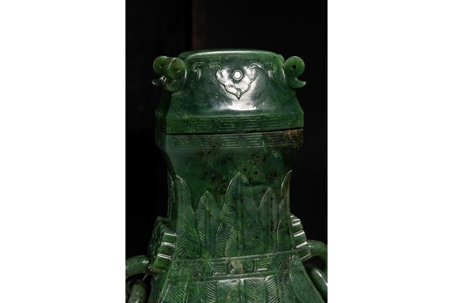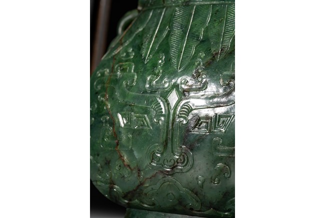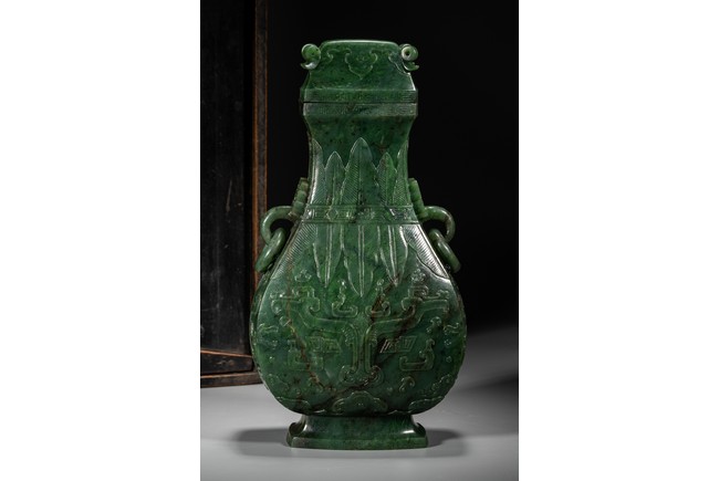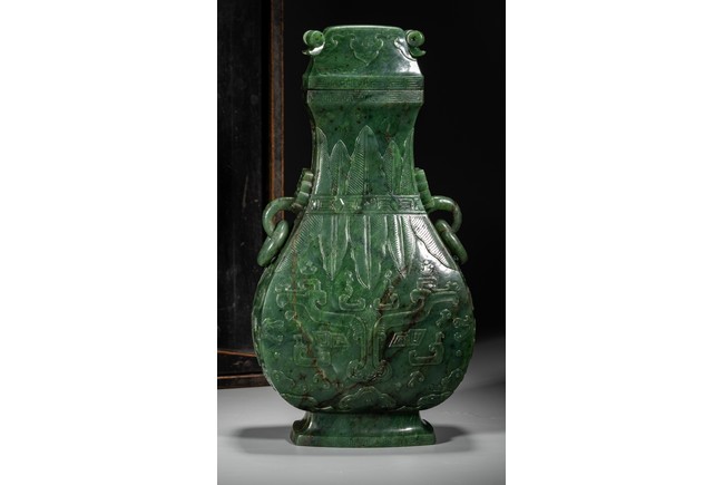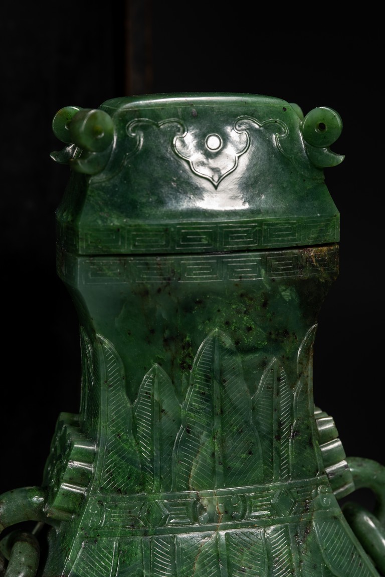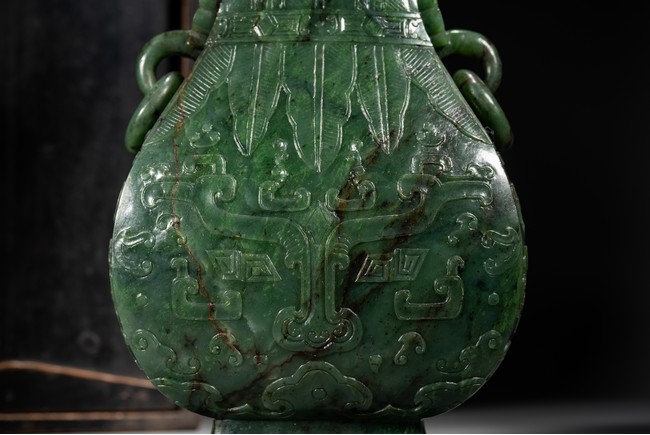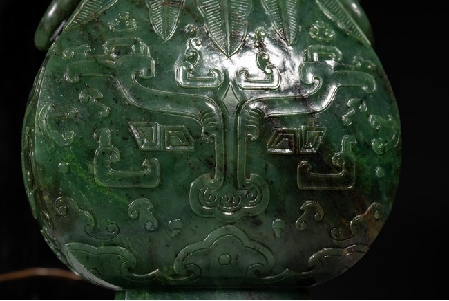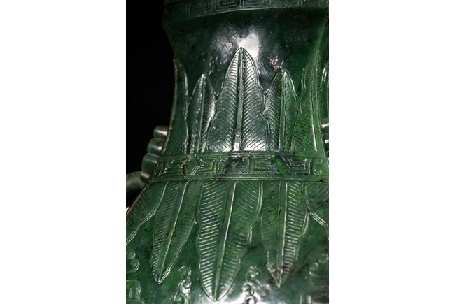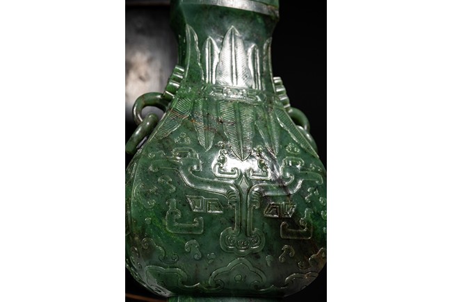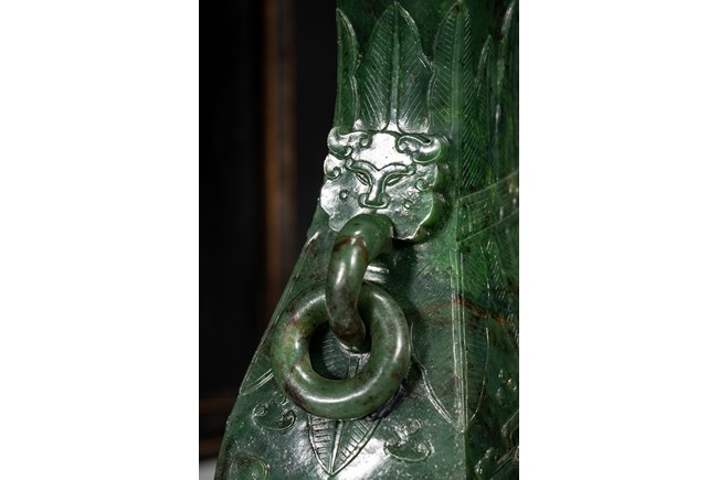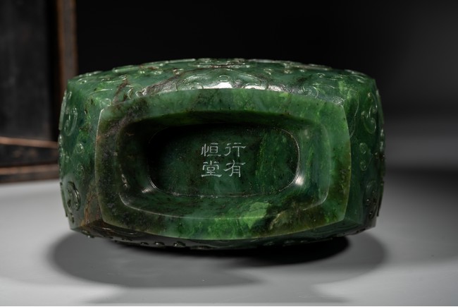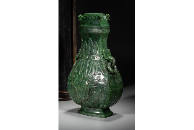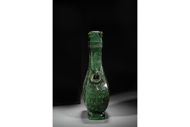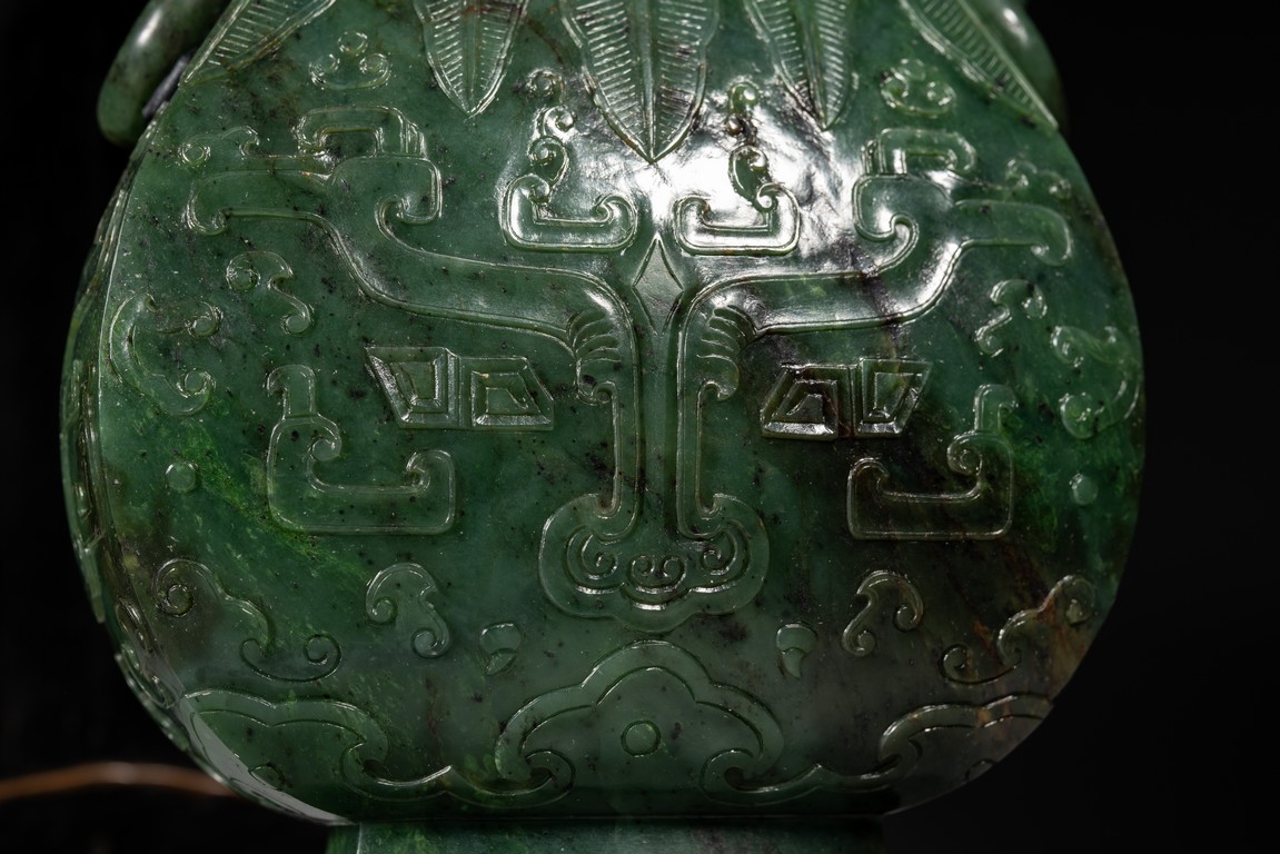 清代宮廷,特別是乾隆時期,有大量的仿照古代青銅器所制作的器物,尤其是玉壺、玉爐、玉瓶等室內陳設用品,這些器物以青銅器的造型為基礎,並融合了當時的風格特點,所制作出的器物既有古代的遺風,又具備了後代變化出來的各種不同的風格。此瓶紋飾細膩,雕工精湛,邊角配飾,正裝體統,圖案布局合理,造型古樸中不失靈動,具有典型清代乾隆期仿古玉器的意蘊。來源:紐約私人收藏 Provenance: Private collection, New York