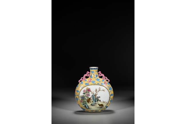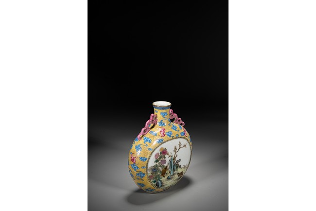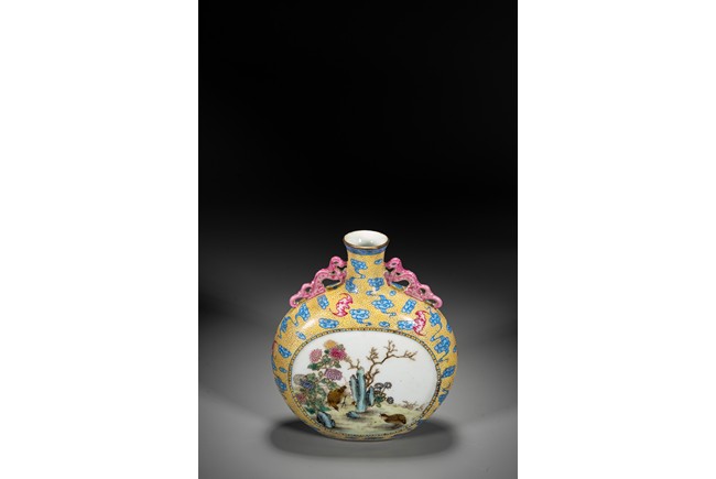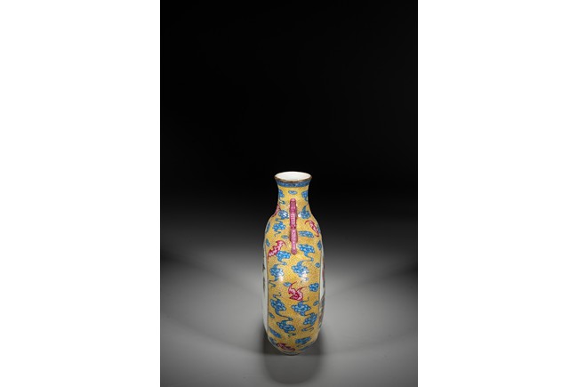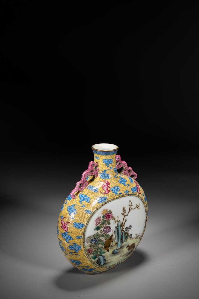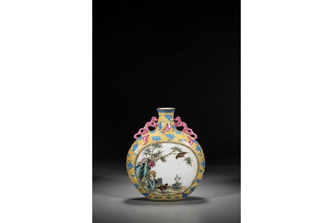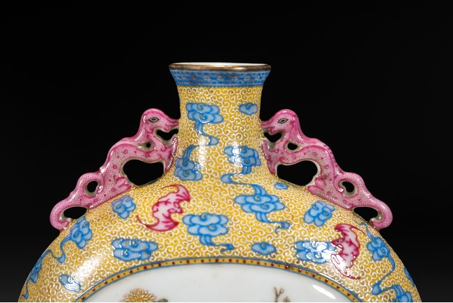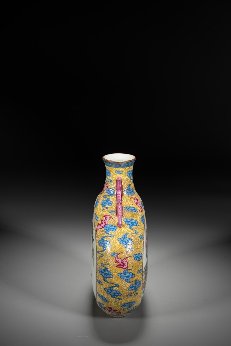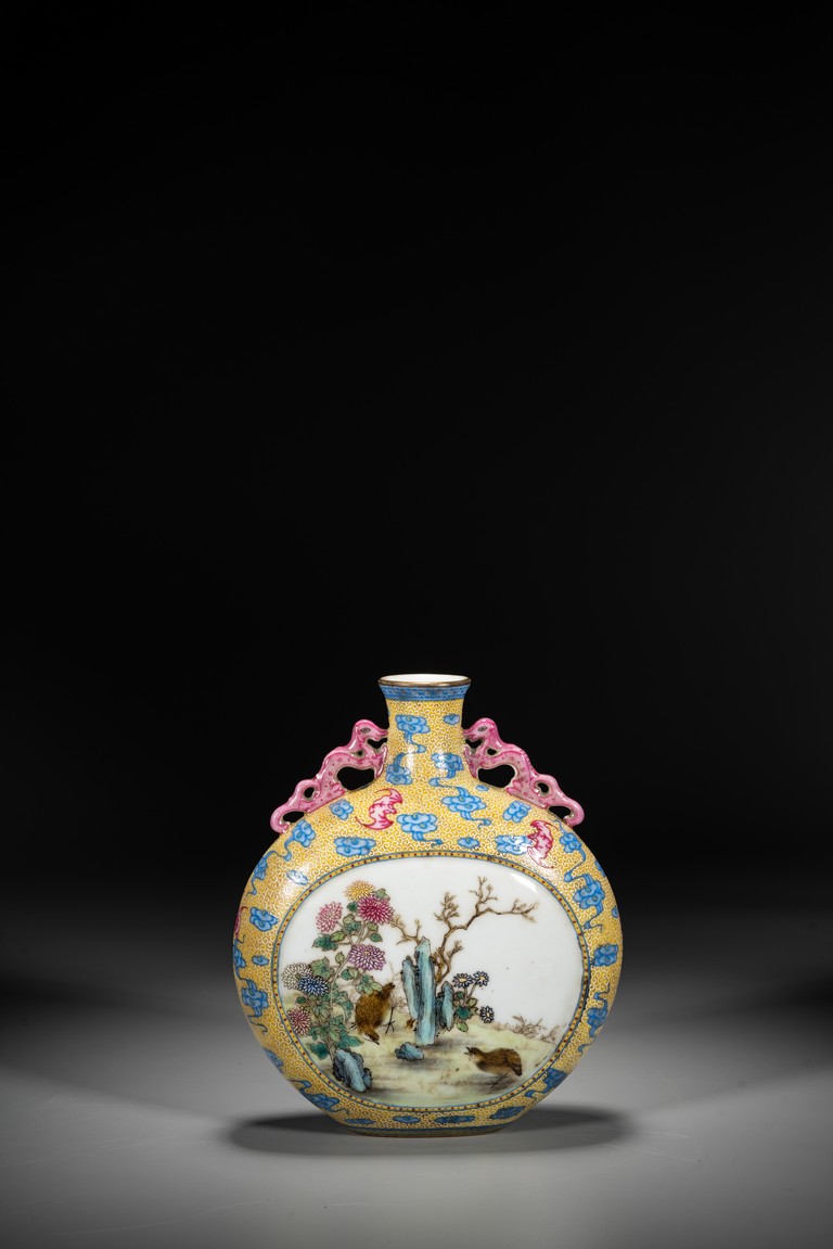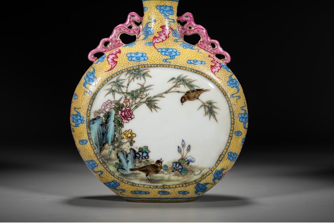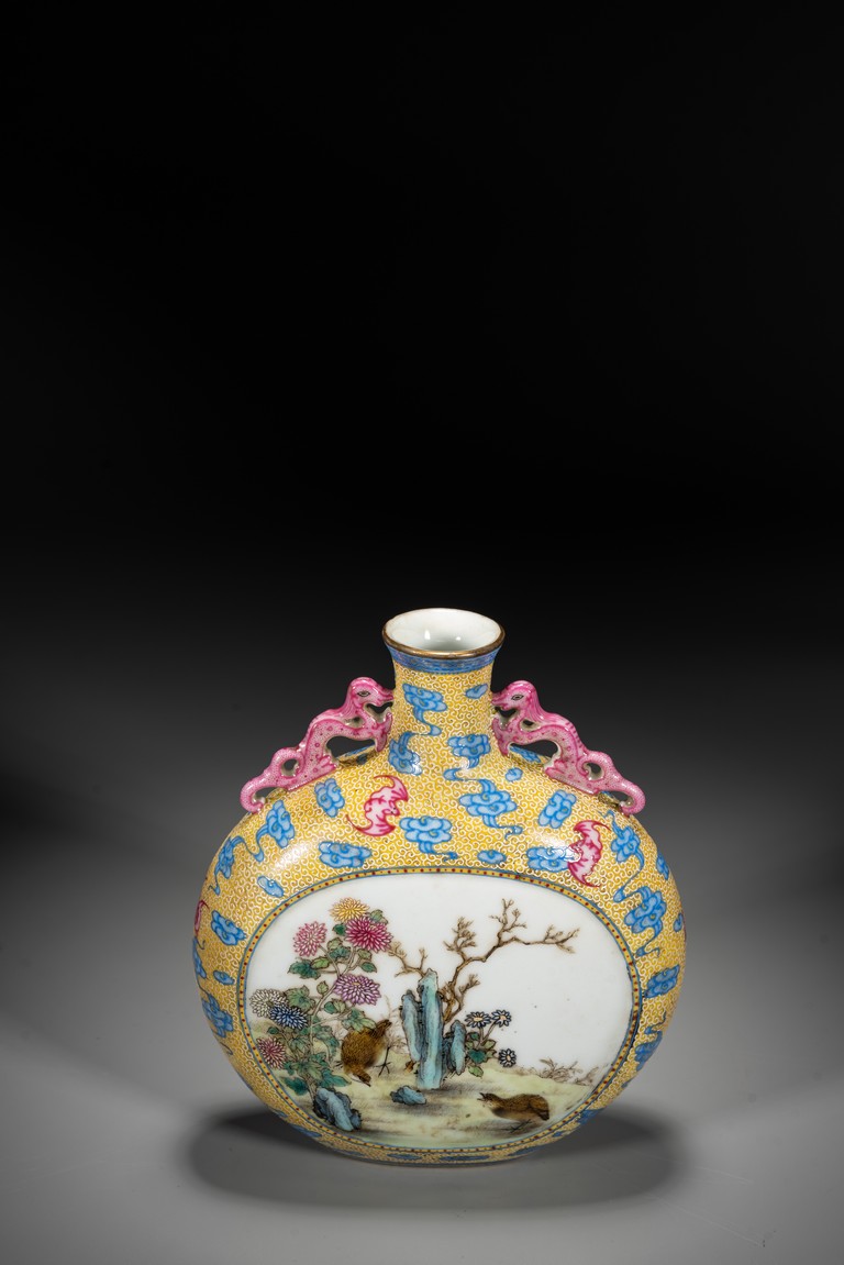 本品撇口,束頸,肩處飾對稱雙龍形耳,扁圓腹,橢圓形圈足。形制端莊,線條柔美自然,胎體輕薄堅質。以黃色為地,黃地顏色較淡,且透明度較高,色偏檸檬黃。上用藍料彩繪“卷雲紋”,紋飾清新自然,又以胭脂紅料彩繪”“蝙蝠紋”。腹部開窗繪“山石”“鵪鶉”“菊花”“竹子”“蓮花”“蘭花”“喜鵲”。在中國,菊、蓮、蘭、竹有「花中四君子」的美稱。整體寓意美好,有“安居樂業”“長壽富貴“之意。花朵俯仰有致,風姿綽約,佈局繁密而有致,不減清疏之氣,益見設計構圖之佳妙。竹子翠韻悠然,釉彩凝厚鮮亮,鵪鶉喜鵲繪畫細致,畫工精細,活靈活現。整器繪畫技巧高超,富貴華麗,典雅端莊,工藝繁覆,佈局繁密而有致,不減清疏之氣,益見設計構圖之佳妙。底部描金,