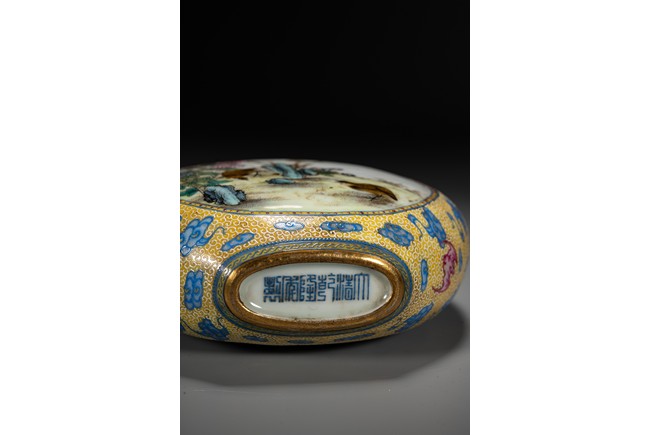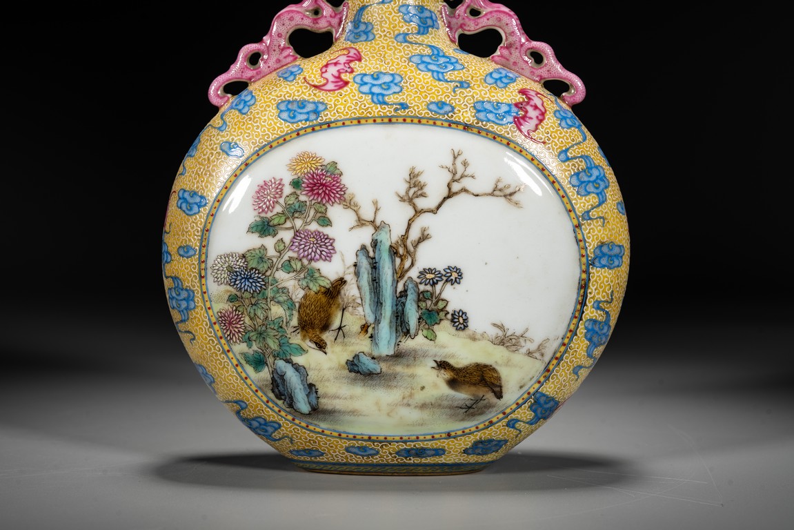 Of flattened globular form, the body decorated with the scene depicting two quails surrounded by rockwork and chrysanthemum, all reserved on yellow ground with clouds and bats, base with reign mark.
