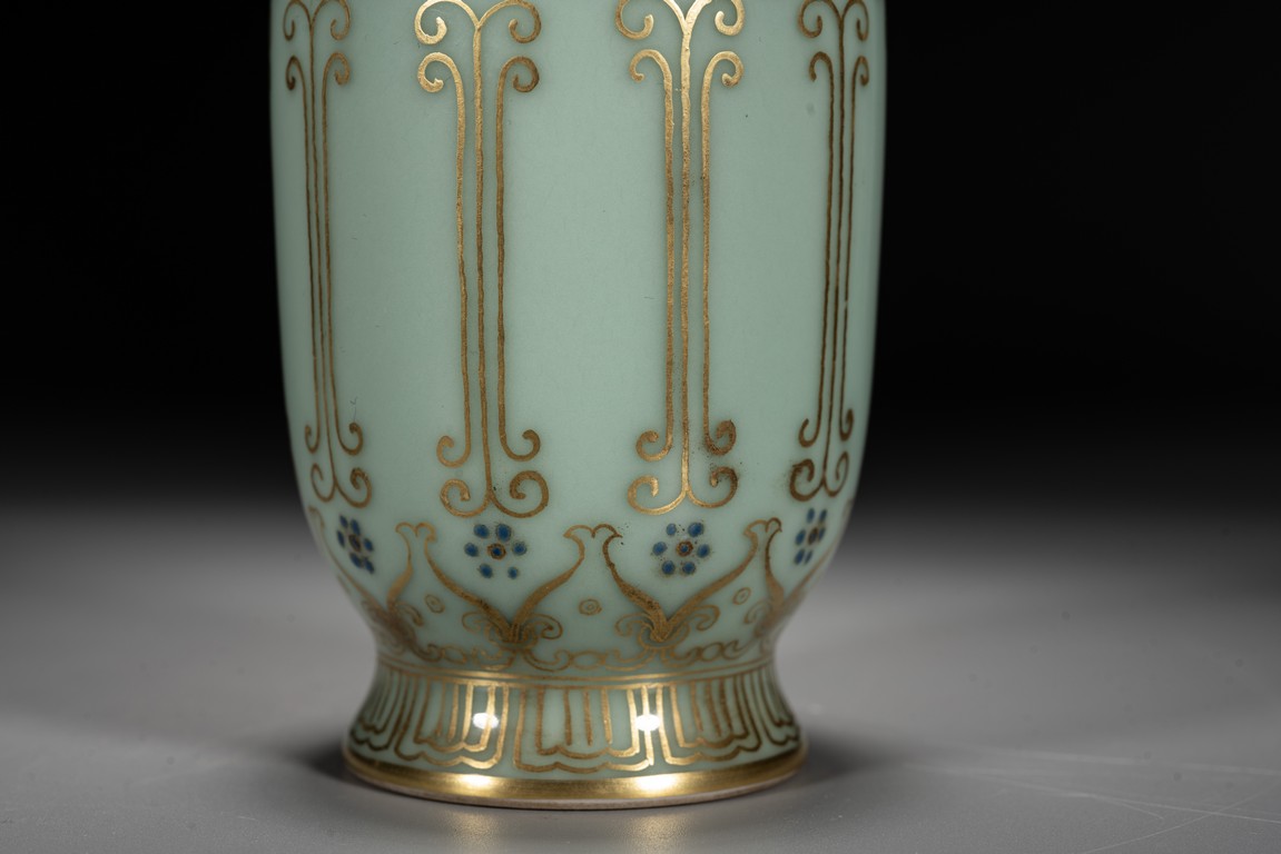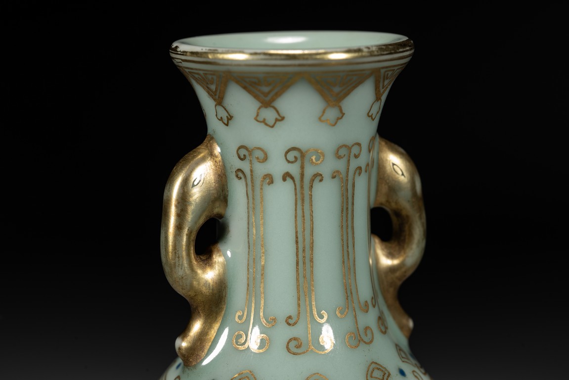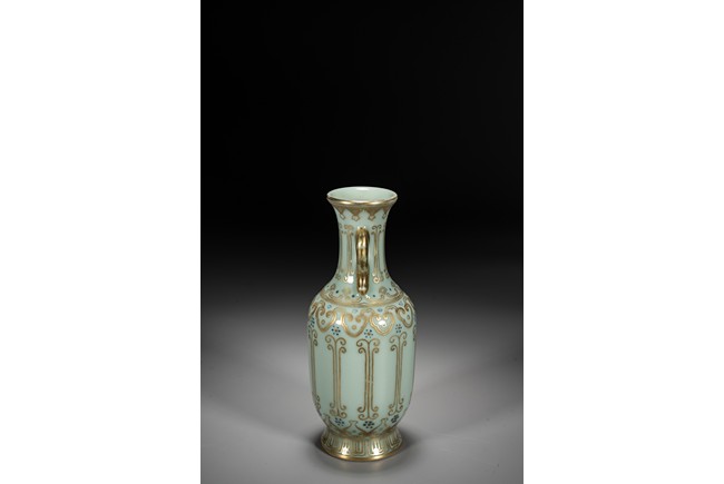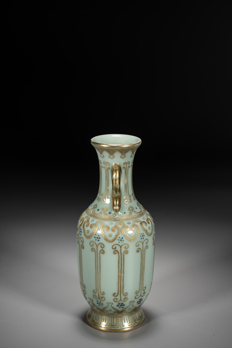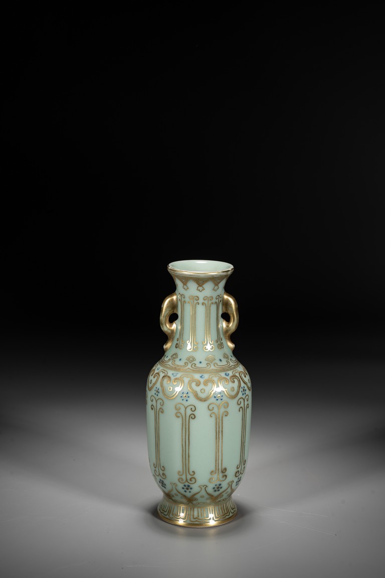 撇口,長頸,雙象耳,直腹,圈足外撇。器身施冬青釉,質地勻凈潤澤,透出淡淡綠韻,醉人心扉。周身描金,絢麗奪目,巧奪天工。部分花卉用琺瑯藍料彩點畫而成。整器小巧可愛,釉色秀麗,描金精絕,富麗華美。 “大清乾隆年制”款識。