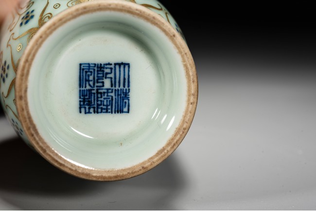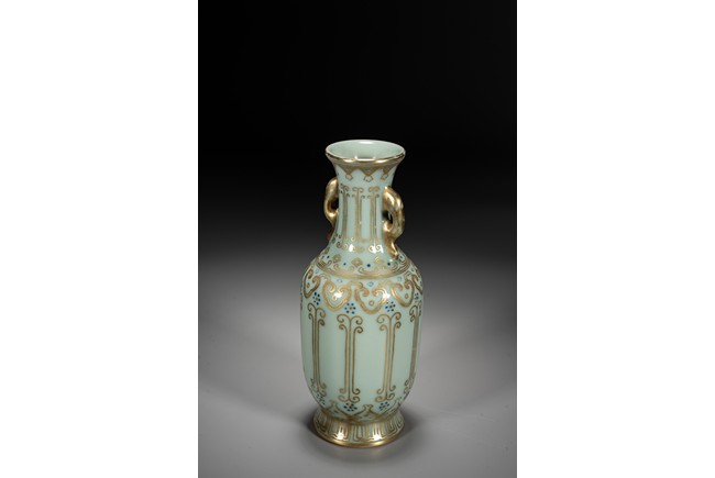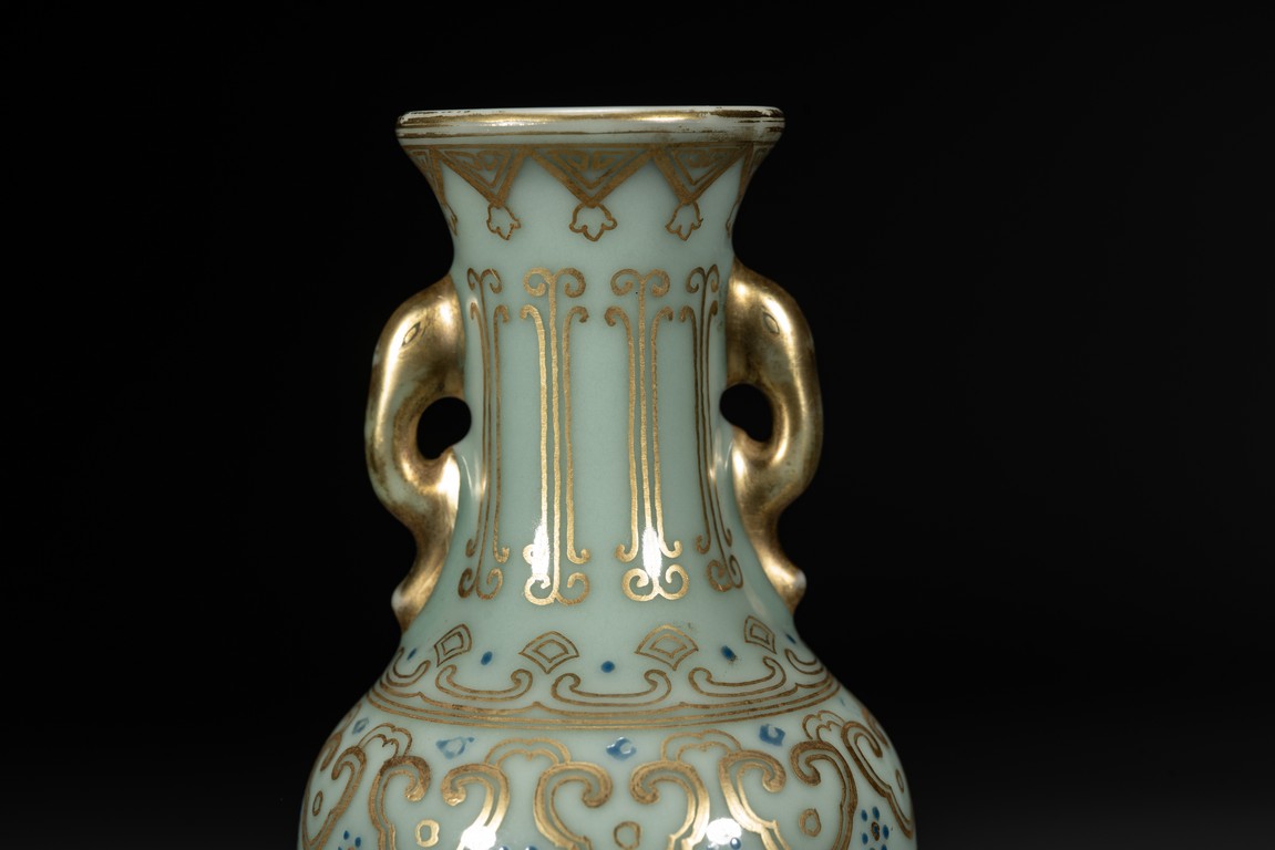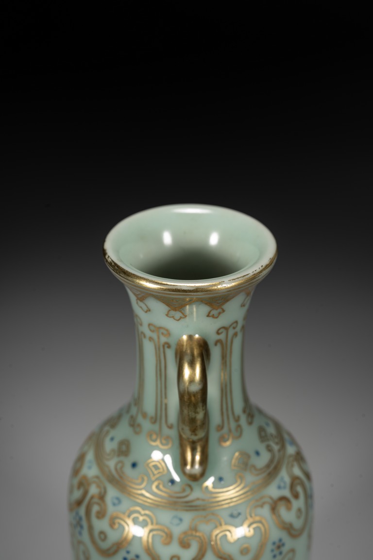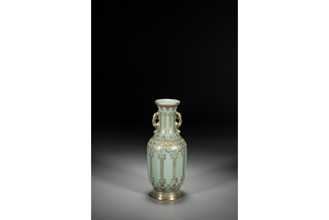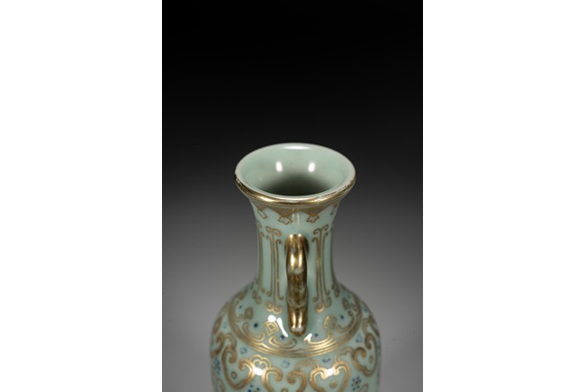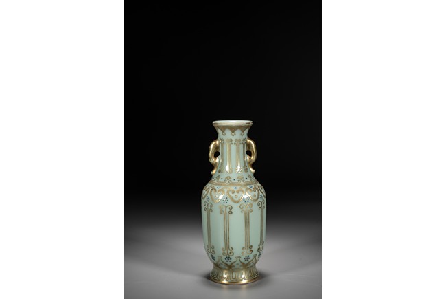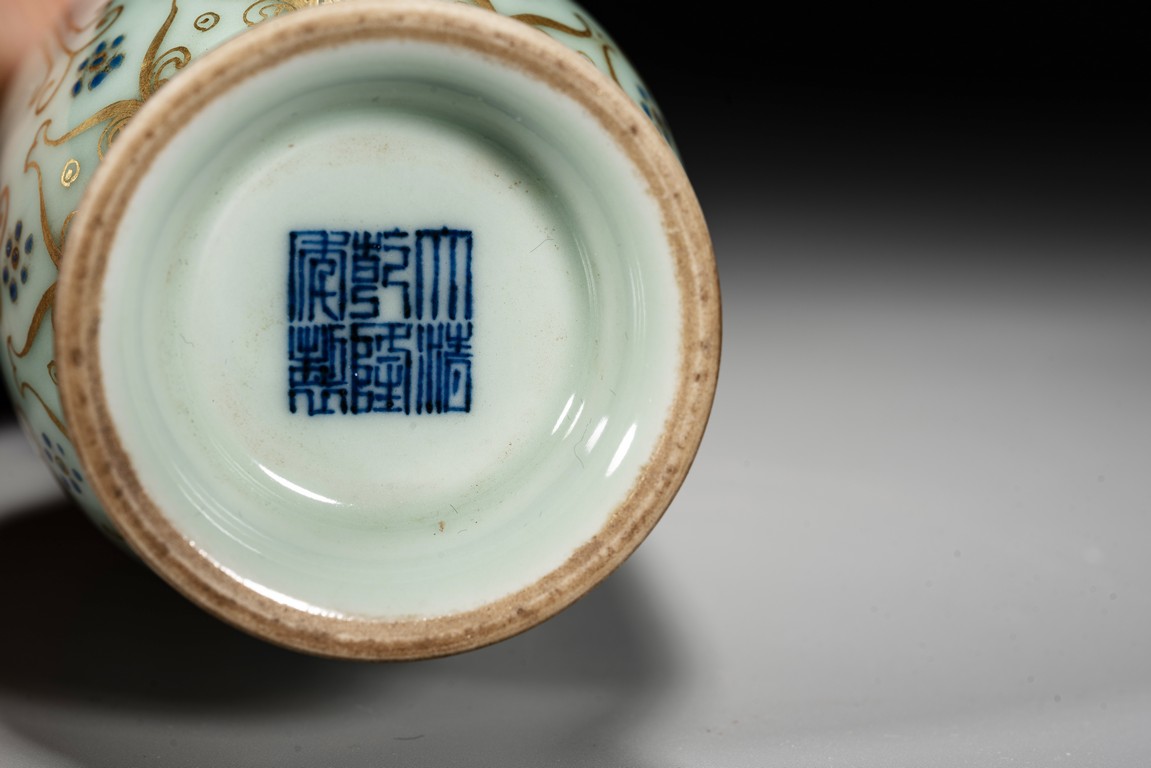 撇口,長頸,雙象耳,直腹,圈足外撇。器身施冬青釉,質地勻凈潤澤,透出淡淡綠韻,醉人心扉。周身描金,絢麗奪目,巧奪天工。部分花卉用琺瑯藍料彩點畫而成。整器小巧可愛,釉色秀麗,描金精絕,富麗華美。 “大清乾隆年制”款識。