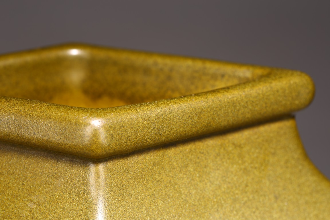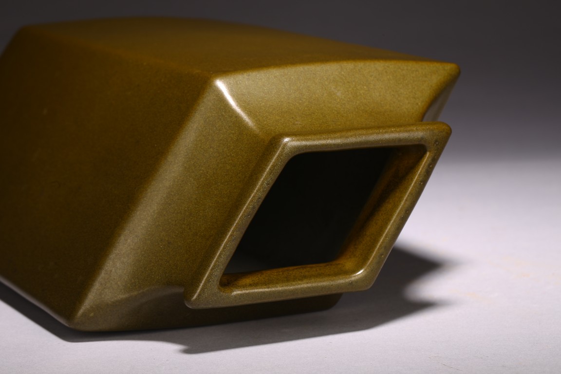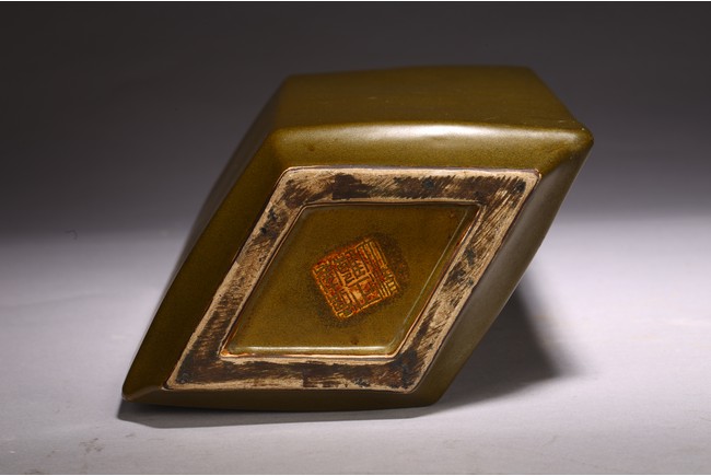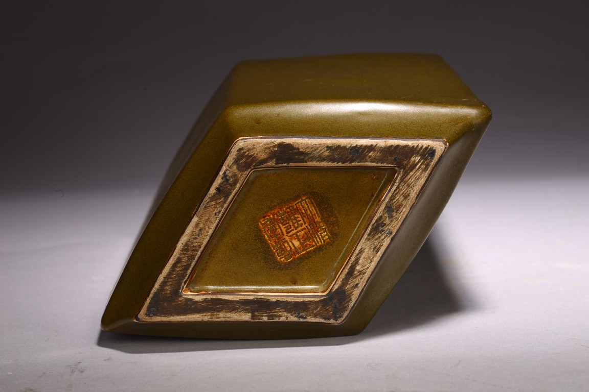 Qing Dynasty period. Of rhombus shape and rising to a lipped mouth, overall covered in attractive tea dust glaze, the base inscribed with six character reign mark.