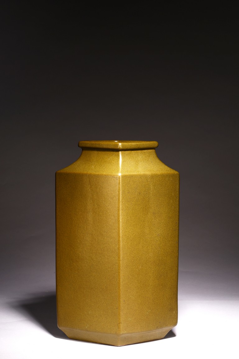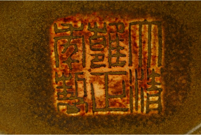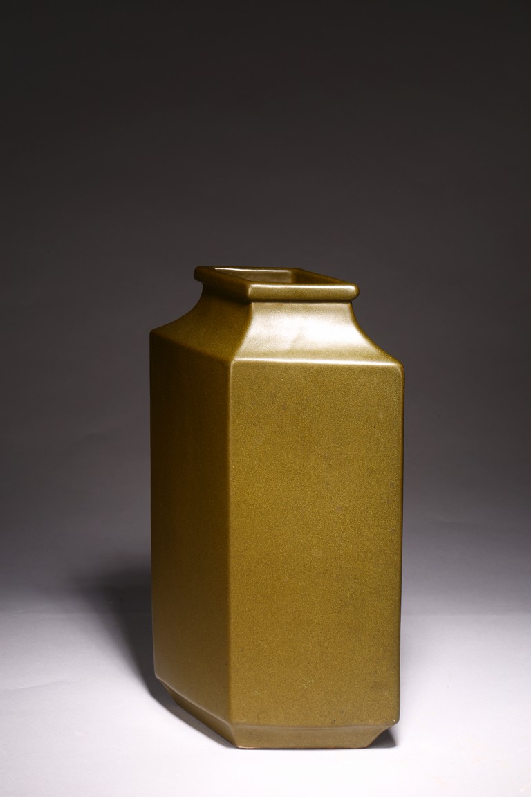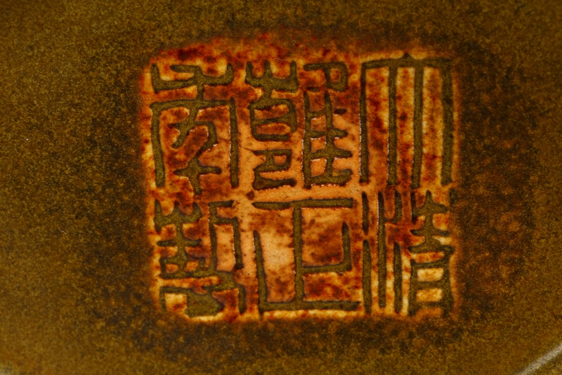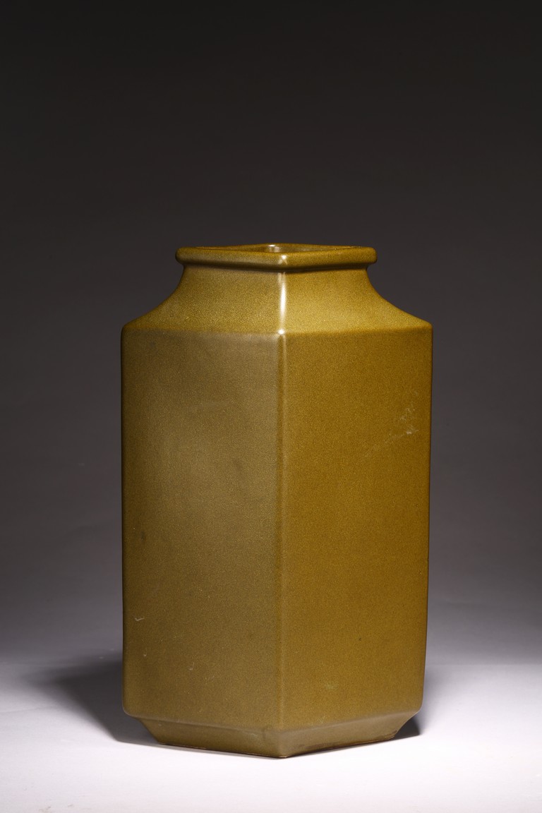 Qing Dynasty period. Of rhombus shape and rising to a lipped mouth, overall covered in attractive tea dust glaze, the base inscribed with six character reign mark.