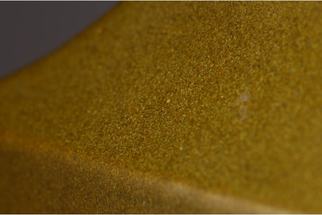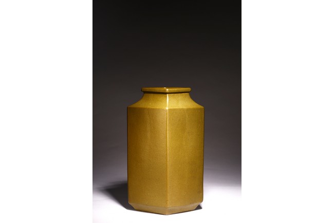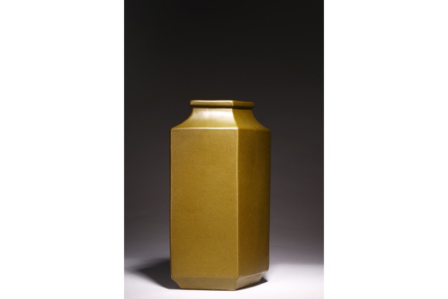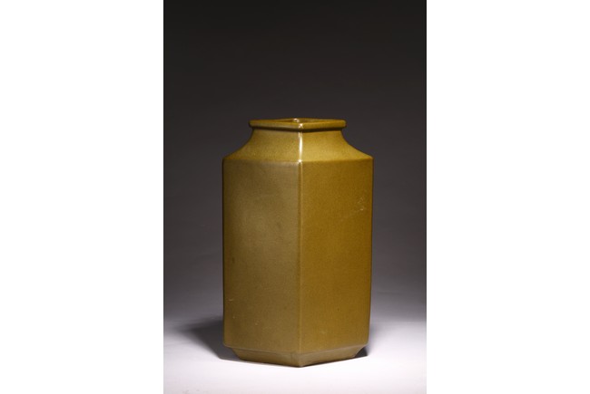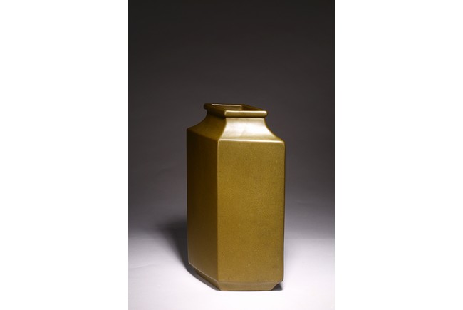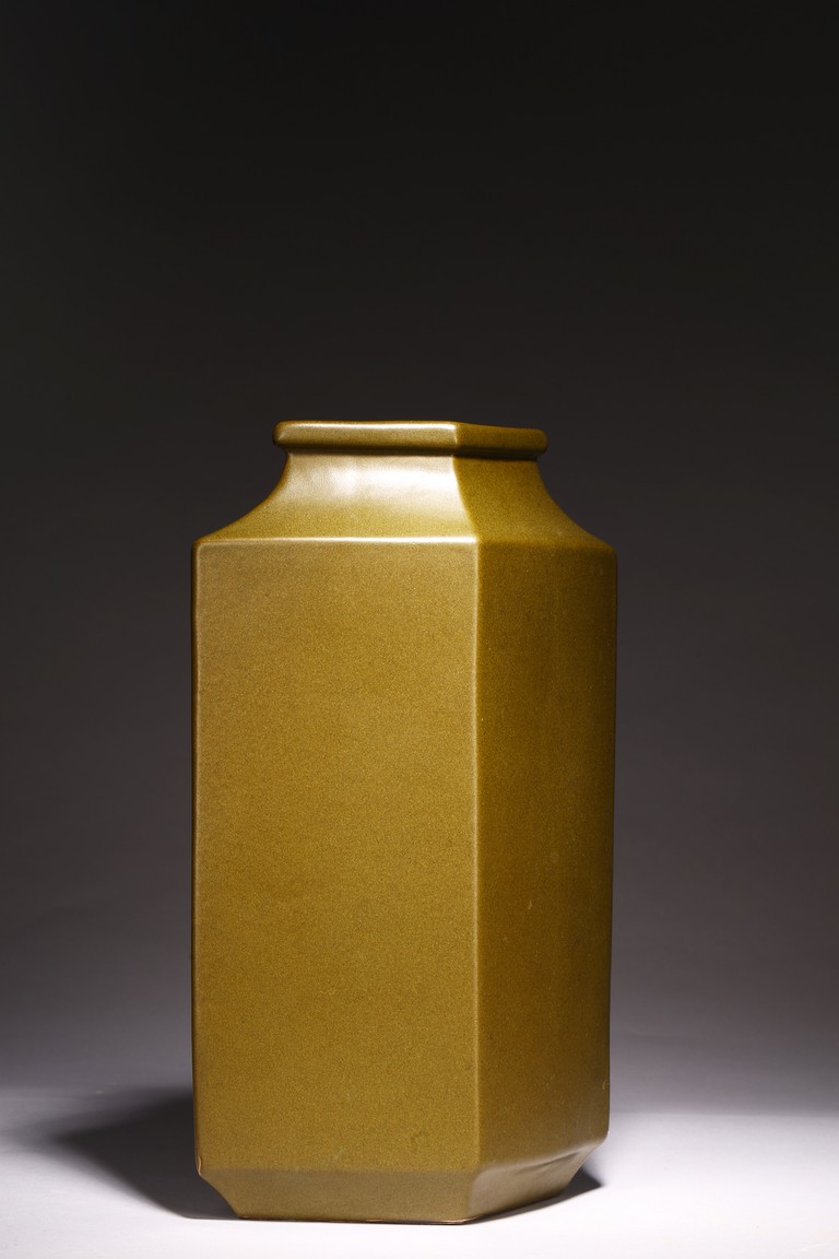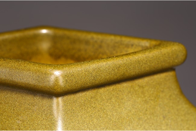 瓶體呈菱形,通體施茶葉末釉,釉質潤澤,釉色深沈。黃褐雜陳,色澤蒼雅靜穆,光澤厚潤柔和,圈足露胎處為黑褐色,以摹“鐵足”之效果,底款陰刻“大清雍正年制”款識。
