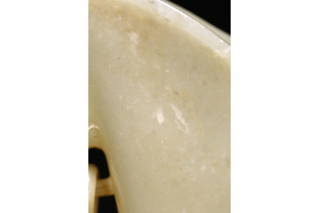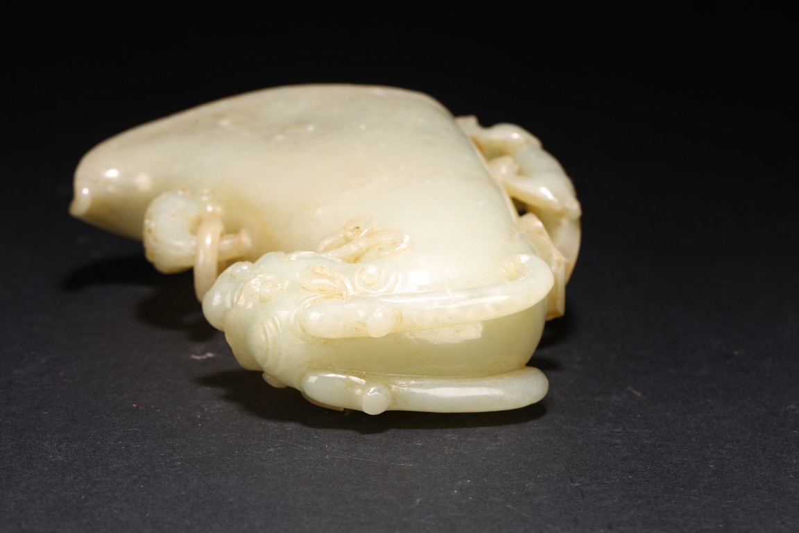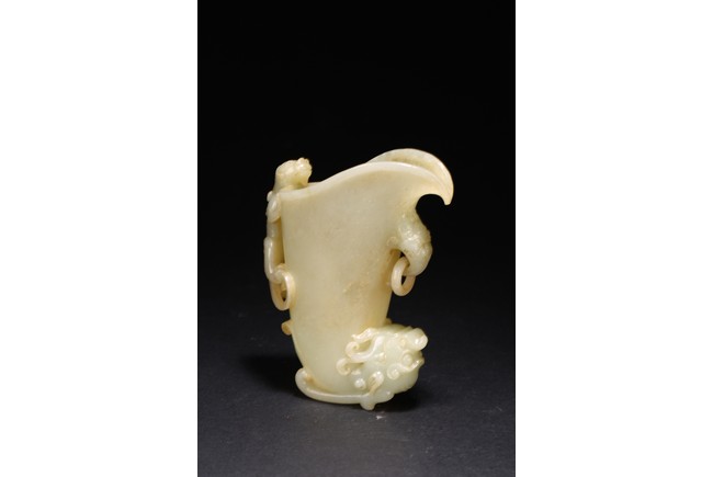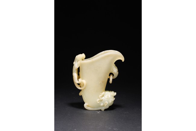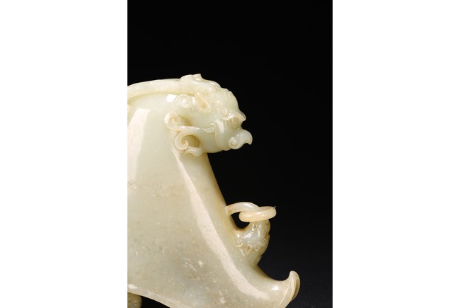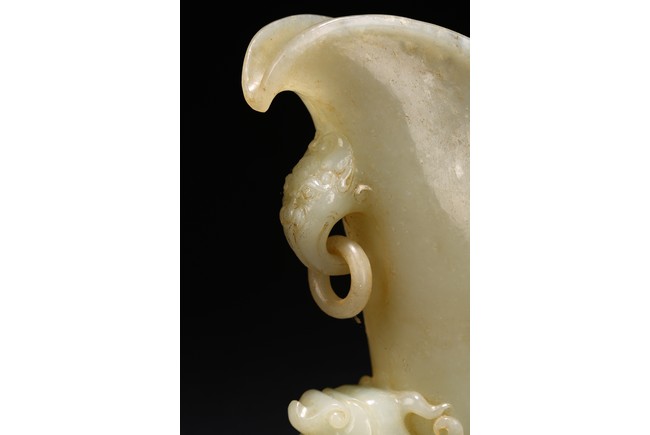 Qing Dynasty period. The well-hollowed vessel is carved issuing from the mouth of a dragon-fish. The handle is carved and undercut as a chilong grasping onto the rim, the other side carved with loose ring handle.