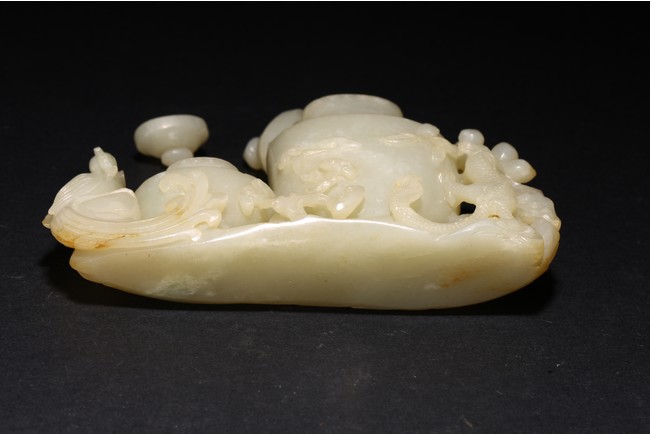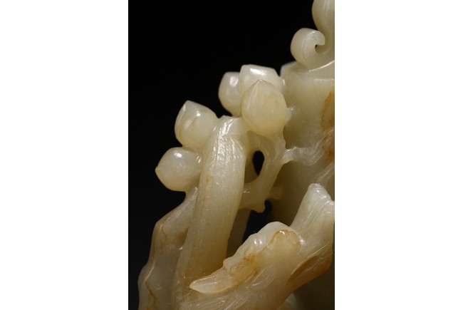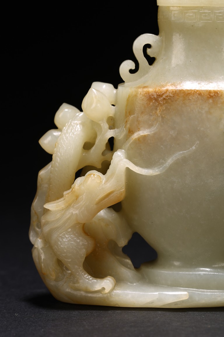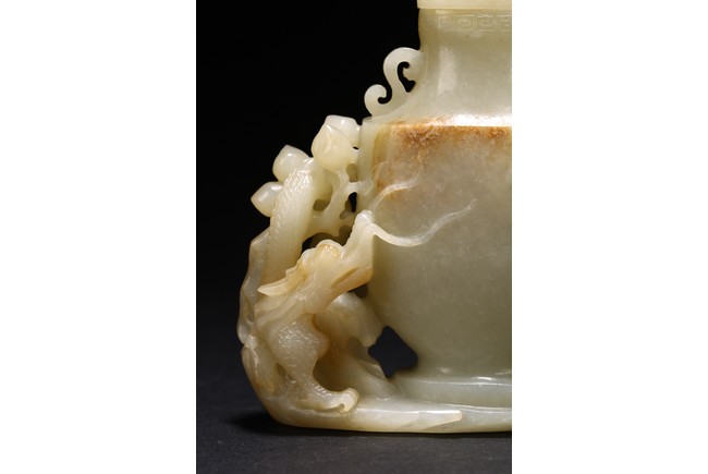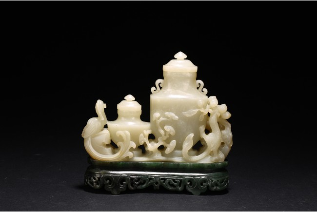 Qing Dynasty period. Carved in the form of one large and one small vases linked together, flanked by a dragon on one side and a crane on the other, all supported on spinach green jade stand.