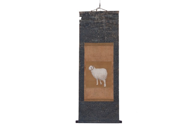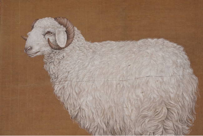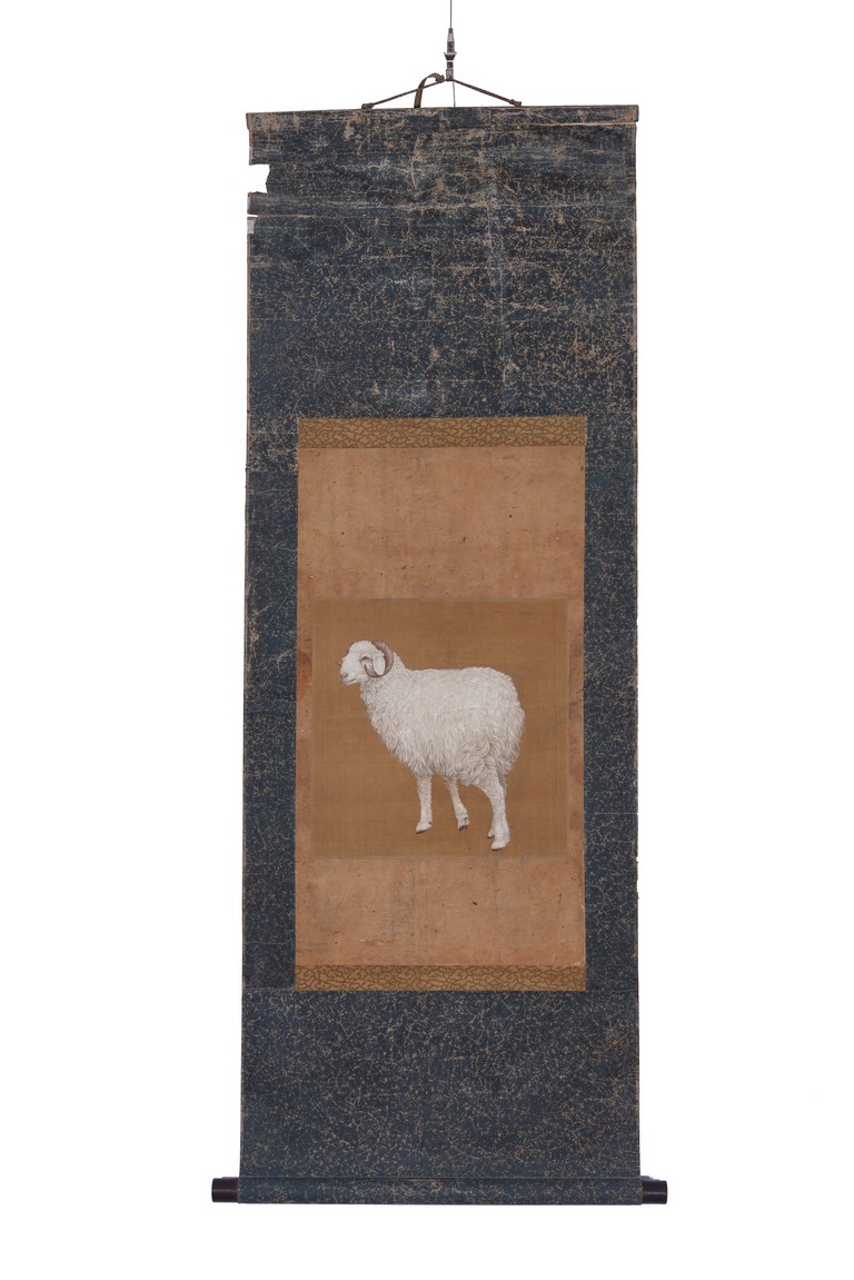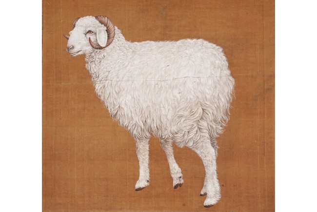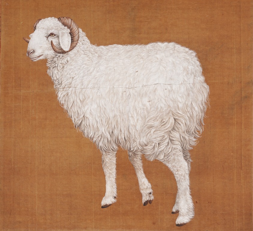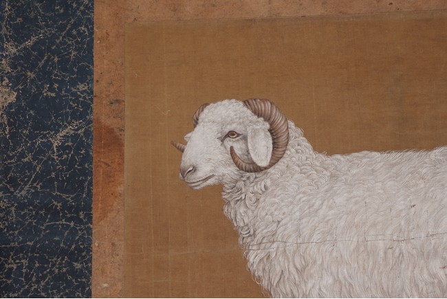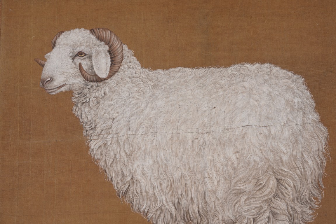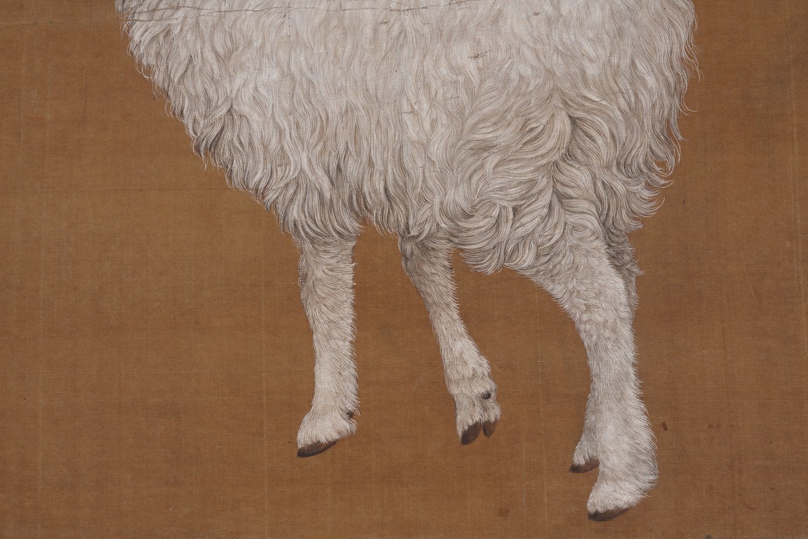 Qing Dynasty period. Chinese color and ink on silk. Sheep. Hanging scroll. Anonymous.