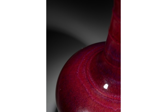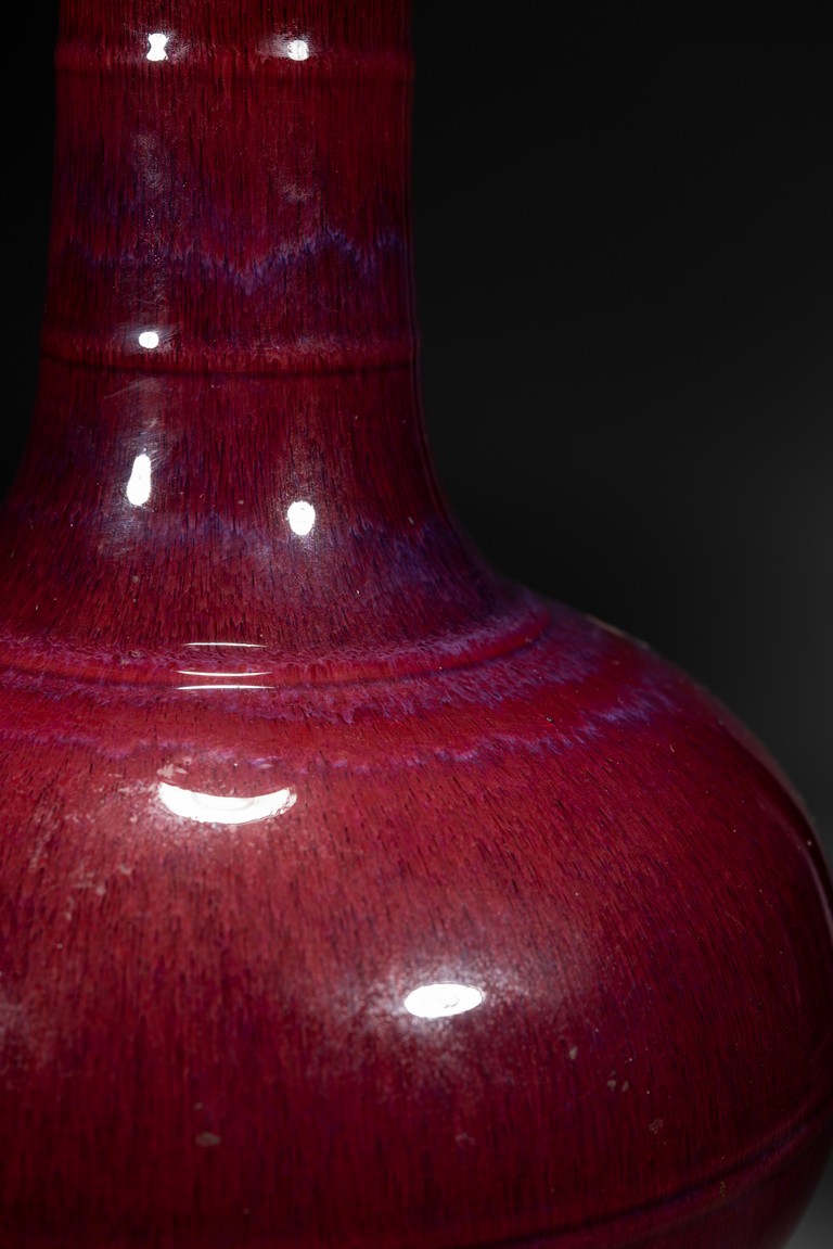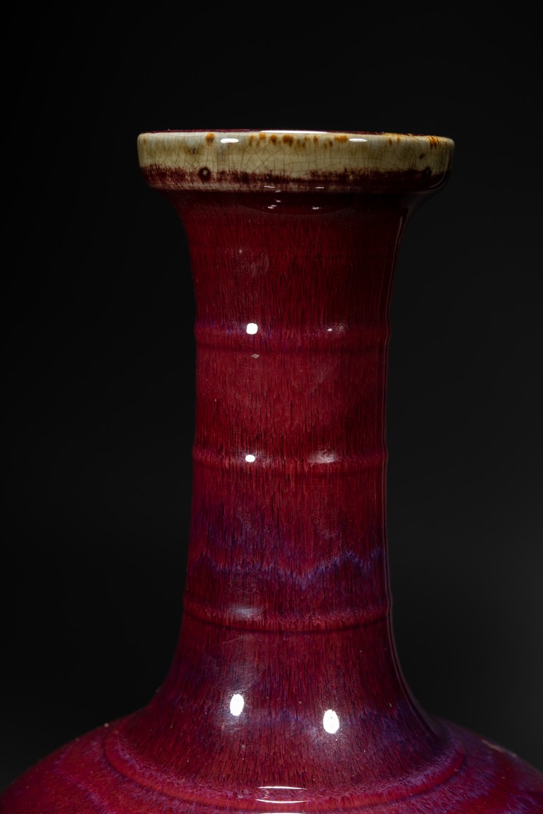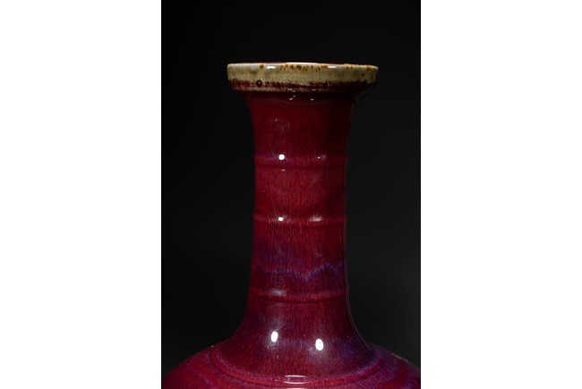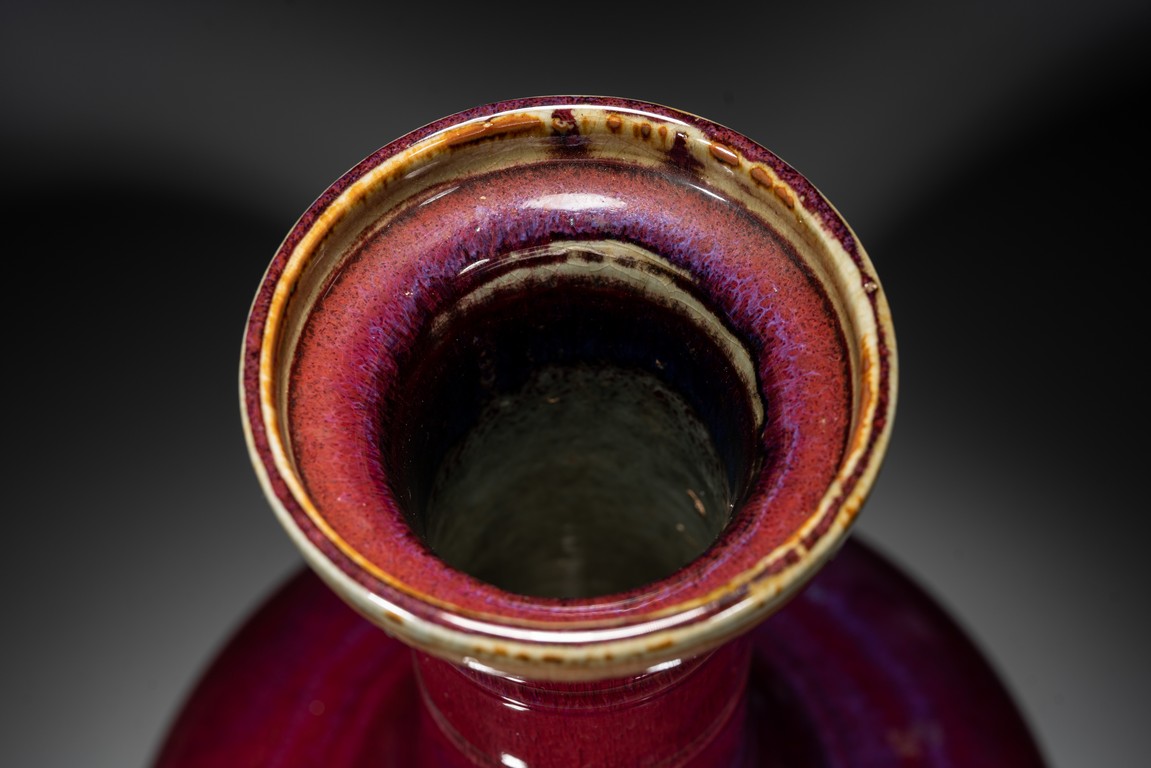 此瓶小盤口微敞,長頸,鼓腹,圈足,頸部及腹部飾簡約弦紋裝飾。造型別致俊秀,飽滿端莊。通體滿施窯變釉,口沿略帶燈草品,以紅釉為主,間摻藍紫諸色,兩色暈散交融,色彩斑斕,意趣盎然,釉面晶瑩亮潤,艷麗璀璨。整體器形周正,胎質細膩堅實,釉面潔凈,包漿自然,保存完好,收藏佳器,十分難得。