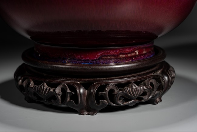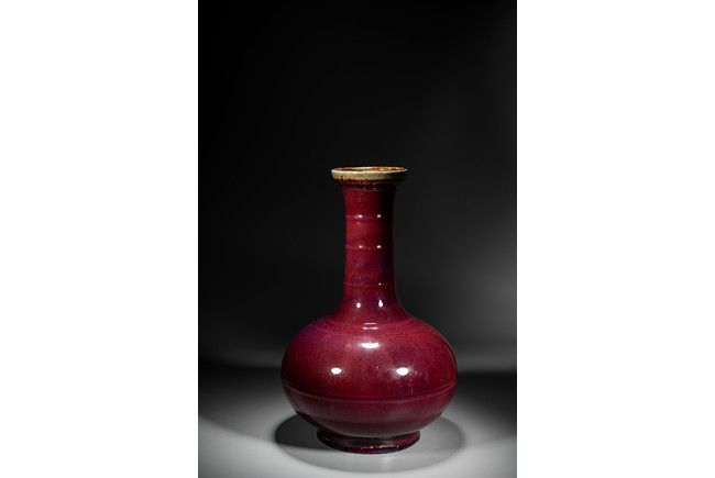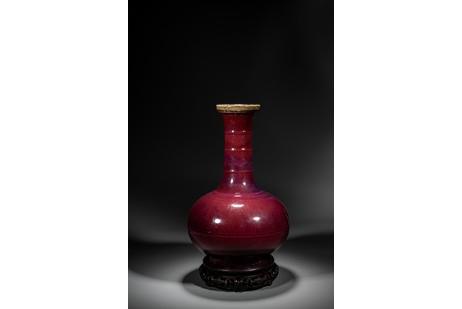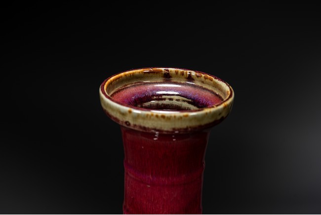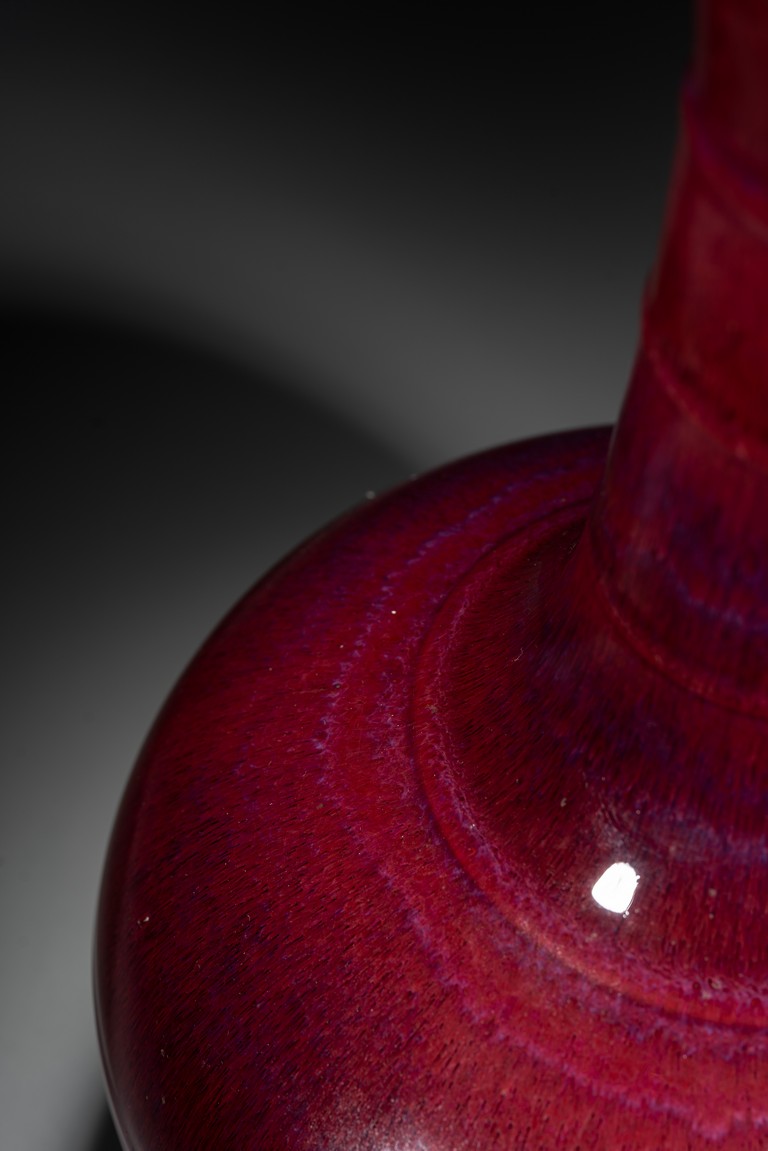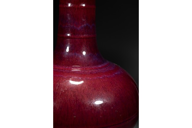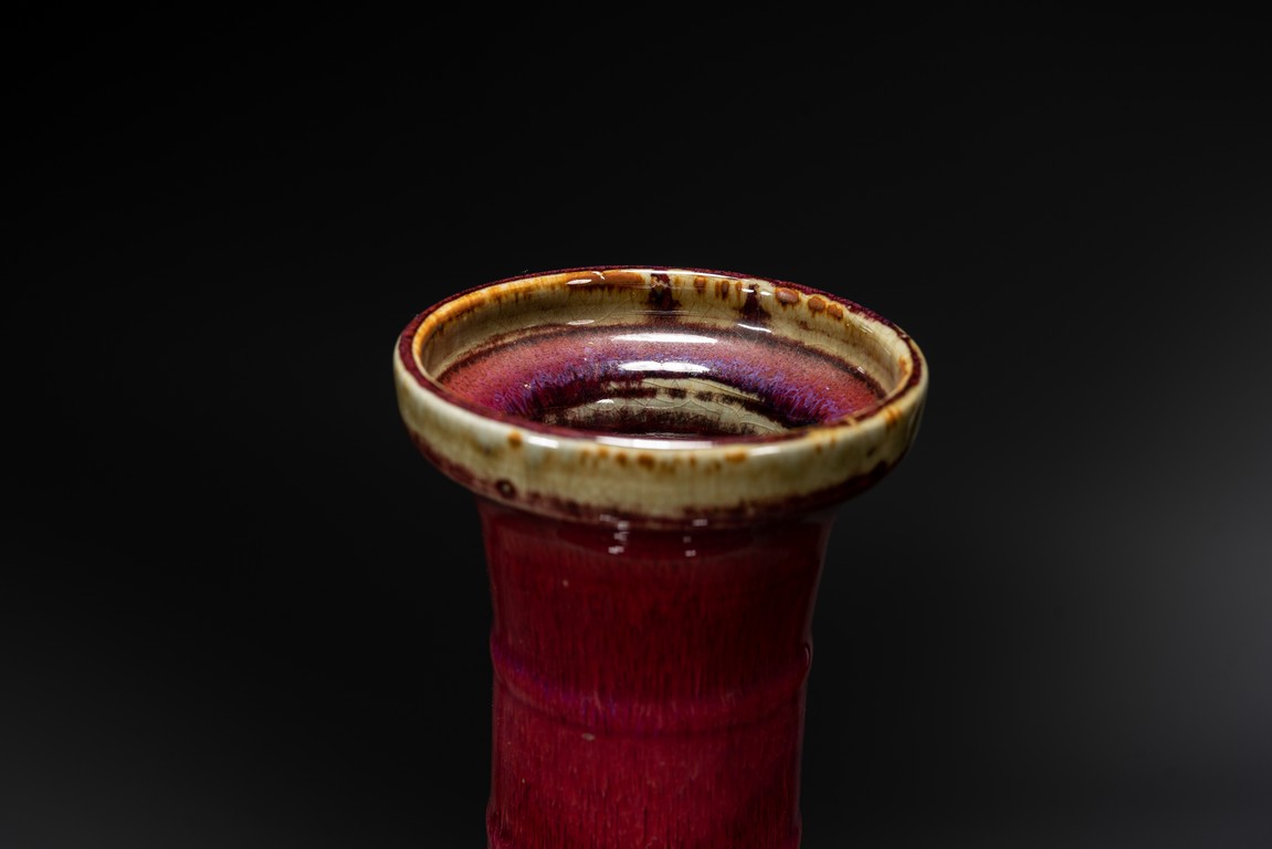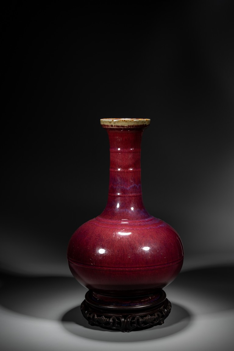 此瓶小盤口微敞,長頸,鼓腹,圈足,頸部及腹部飾簡約弦紋裝飾。造型別致俊秀,飽滿端莊。通體滿施窯變釉,口沿略帶燈草品,以紅釉為主,間摻藍紫諸色,兩色暈散交融,色彩斑斕,意趣盎然,釉面晶瑩亮潤,艷麗璀璨。整體器形周正,胎質細膩堅實,釉面潔凈,包漿自然,保存完好,收藏佳器,十分難得。