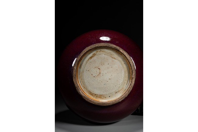 Qing Dynasty period. The slightly compressed globular body with moulded horizontal ribs around the waist and shoulder, covered overall in a flambe glaze of deep reddish-purple tone, the foot unglazed exposing the biscuit, the base covered in a bluish beige glaze.