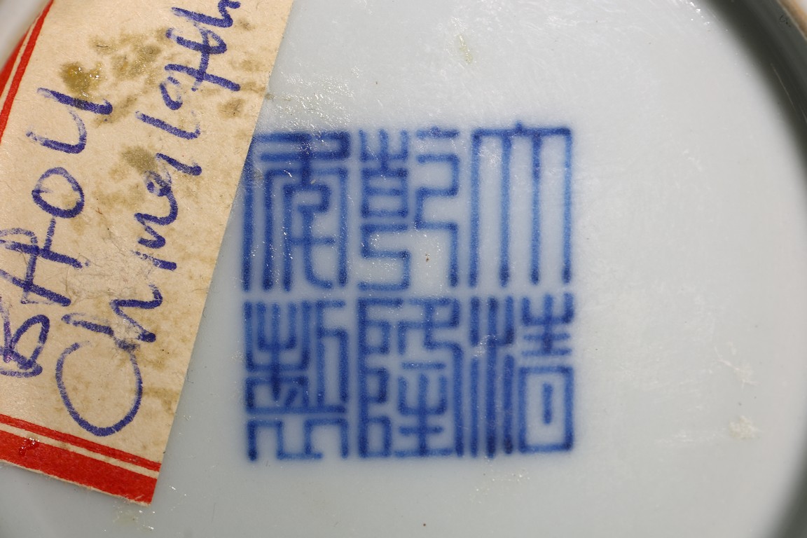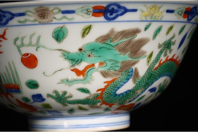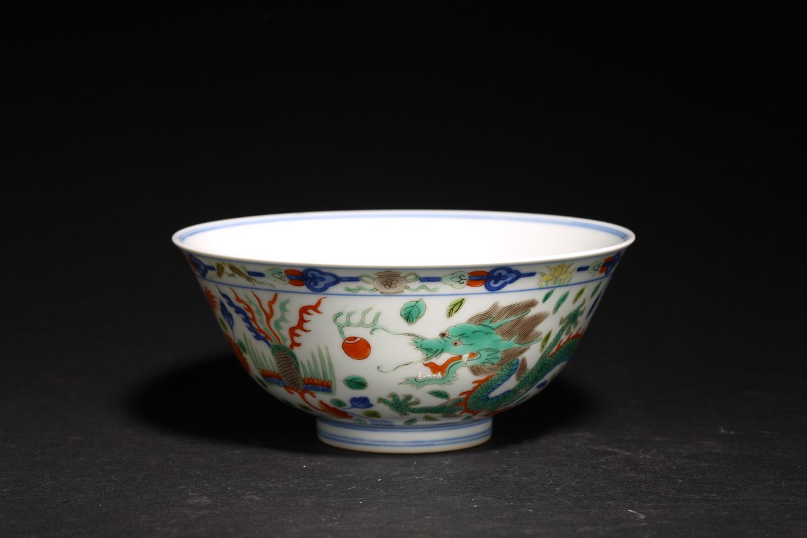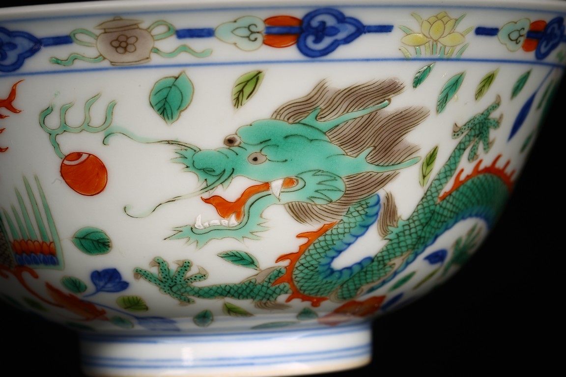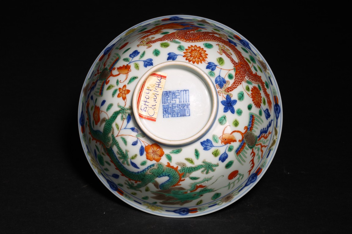 Qing Dynasty period. The bowl is finely decorated to the exterior with two dragons amidst flower sprays chasing flaming pearls, divided by two descending phoenixes, below a narrow band of the Eight Buddhist Emblems interspersed with ruyi heads. The interior is decorated with a dragon chasing a flaming pearl, base inscribed with six character mark.