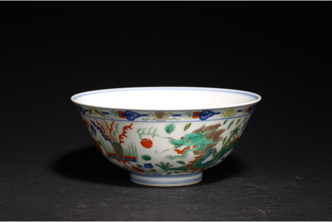 此碗胎質細膩,釉質潤澤,釉面勻凈,侈口,曲腹較深,圈足。碗心以紅彩繪五爪龍戲寶珠圖紋,碗外壁口沿繪“八寶紋”,主體繪“青花五彩雙龍雙鳳紋”一周,基本呈中心對稱,雙龍主體顏色分別以紅、綠彩繪出,雙鳳振翅鳳首朝下,龍鳳身邊裝飾以纏枝花卉,精美絕倫。龍鳳成雙成對,寓意吉祥。“大清乾隆年制”款識。