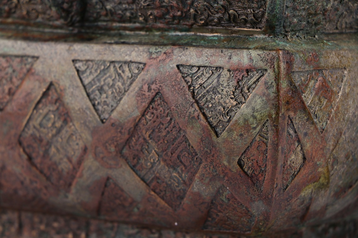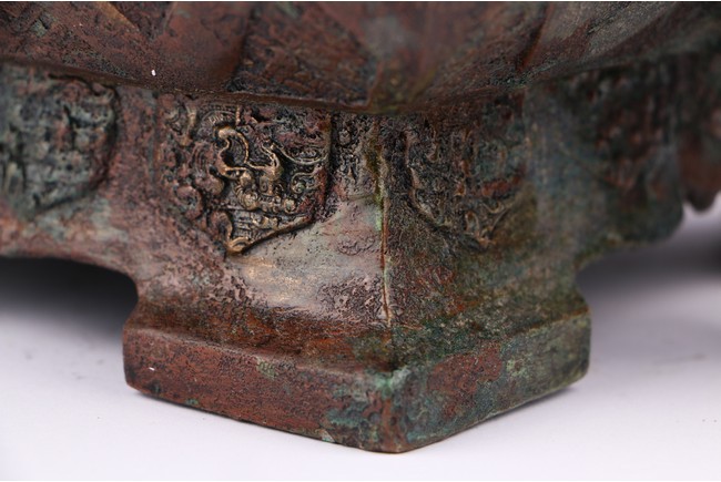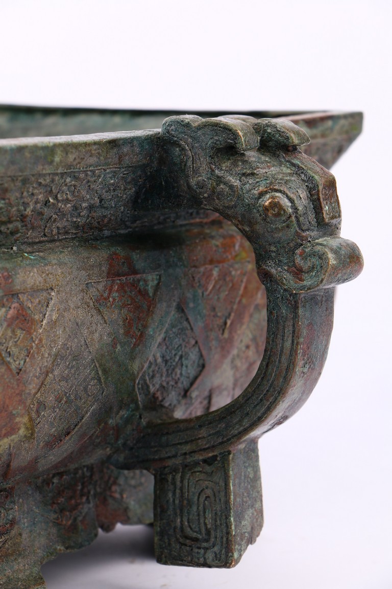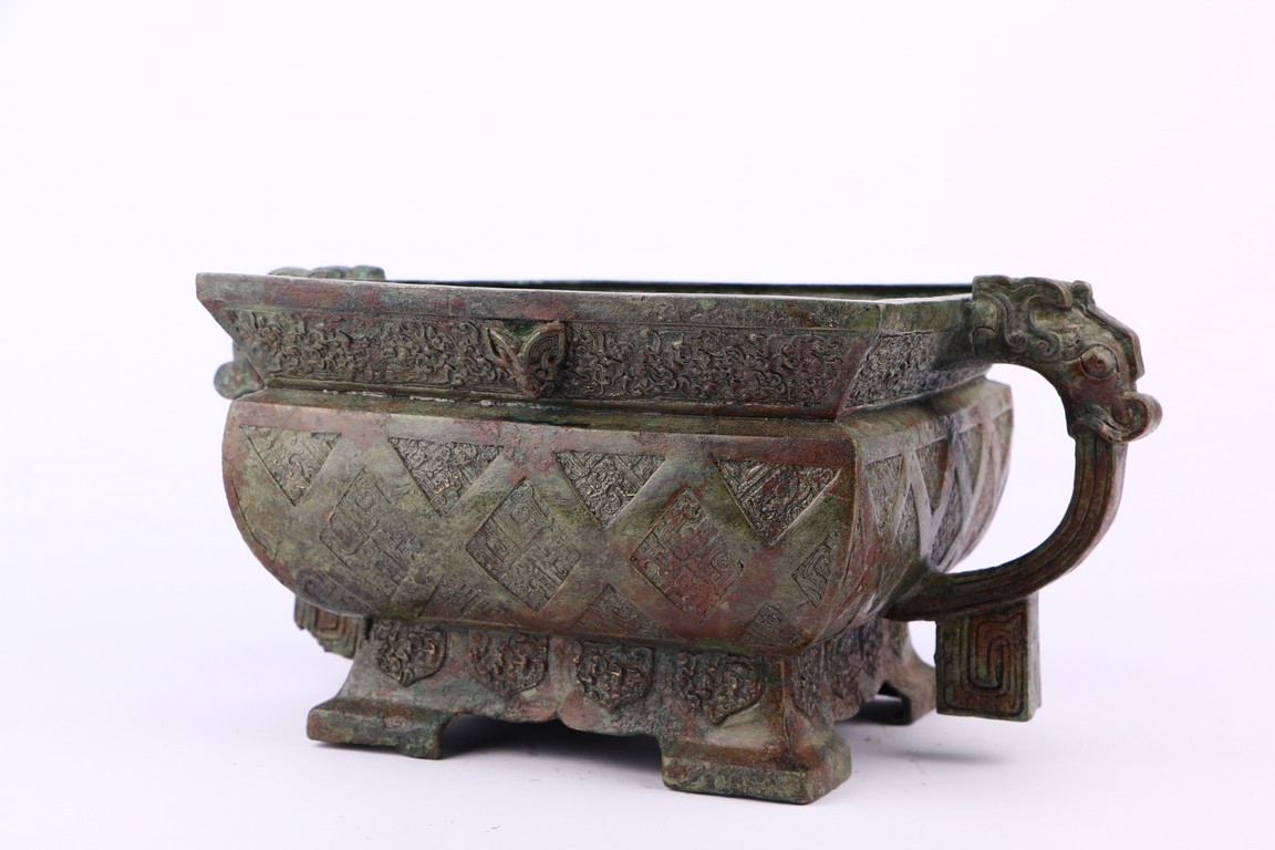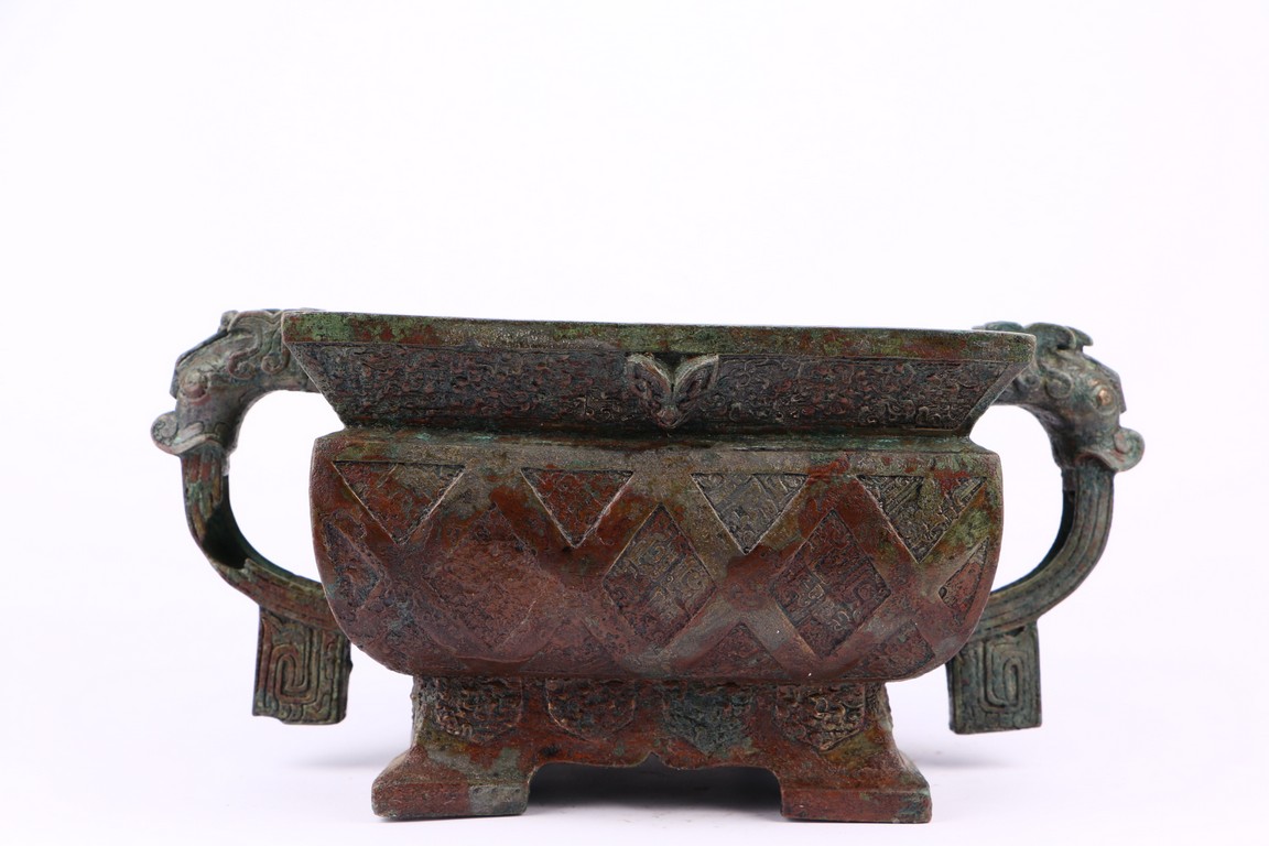 此爐方口折唇,雙獸耳,鼓腹下收,下承四微撇足。環頸飾以繁覆紋飾,中部飾一羊頭,制作精巧。器身紋飾分布均勻,立體清晰,分布密而不亂,以當時注模翻印技術來看,可謂耗時耗工之雕琢。整體銹色分布均勻,銅質優良,銅色青綠,紋飾滿工,瑰麗華美,彰顯雍貴。來源:紐約重要私人收藏 Provenance: Property from an important private collection, New York