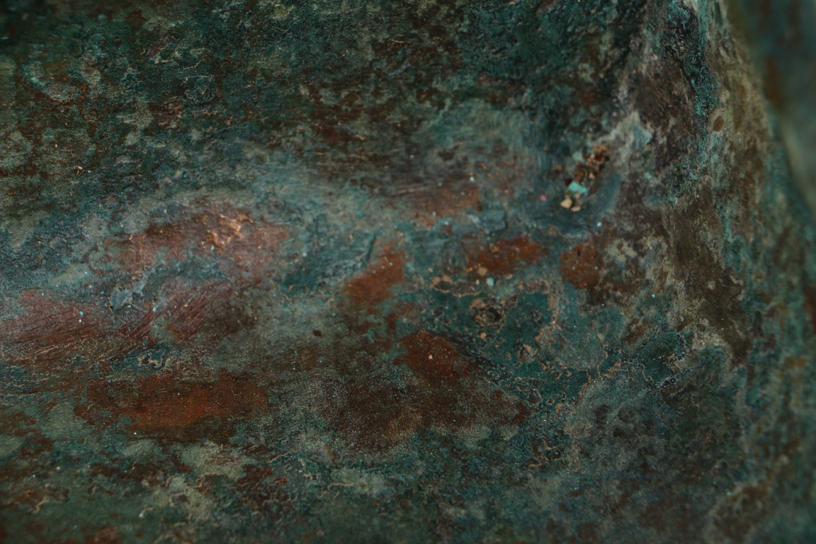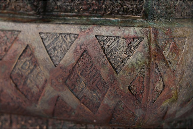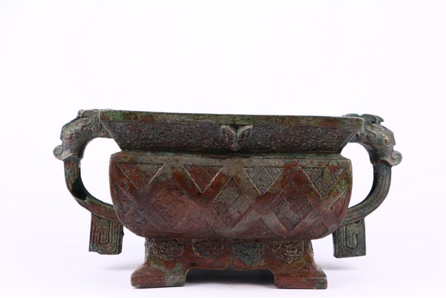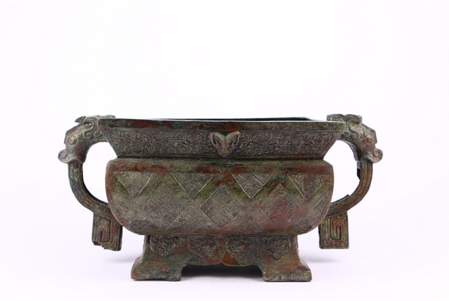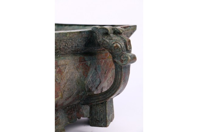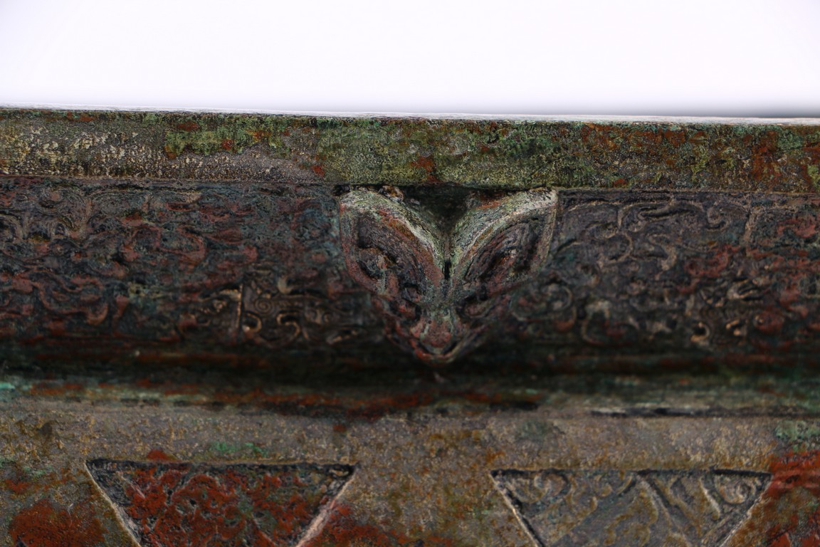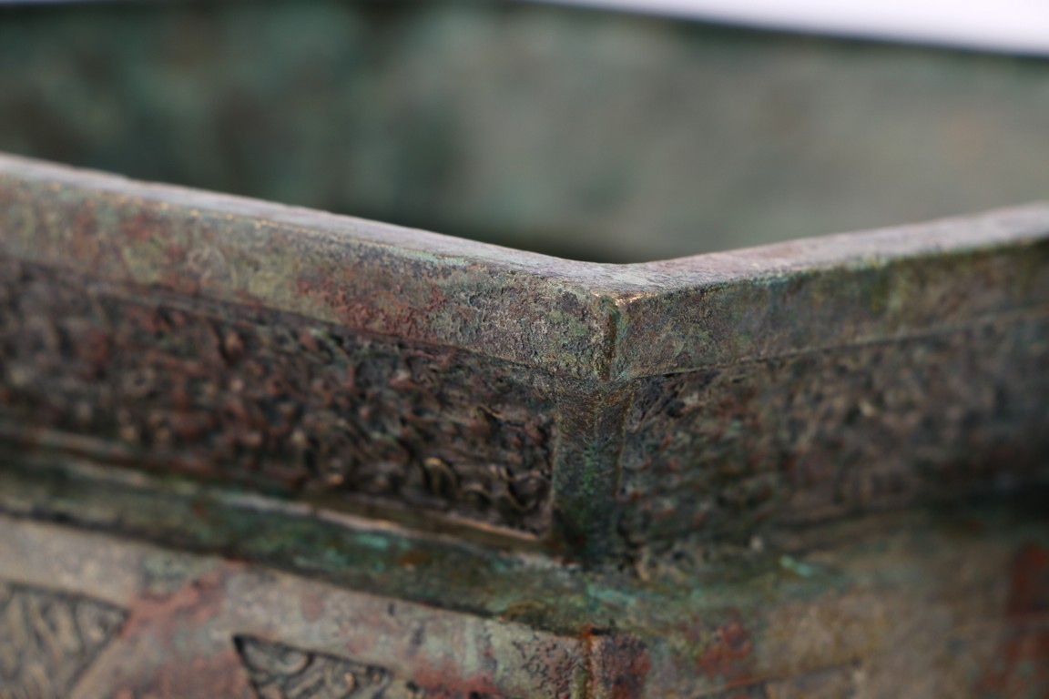 此爐方口折唇,雙獸耳,鼓腹下收,下承四微撇足。環頸飾以繁覆紋飾,中部飾一羊頭,制作精巧。器身紋飾分布均勻,立體清晰,分布密而不亂,以當時注模翻印技術來看,可謂耗時耗工之雕琢。整體銹色分布均勻,銅質優良,銅色青綠,紋飾滿工,瑰麗華美,彰顯雍貴。來源:紐約重要私人收藏 Provenance: Property from an important private collection, New York