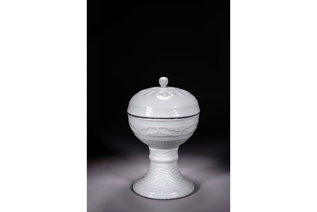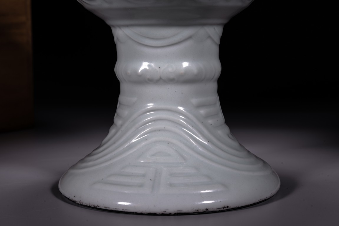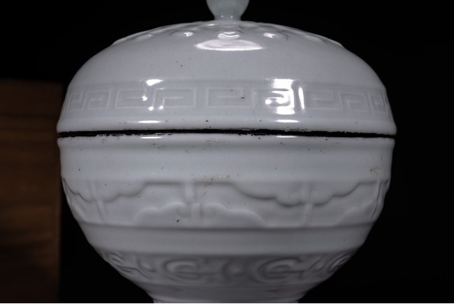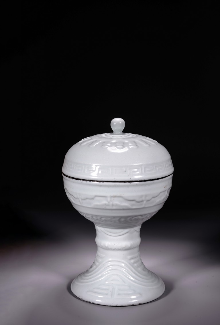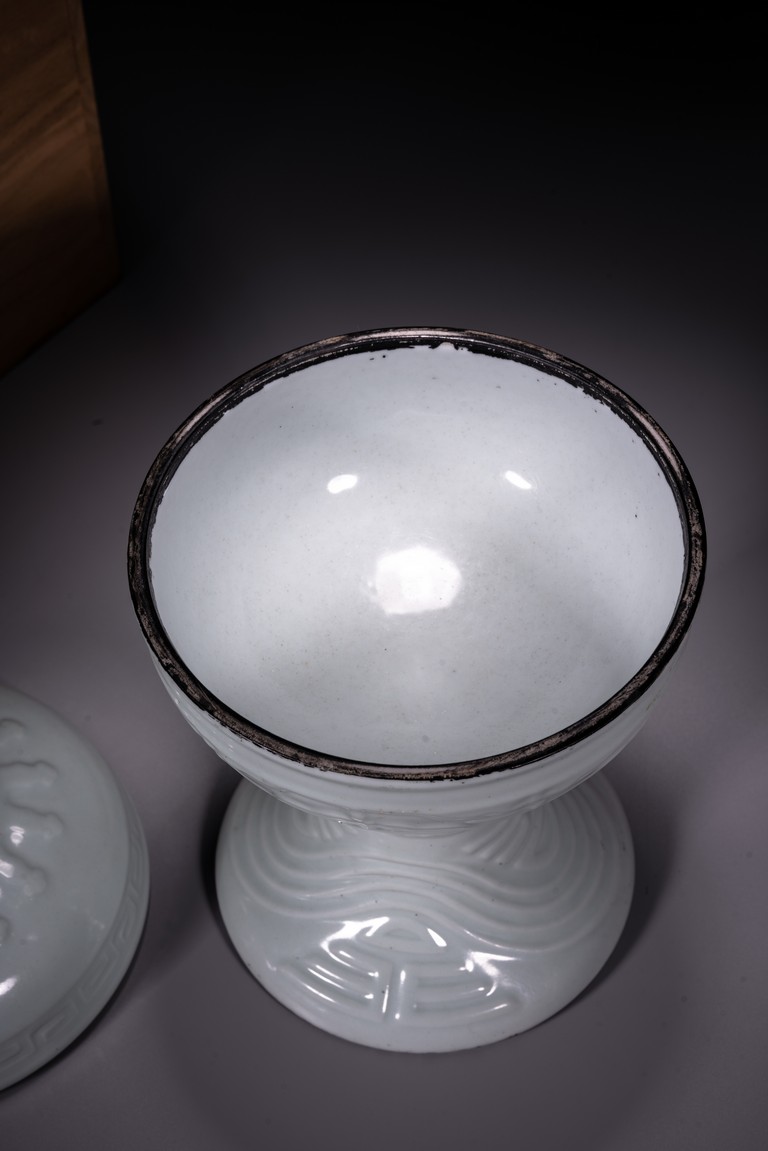 此豆有蓋,為半球形寶珠紐蓋,子口。豆身半球形,與蓋扣合似一球。竹節狀柄,喇叭形外撇高圈足。器表面以模印手法裝飾多層紋飾,器蓋有蓮瓣紋,回紋等,器身自上而下有正反如意雲紋頭紋十組,正反斐紋四組及弧線紋等。紋飾古雅。通體施白釉。豆為食器,後发展為禮器。此豆整體色澤莊重富貴,器型周正,胎質細膩,包漿自然,保存完好,是光緒官窯專供宮廷禮儀場合使用而生產的重要器具