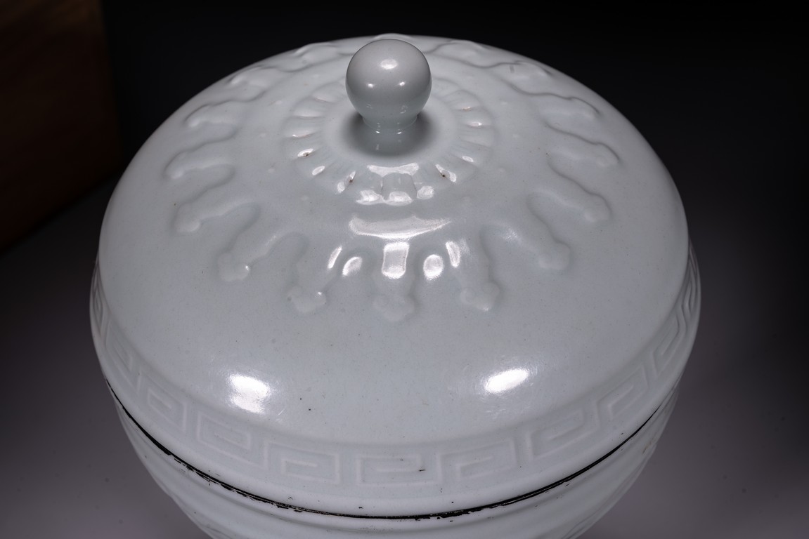 Qing Dynasty period. The rounded bowl supported on a columnar base encircled with a raised band and terminating in a splayed pedestal foot, surmounted by a fitted domed cover with globular knob, moulded with bands of archaistic design in shallow relief, the interior of the base incised with a reign mark