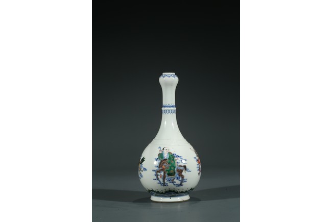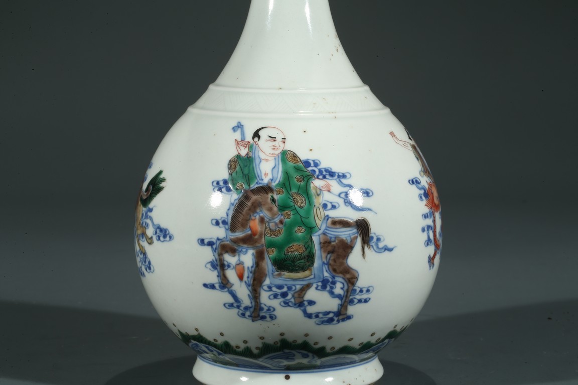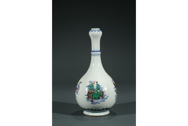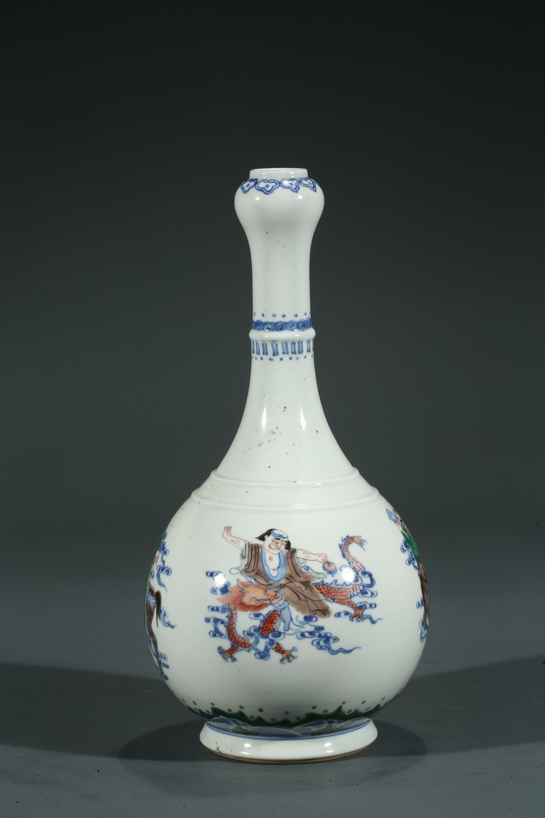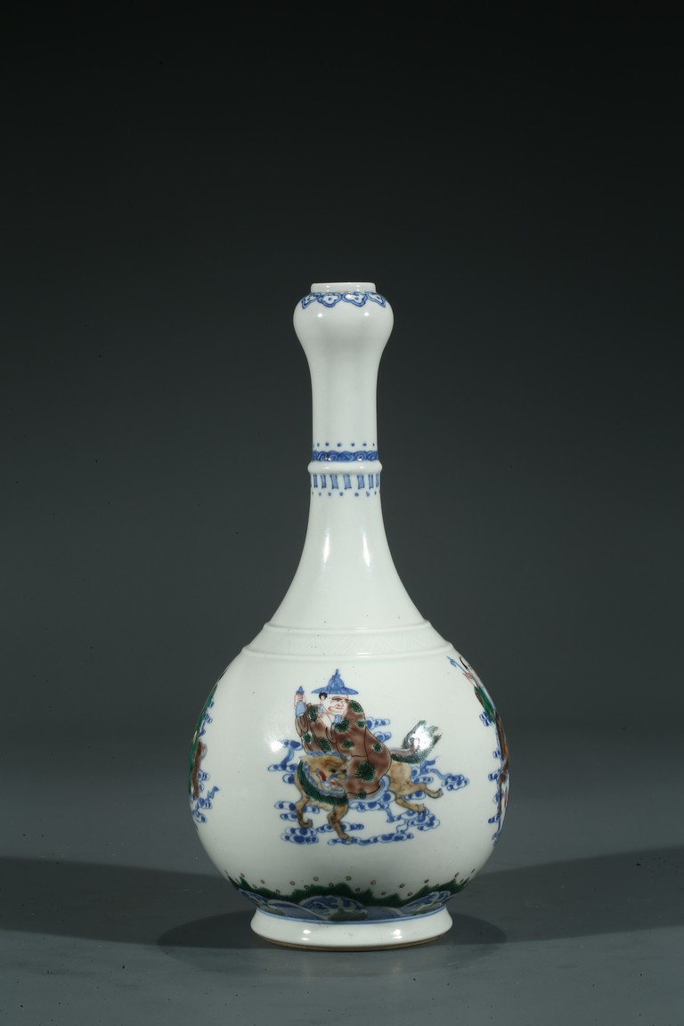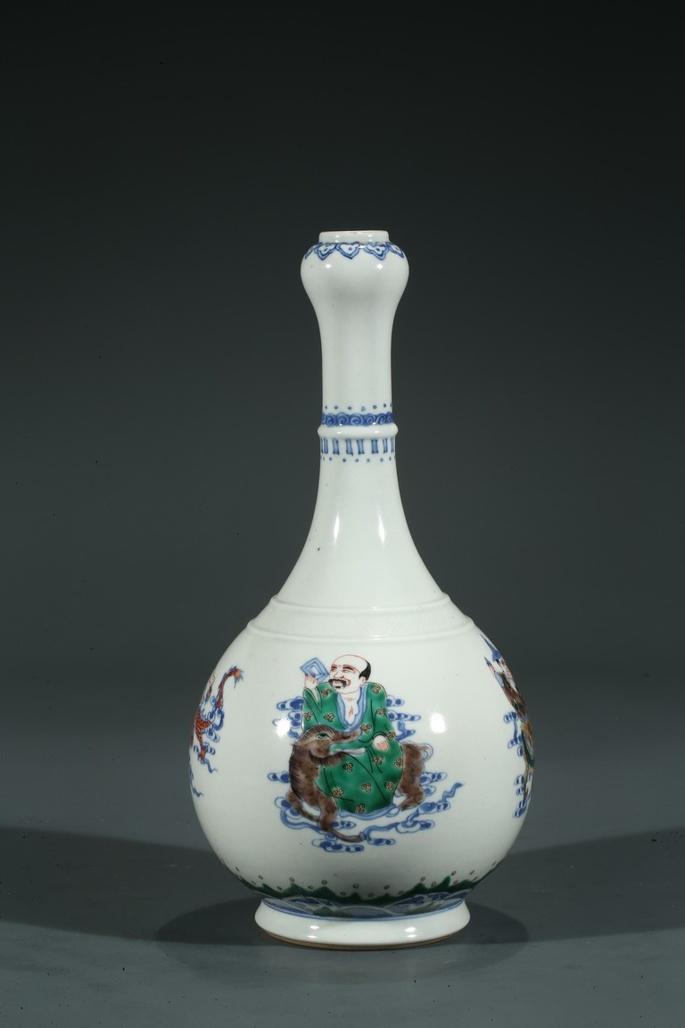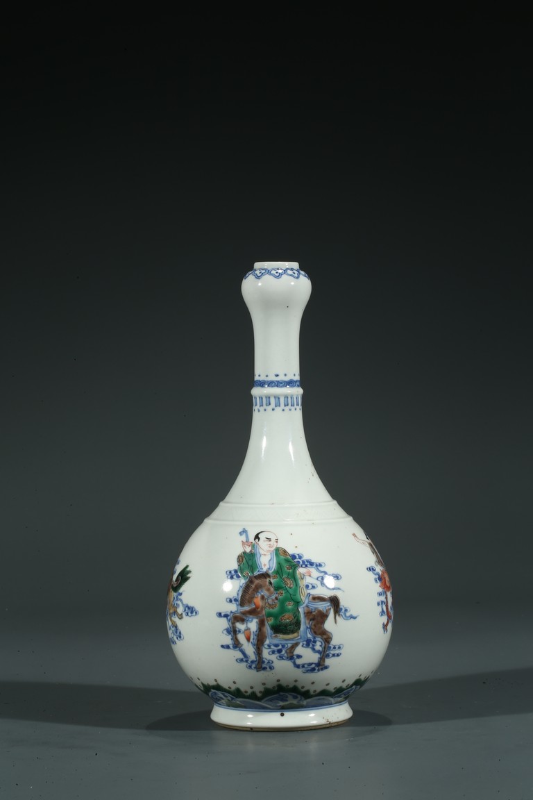 此瓶長頸、削肩、圓腹、圈足,瓶口似蒜頭而得名“蒜頭瓶”。頸部裝飾一道留白凸起弦紋,為修長的造型平添一份韻律之美。器身青花五彩繪“如意雲紋”“卷雲紋”,腹部人物神態各異,形象生動。