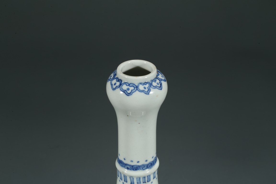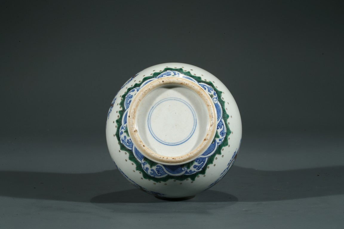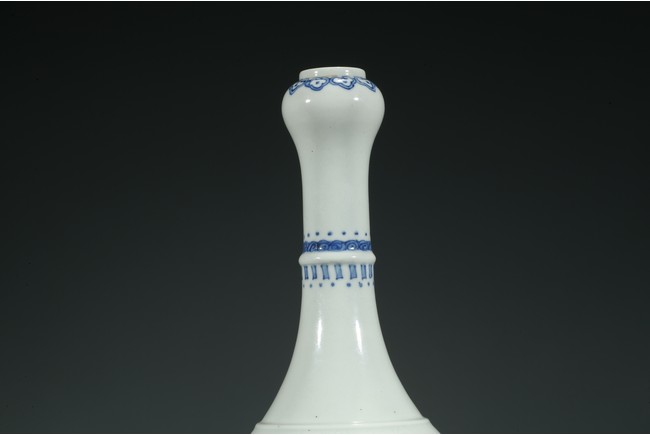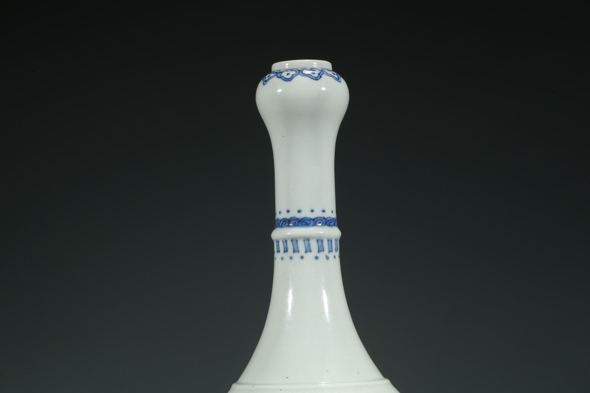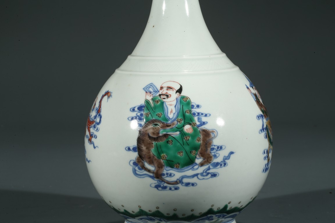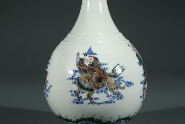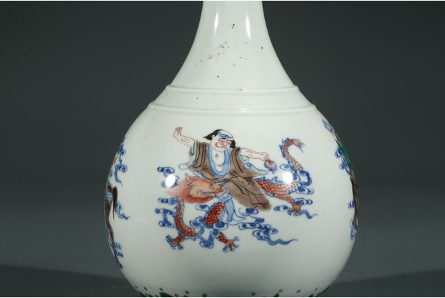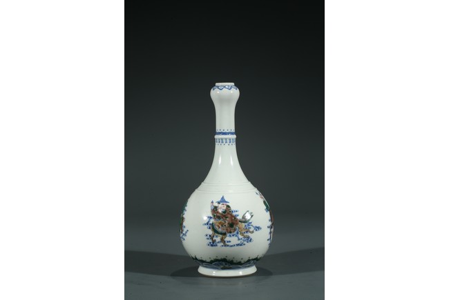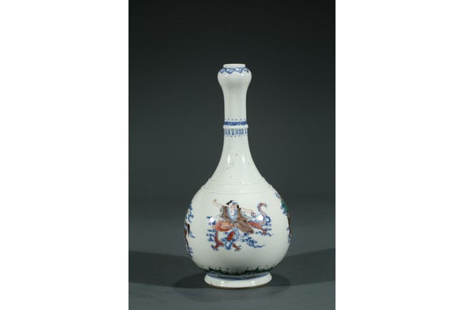 此瓶長頸、削肩、圓腹、圈足,瓶口似蒜頭而得名“蒜頭瓶”。頸部裝飾一道留白凸起弦紋,為修長的造型平添一份韻律之美。器身青花五彩繪“如意雲紋”“卷雲紋”,腹部人物神態各異,形象生動。