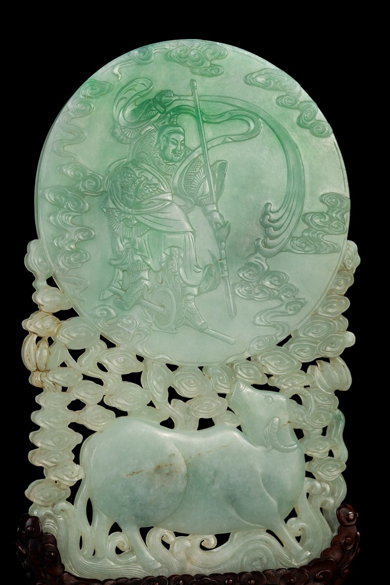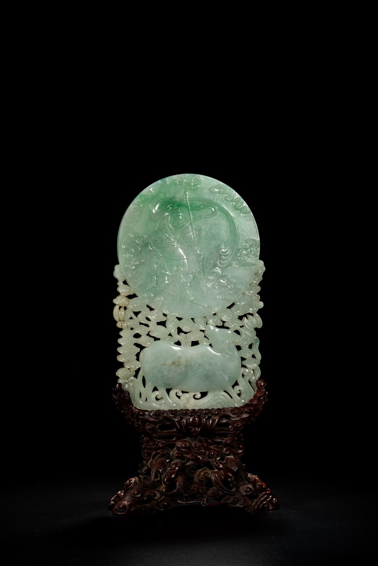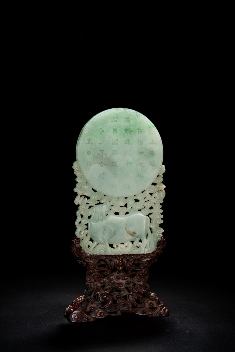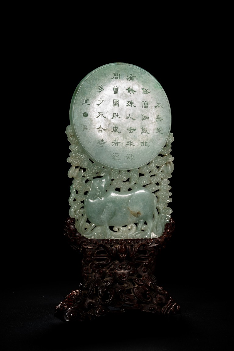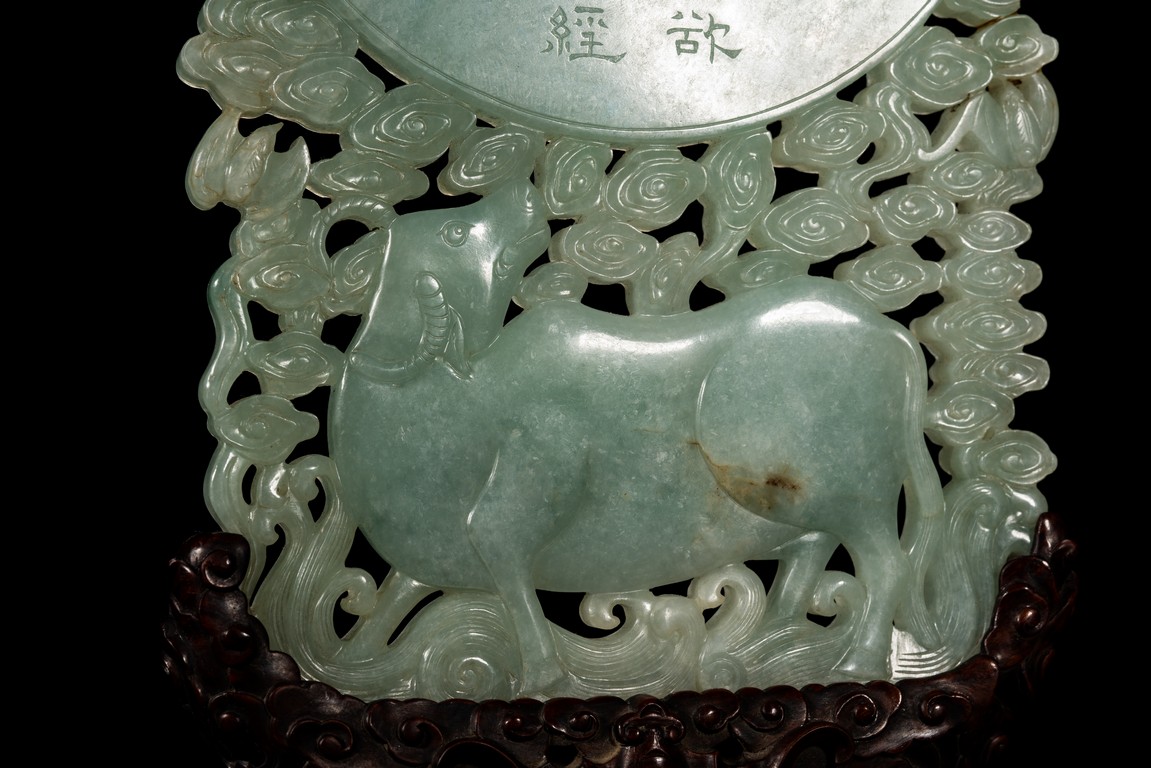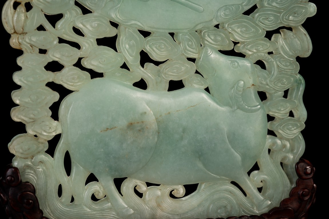 此插屏材料碩大,色澤溫潤翠綠,以犀牛望月為題材,采用漏雕、透雕、淺刻等技法,使故事情節栩栩如生,古意悠悠,令人神往,插屏刀法深峻有力,細膩流暢,布局景物如畫,質料均佳,包漿潤澤,實為雋品。且有原配木座相輔,若置於書齋,可鑒詩意之美,亦得清賞之樂。來源:加拿大溫哥華私人藏家收藏 Provenance: Private collection, Vancouver, Canada