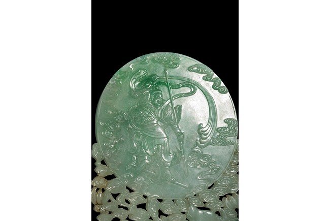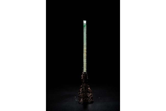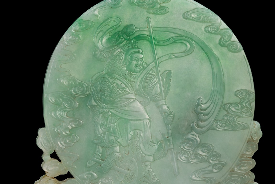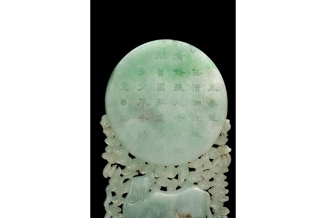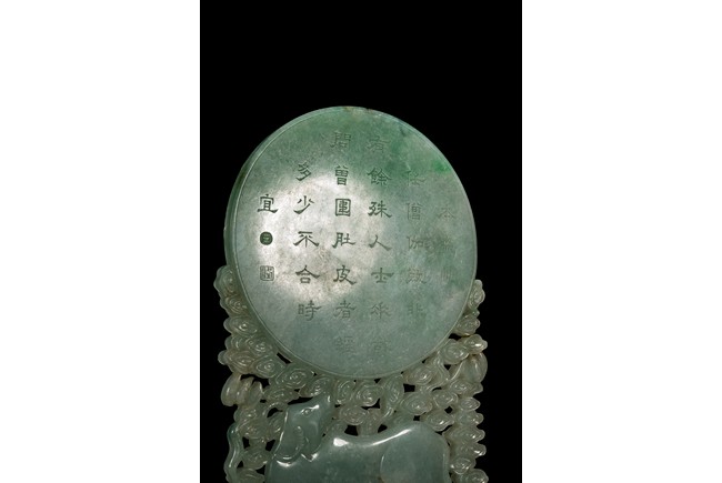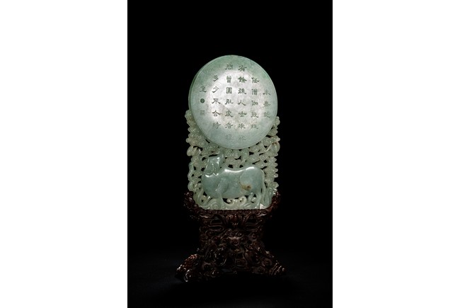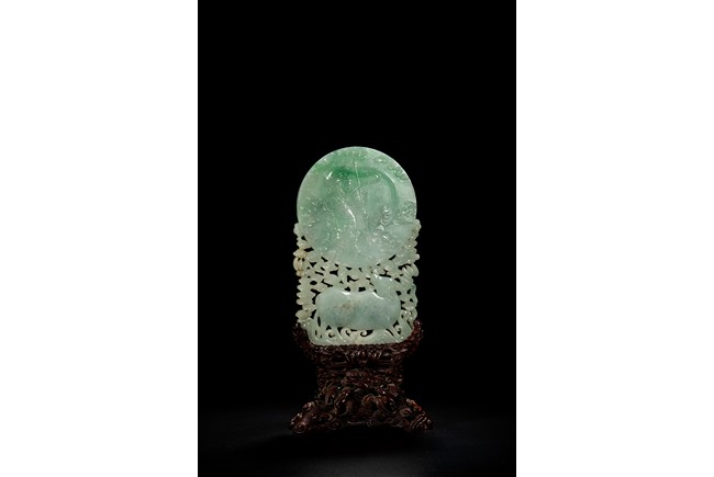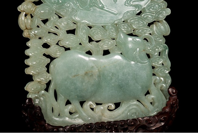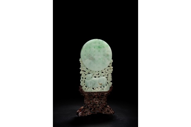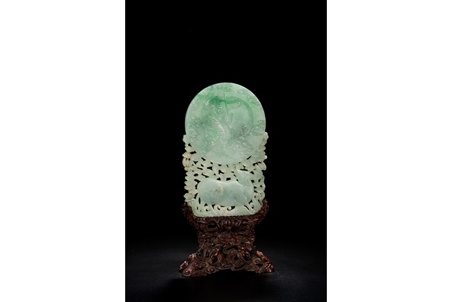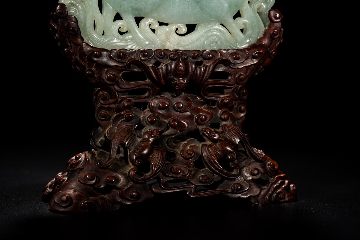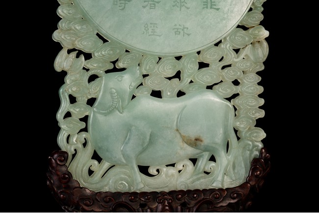 此插屏材料碩大,色澤溫潤翠綠,以犀牛望月為題材,采用漏雕、透雕、淺刻等技法,使故事情節栩栩如生,古意悠悠,令人神往,插屏刀法深峻有力,細膩流暢,布局景物如畫,質料均佳,包漿潤澤,實為雋品。且有原配木座相輔,若置於書齋,可鑒詩意之美,亦得清賞之樂。來源:加拿大溫哥華私人藏家收藏 Provenance: Private collection, Vancouver, Canada