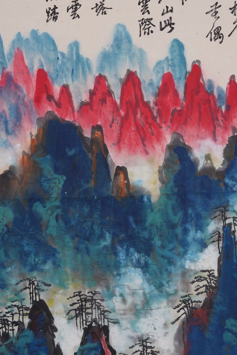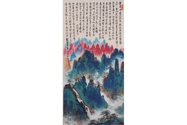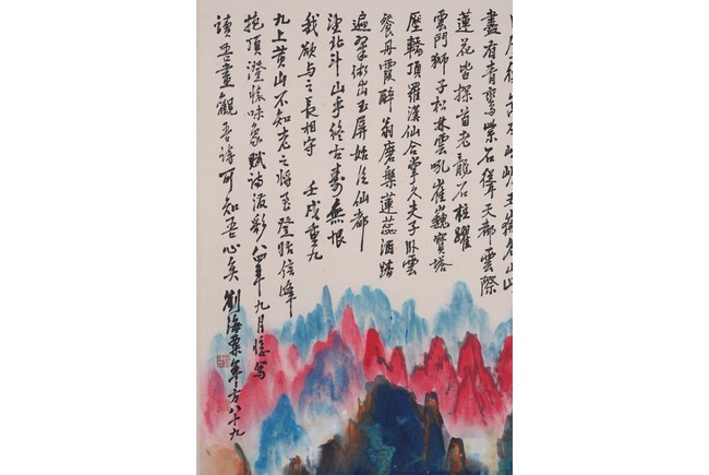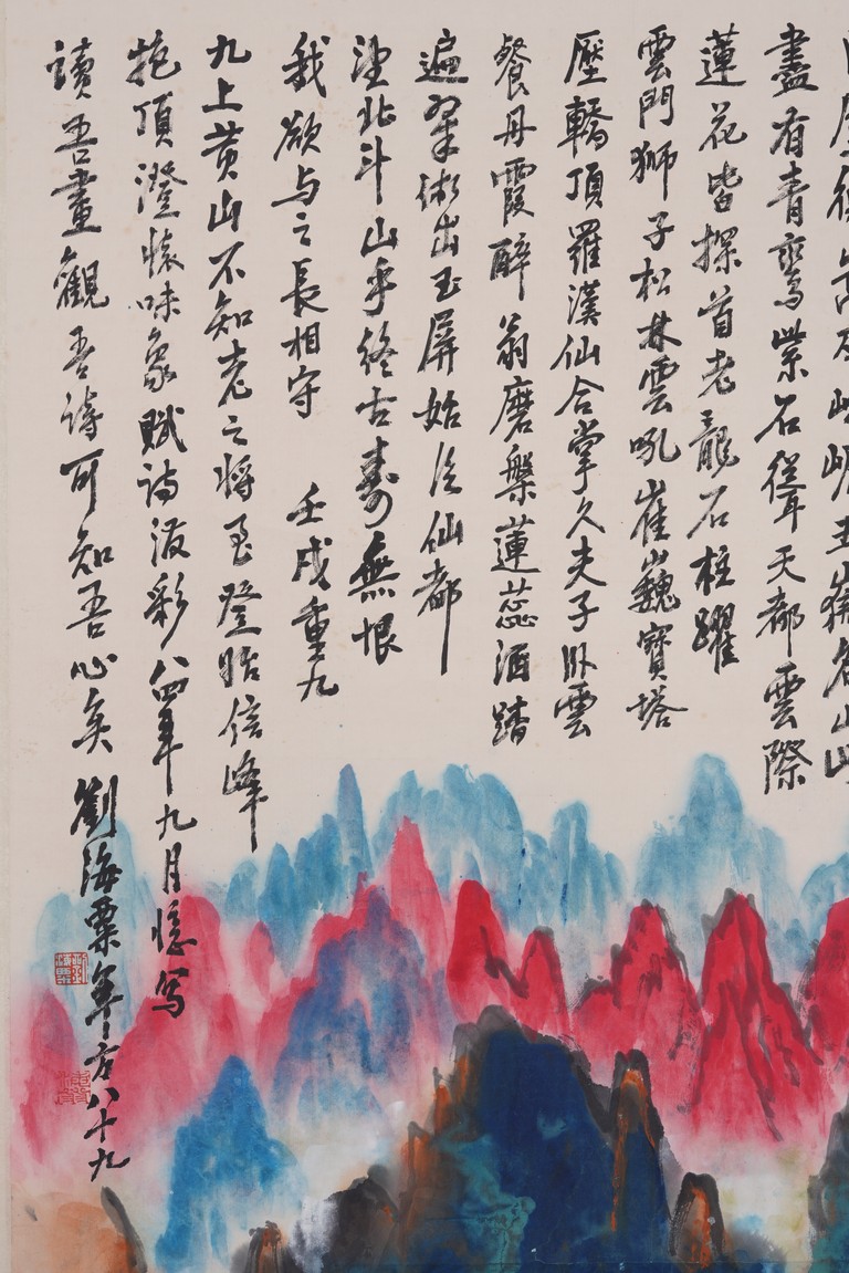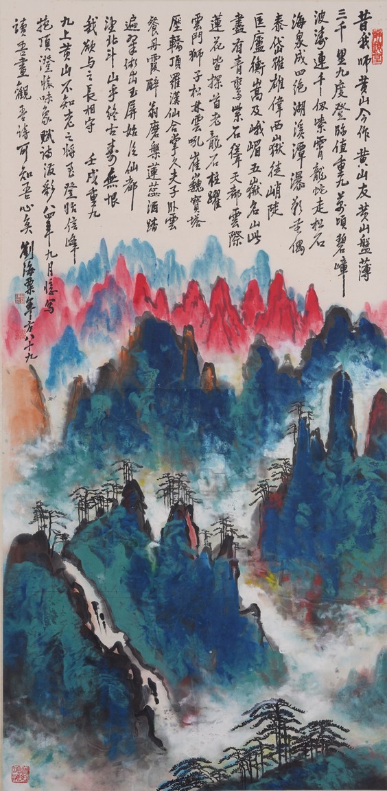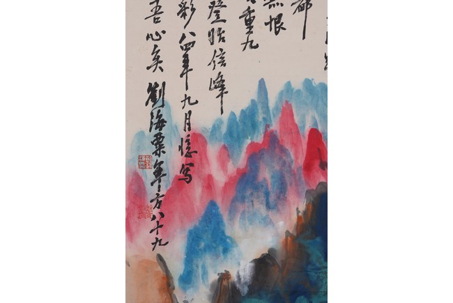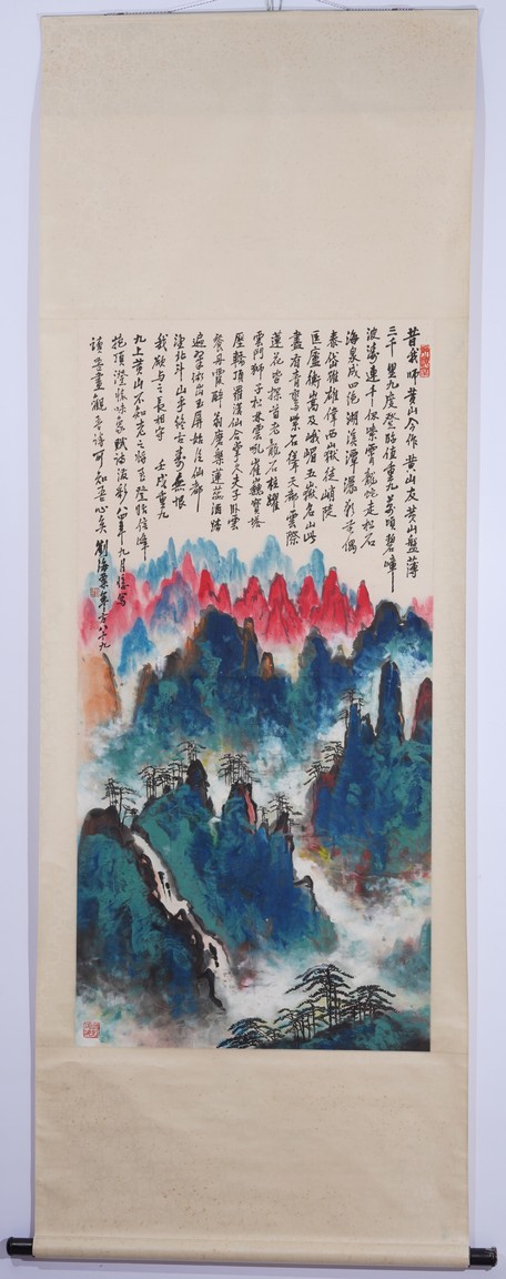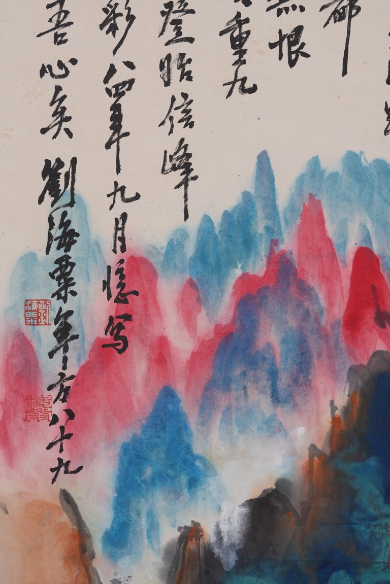 Color and ink on paper. Landscape. Hanging scroll. Inscribed and signed Liu Haisu, with three seal marks of the artist.