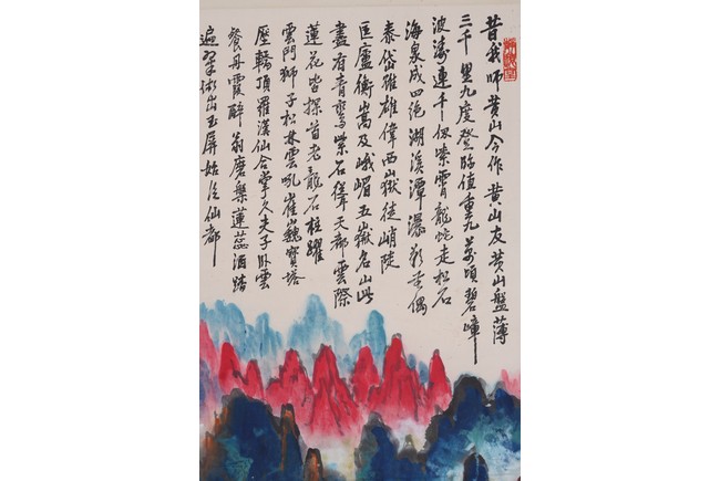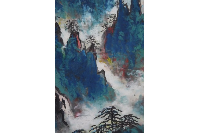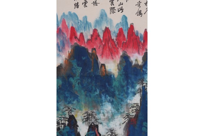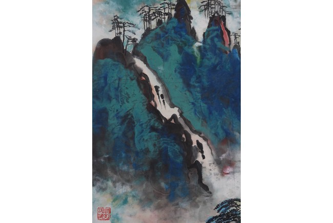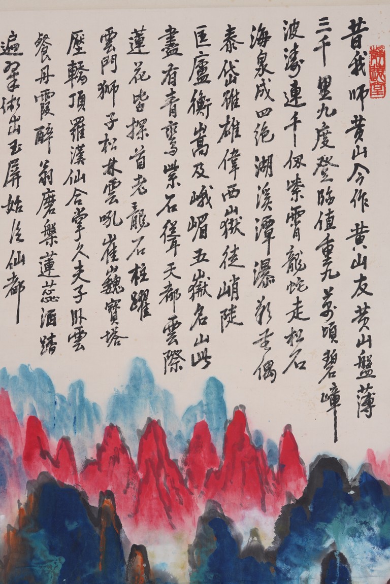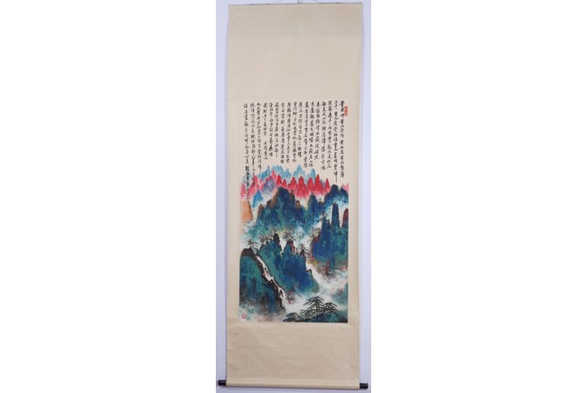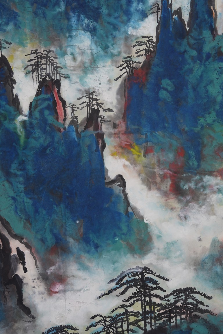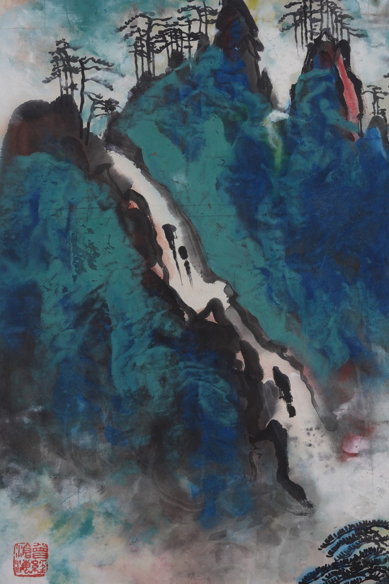 Color and ink on paper. Landscape. Hanging scroll. Inscribed and signed Liu Haisu, with three seal marks of the artist.