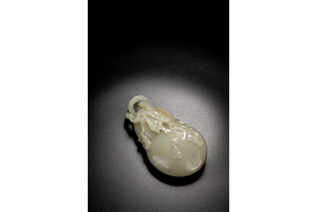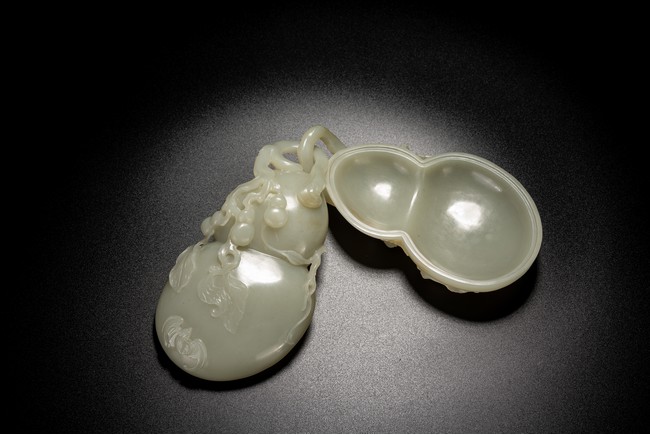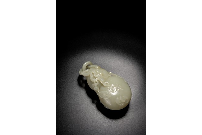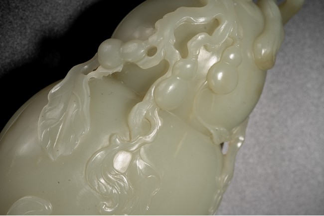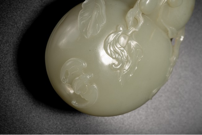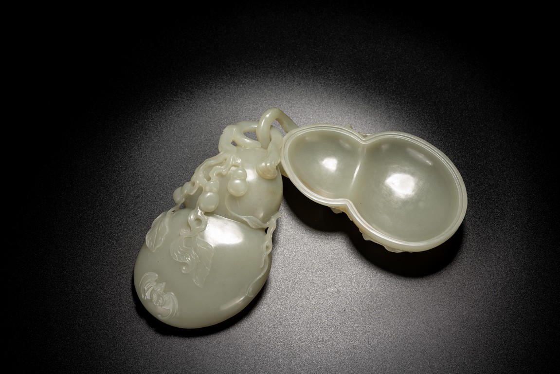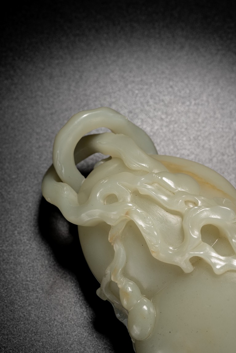 Qing Dynasty period. Of double gourd form, the exterior carved in relief with smaller leafy gourds vines and bat, each half interlocked at the top.