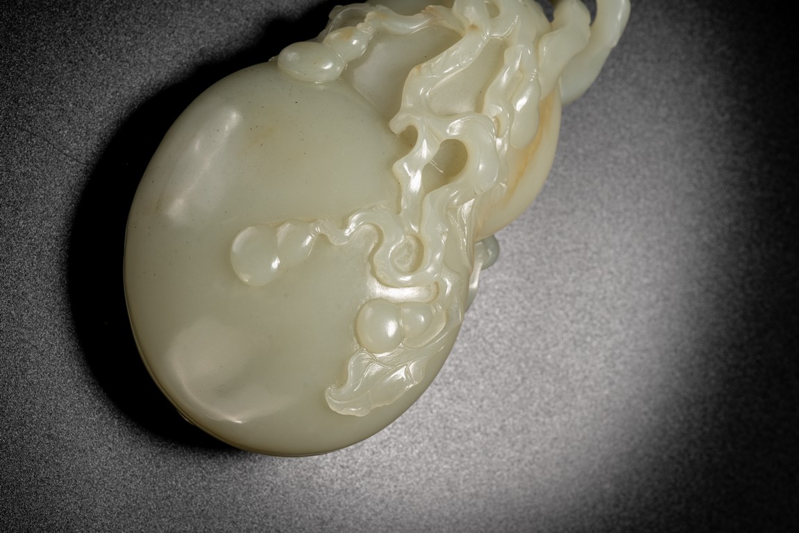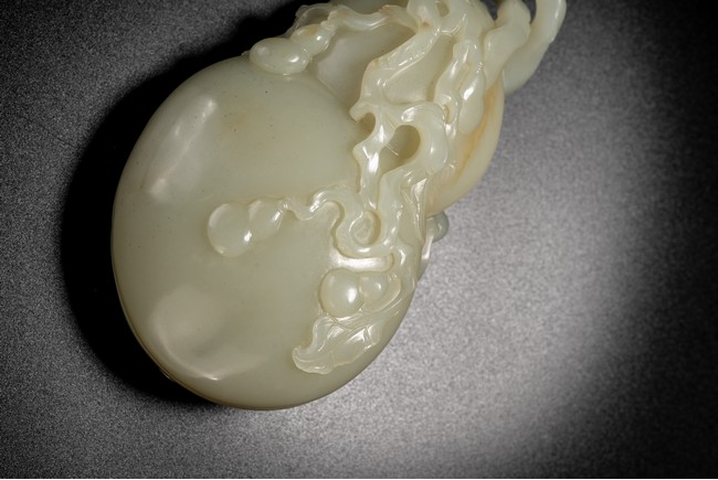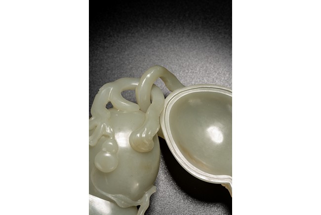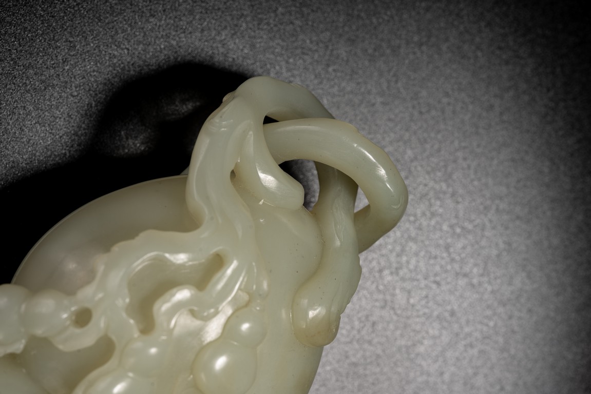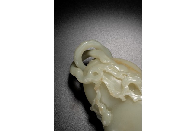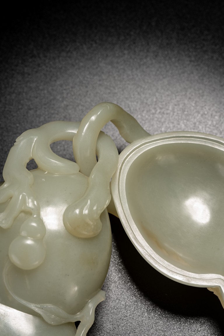 Qing Dynasty period. Of double gourd form, the exterior carved in relief with smaller leafy gourds vines and bat, each half interlocked at the top.