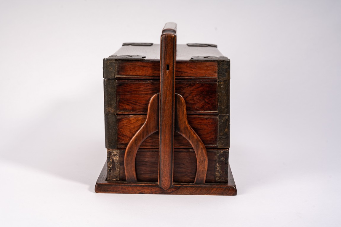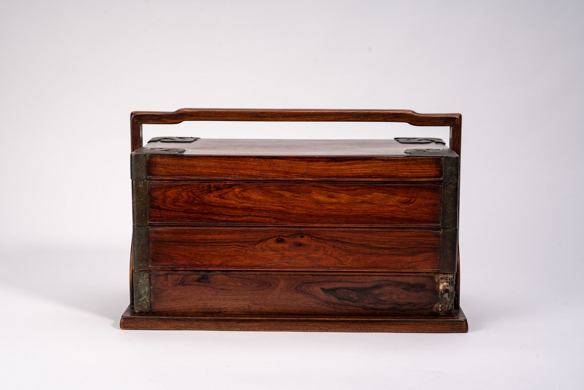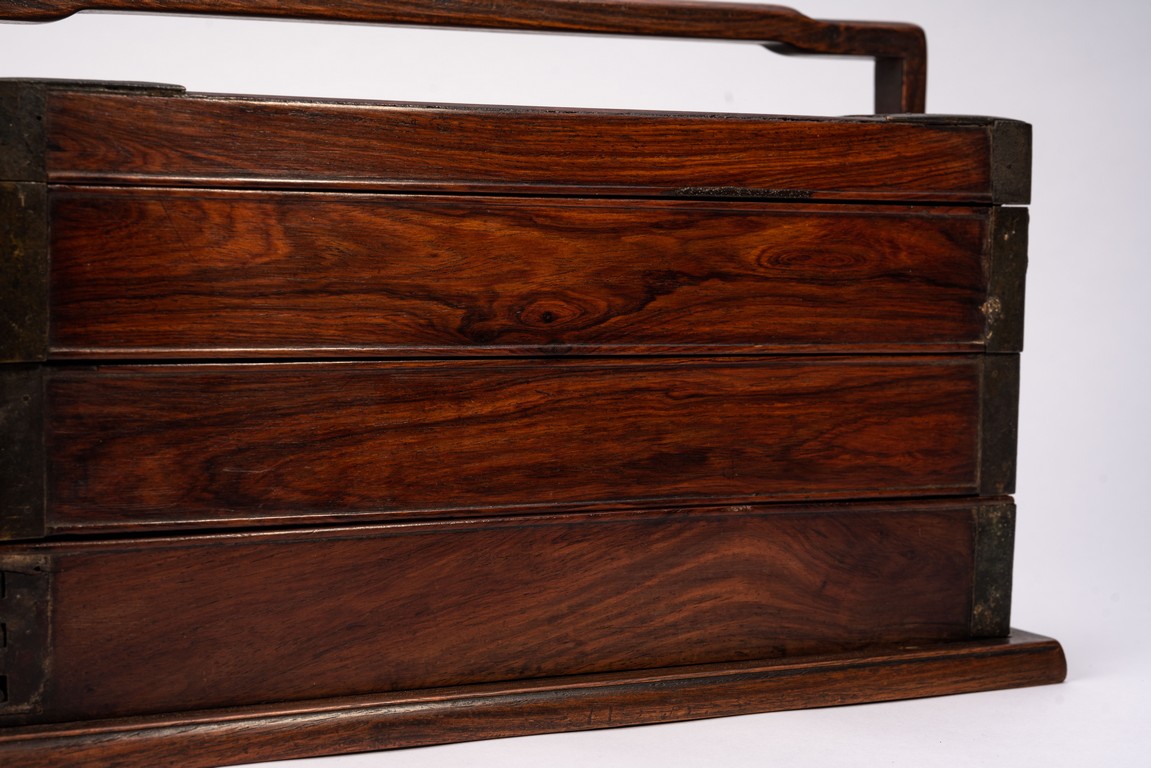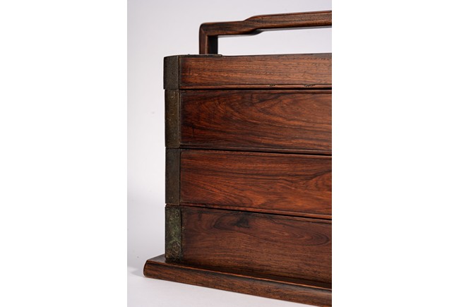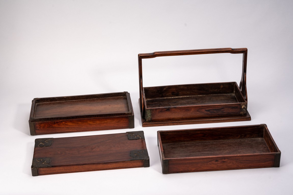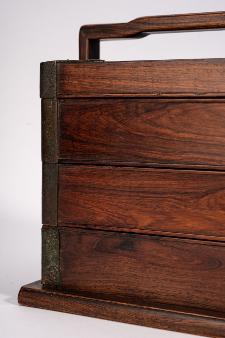 Early/Mid-Qing Dynasty period. of rectangular form comprising a shallow upper tray above three stacked trays,each tier with a beaded lip, the four corners of the flat top inlaid with ruyi-shaped brass plates, the arched handle rising from a stepped base and with lateral supports on each side.