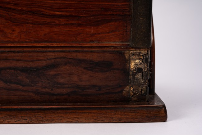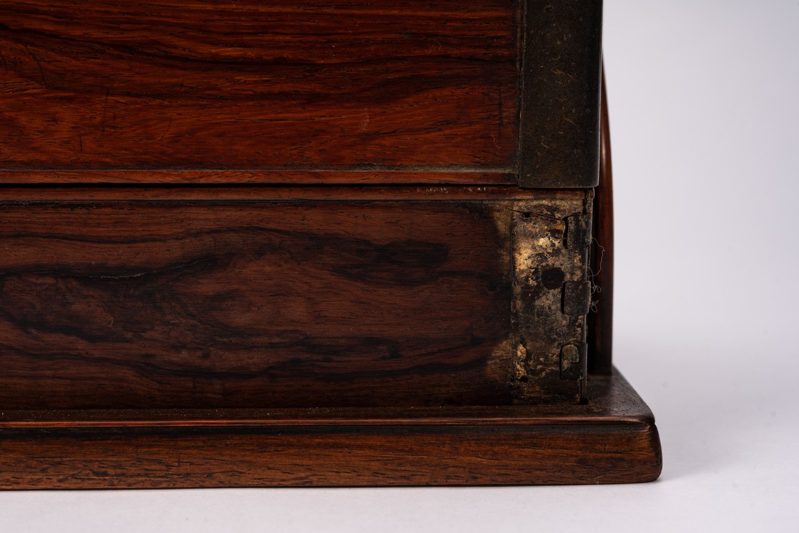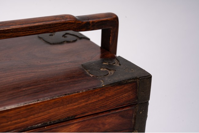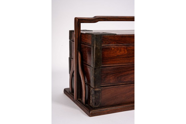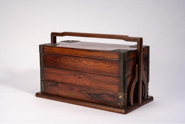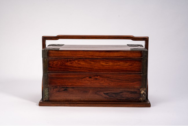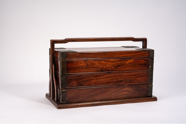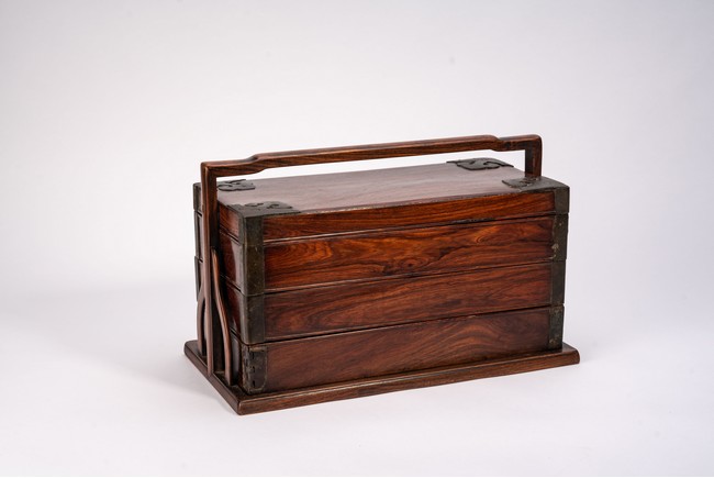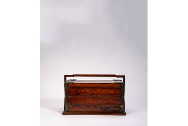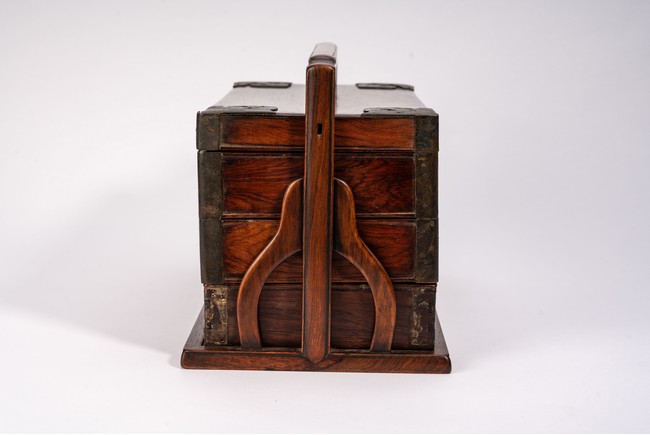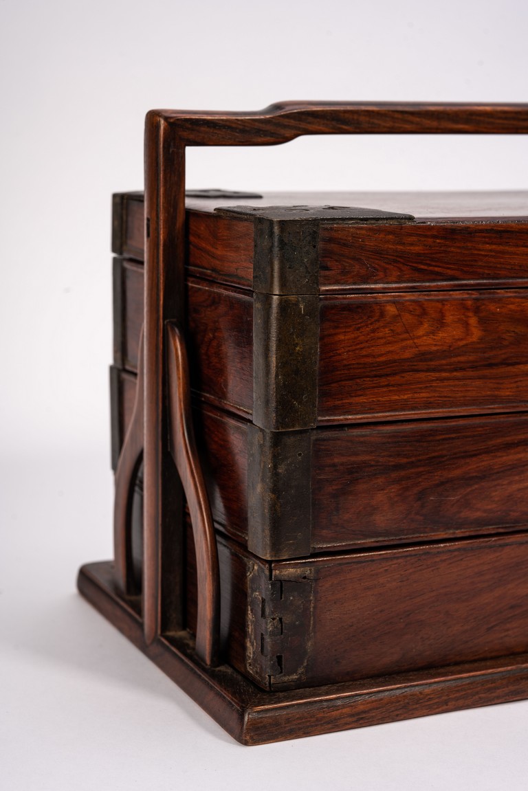Early/Mid-Qing Dynasty period. of rectangular form comprising a shallow upper tray above three stacked trays,each tier with a beaded lip, the four corners of the flat top inlaid with ruyi-shaped brass plates, the arched handle rising from a stepped base and with lateral supports on each side.