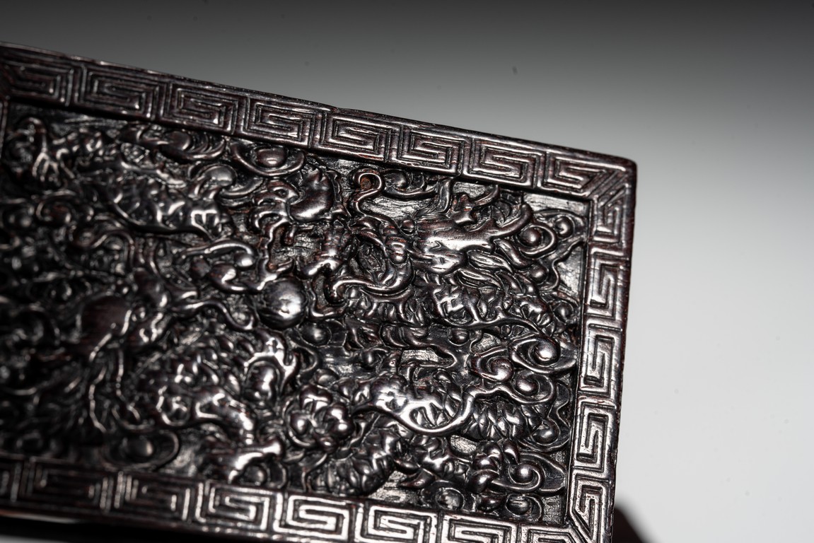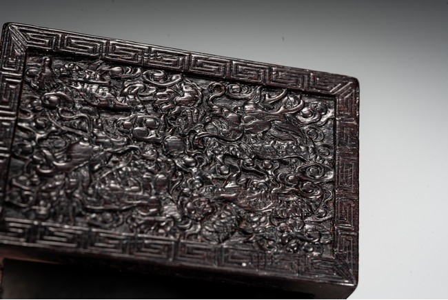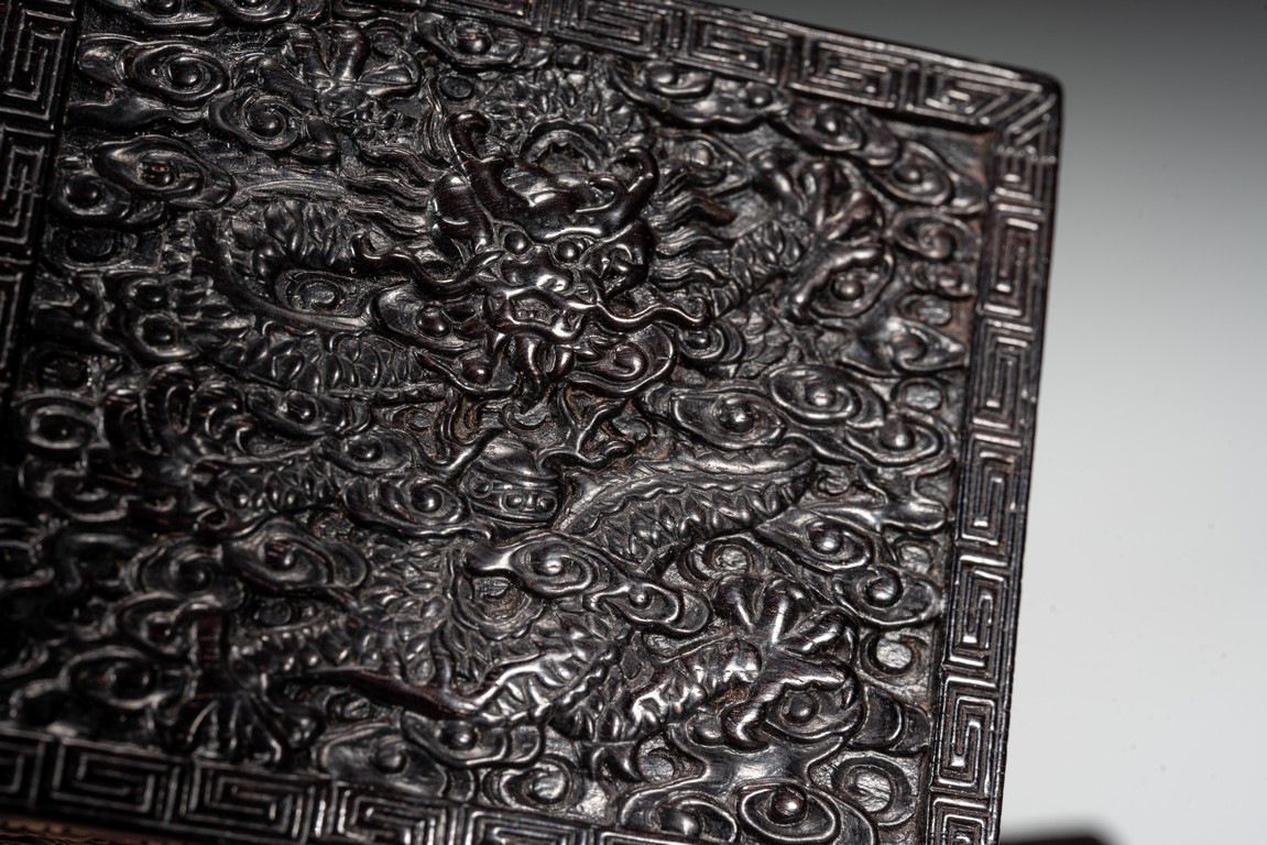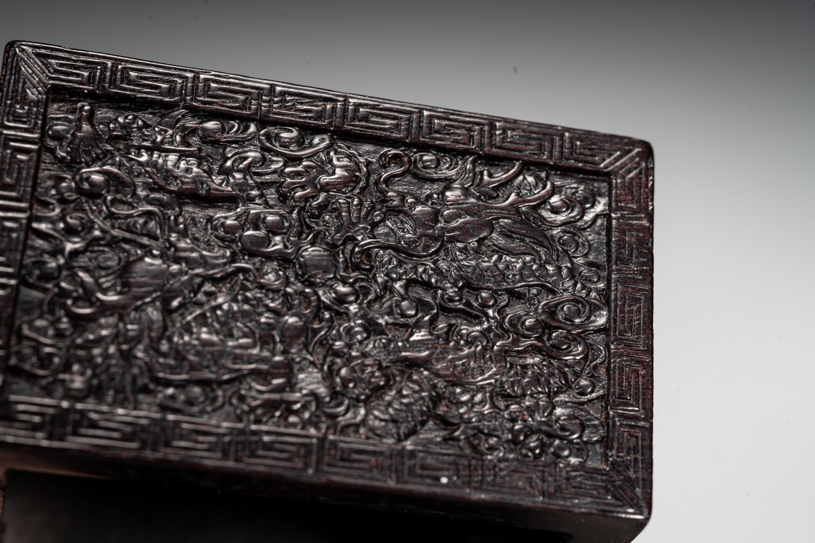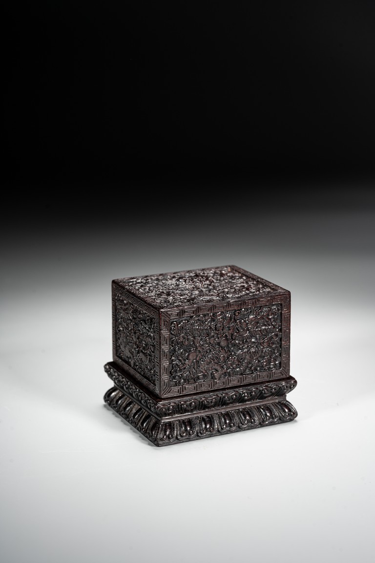 Of square form, the box carved with dragon in relief, with double lotus stand.