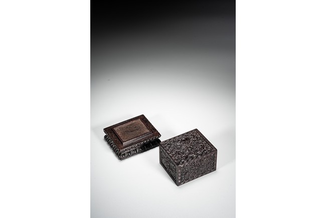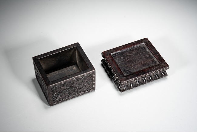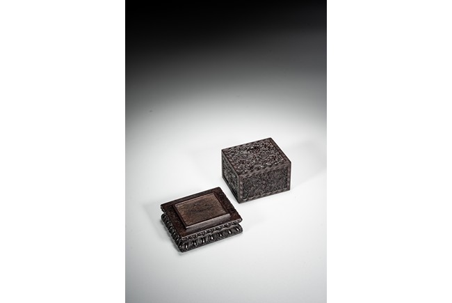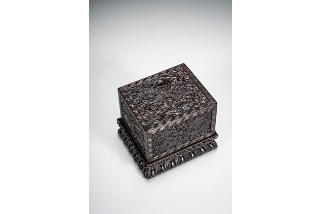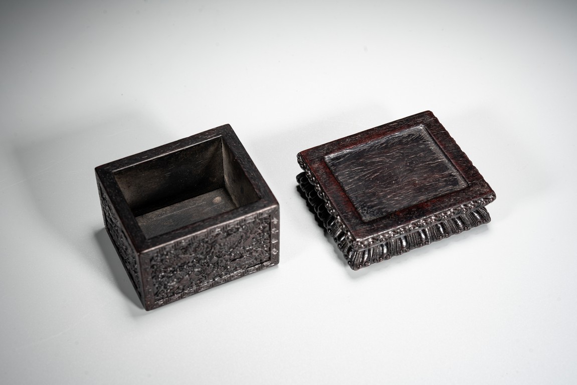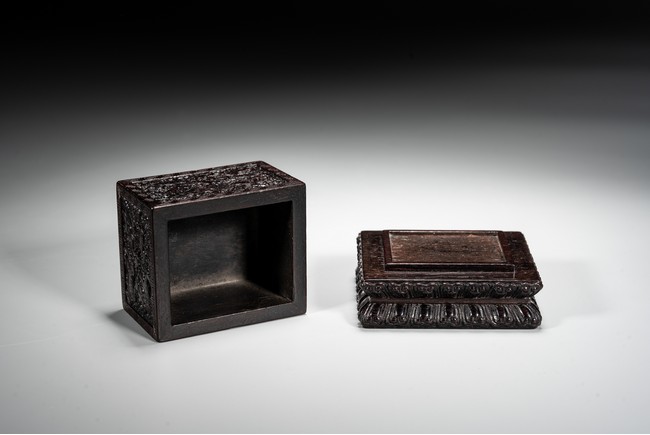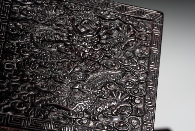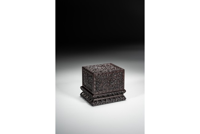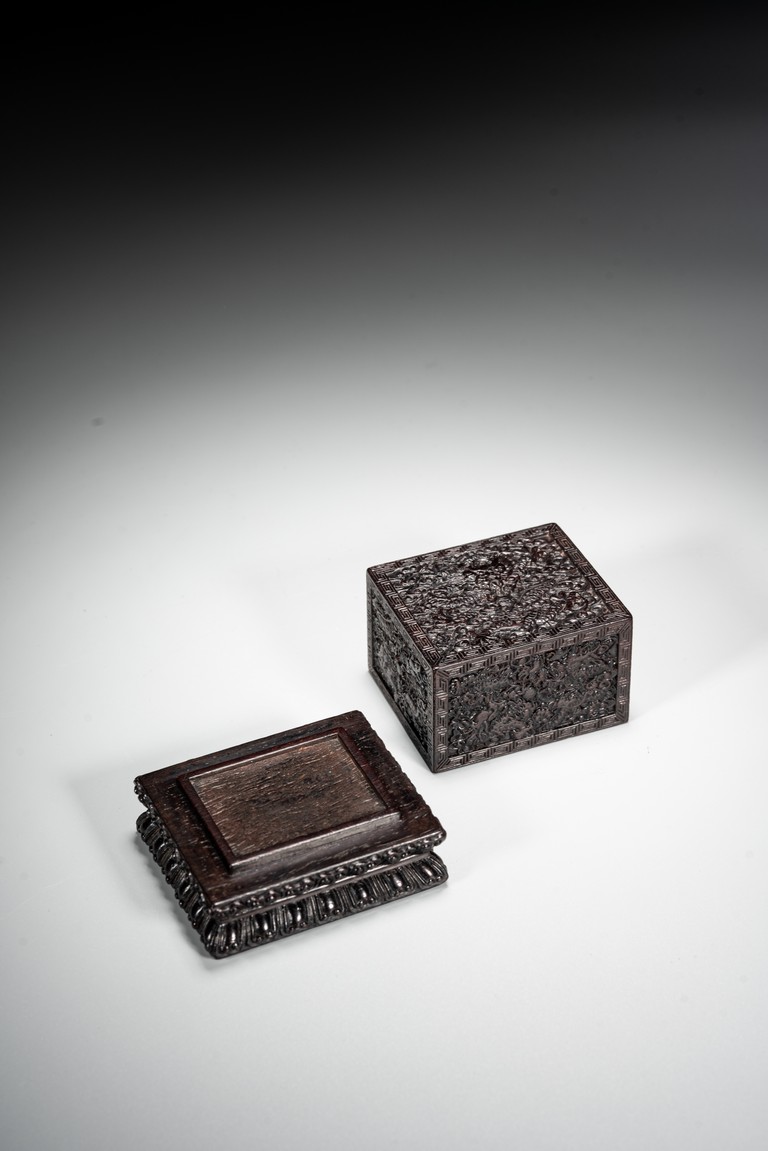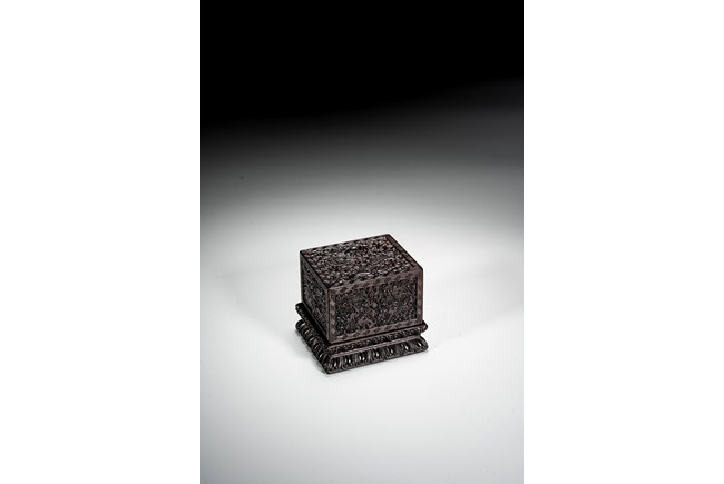 Of square form, the box carved with dragon in relief, with double lotus stand.