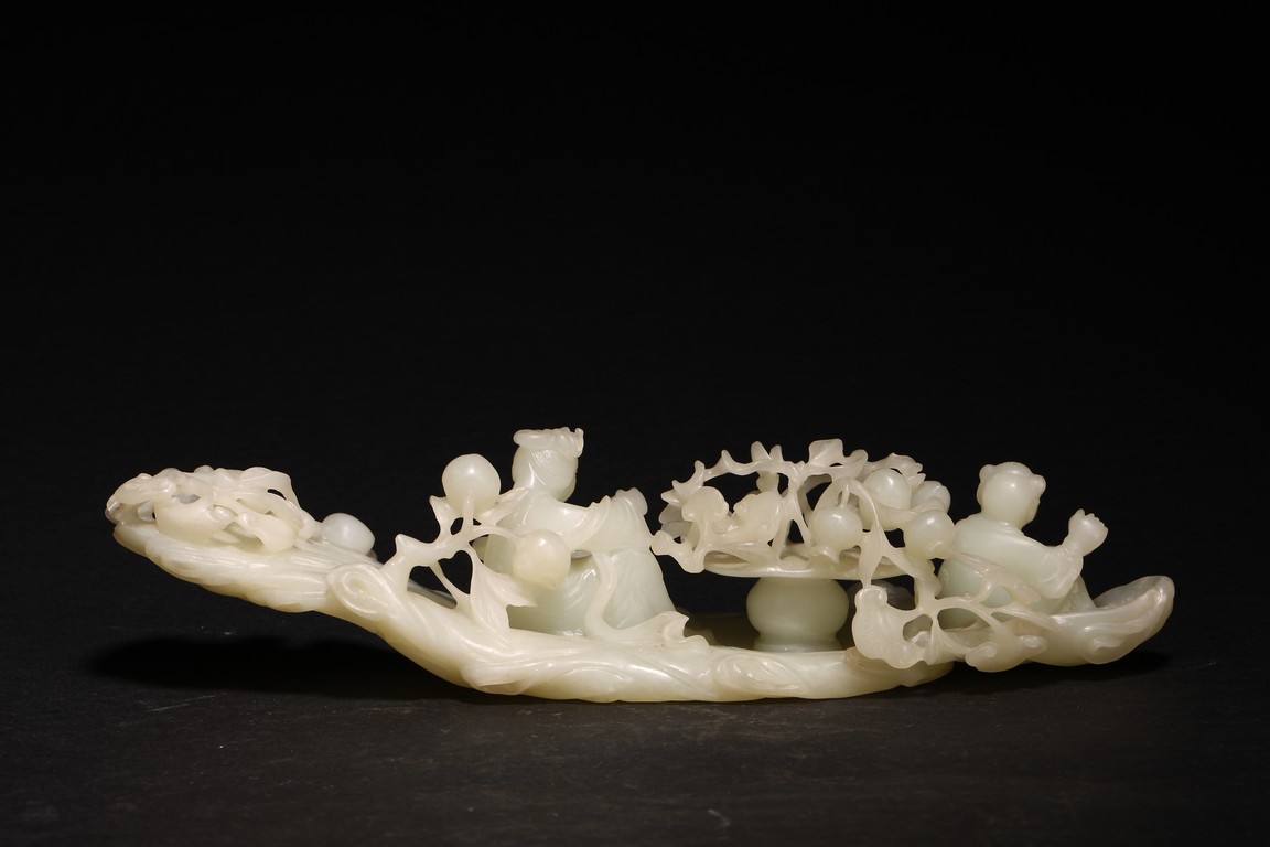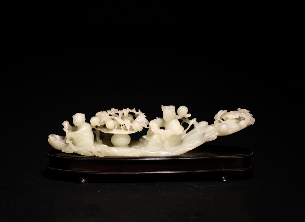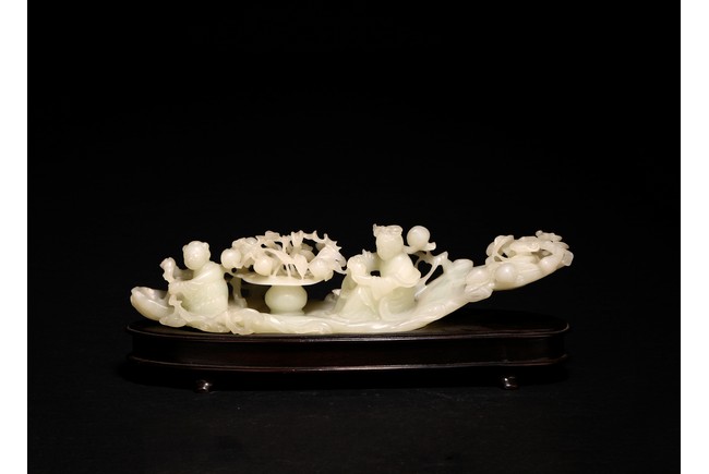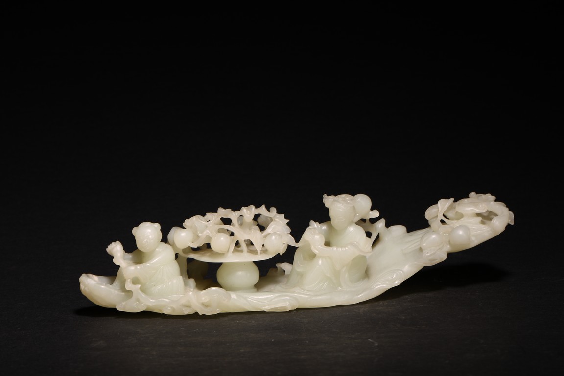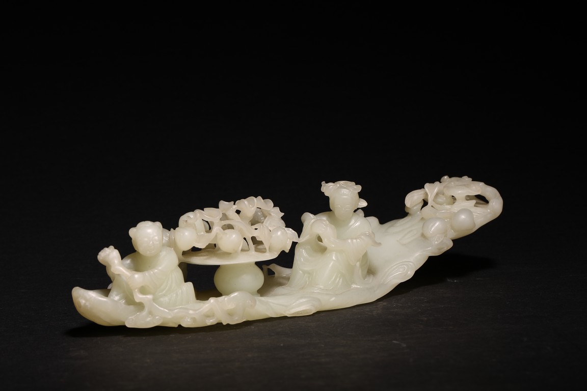 Qing Dynasty period. In the form of a tree log raft, carrying a female immortal seated holding a peach next to a basket of peach branches, with a seated boy rowing the raft at one end, the stone is of translucent white tone.
