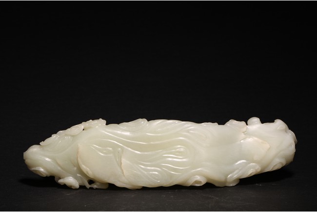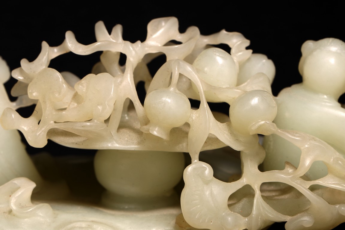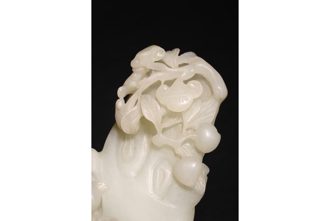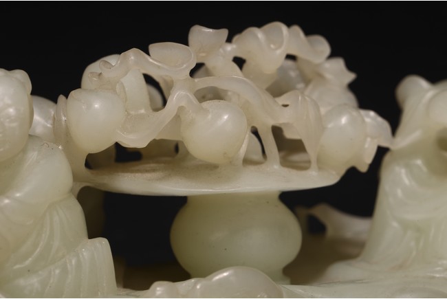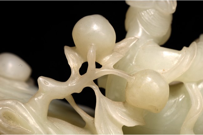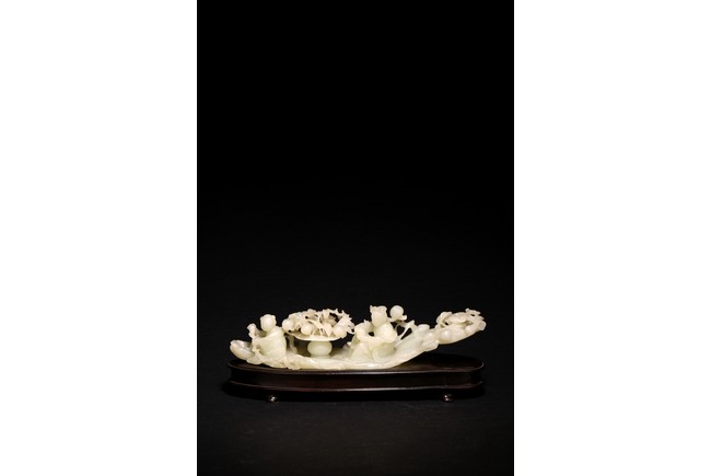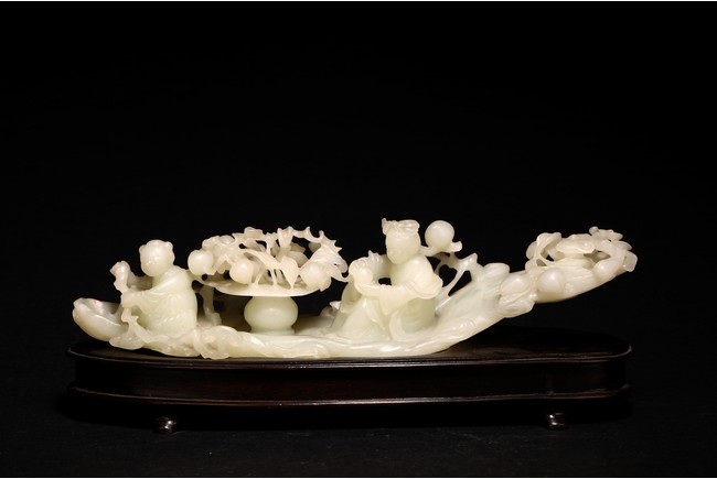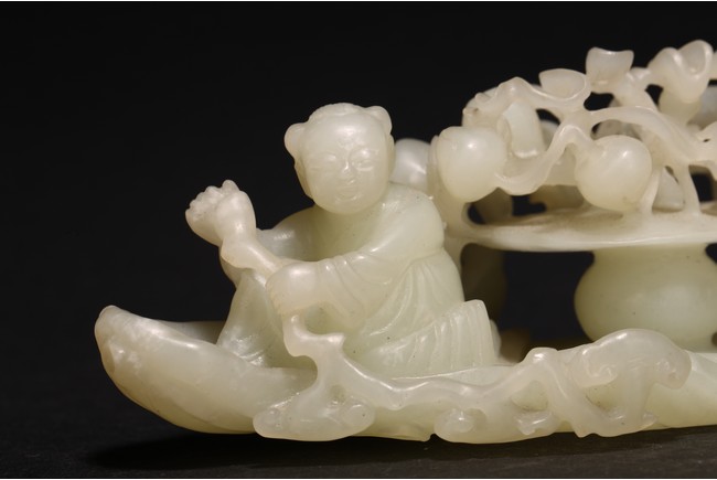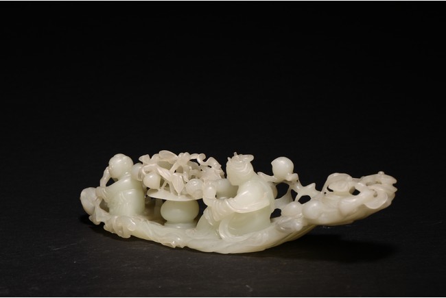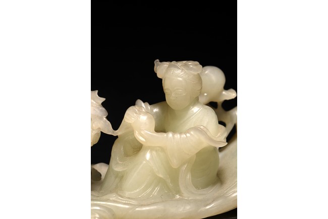 Qing Dynasty period. In the form of a tree log raft, carrying a female immortal seated holding a peach next to a basket of peach branches, with a seated boy rowing the raft at one end, the stone is of translucent white tone.