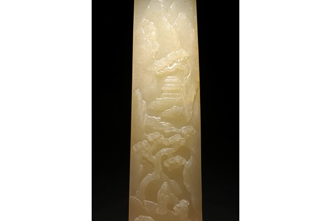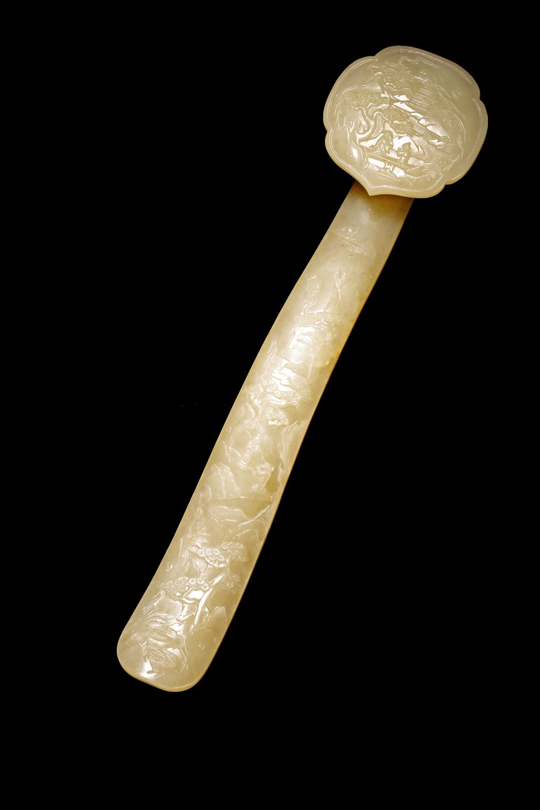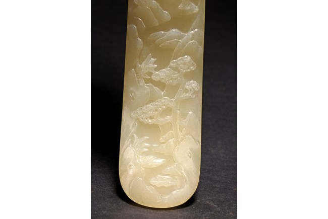 Qing Dynasty period. Elegantly carved with an S-shaped profile, the head decorated in low relief with an immortal accompanied by an attendant on a bridge in a rocky landscape with a pavilion in the background, the slender shaft finely carved with continuous landscape scenes of river streams, pine trees, mountains, and figures.