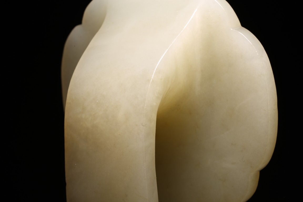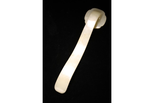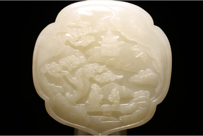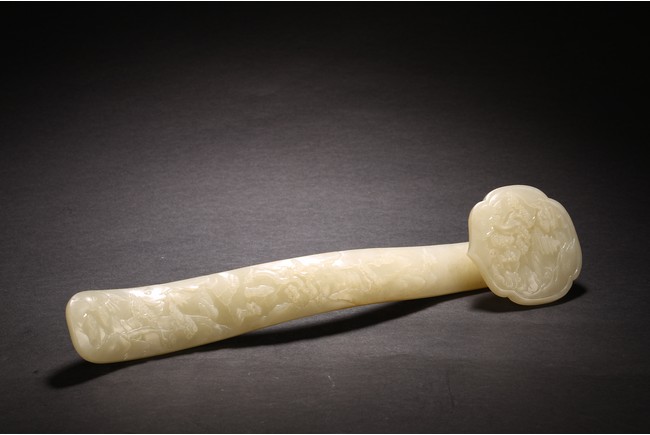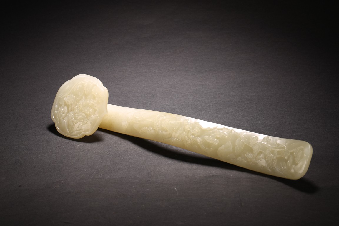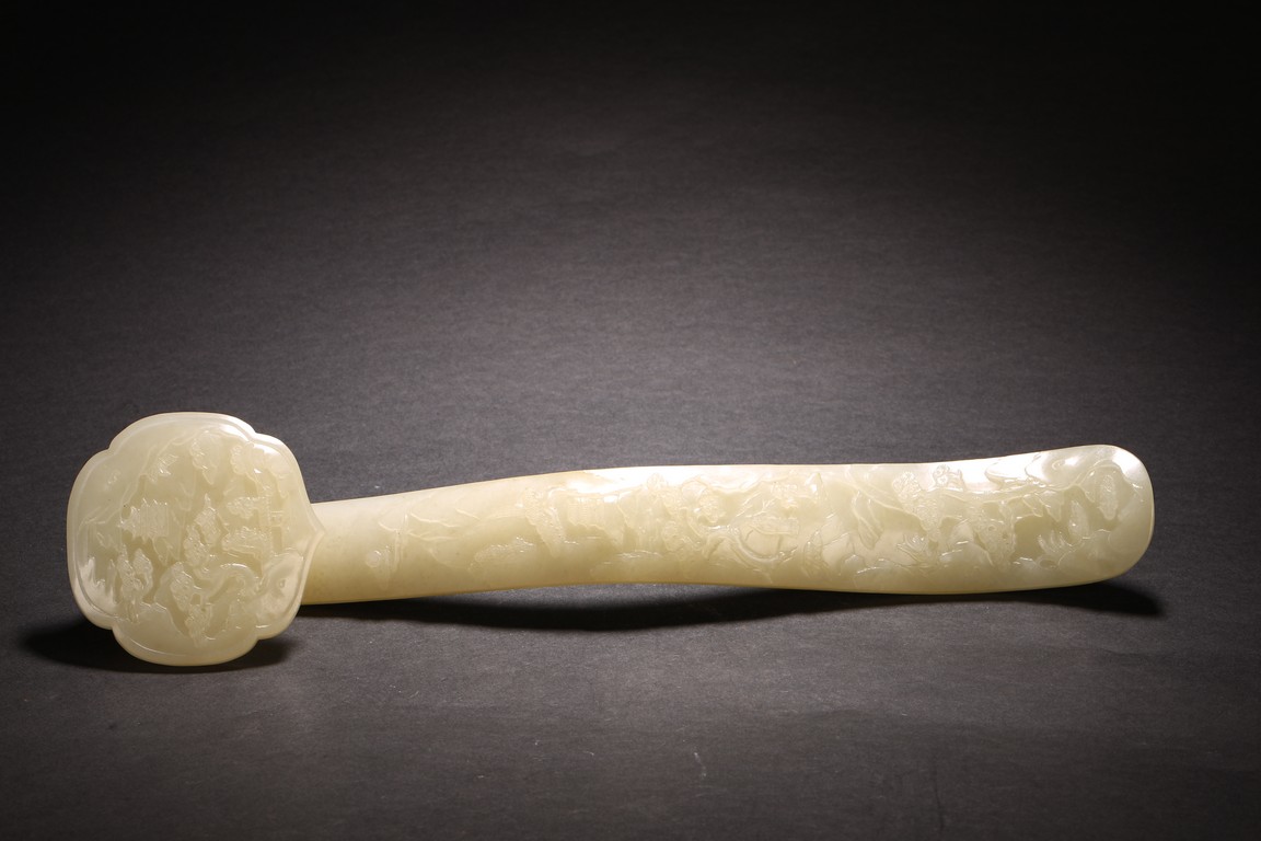 如意以整料和闐白玉雕琢而成,作雲葉式首,玉質晶瑩潔白,首面四周起如意雲紋邊框,以壓地隱起的技法,開光內淺浮雕山林人物。古松枝繁葉茂,亭台樓閣,煙雲繚繞,樹下又有仙翁仙童,寓意仙人賀壽。器柄曲線優美流暢,柄身中部微隆,柄身正面“山水人物”,整體雕琢精煉,於方寸之間,以刀代筆展現惟妙惟肖的人物,更顯制作者的精湛工藝。整器刀工嫻熟,造型大氣,包漿醇厚自然,雍容端莊,曲線婉轉流暢,結構嚴謹和諧。來源: 北加州灣區私人藏家收藏 Provenance: Private collection, Bay area, Northern California