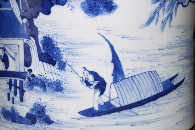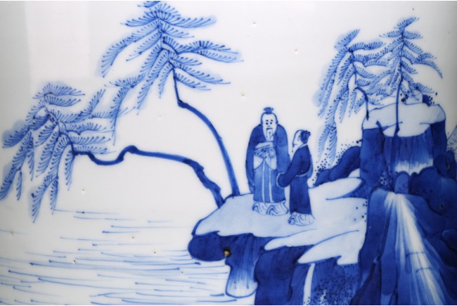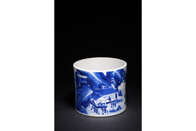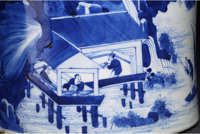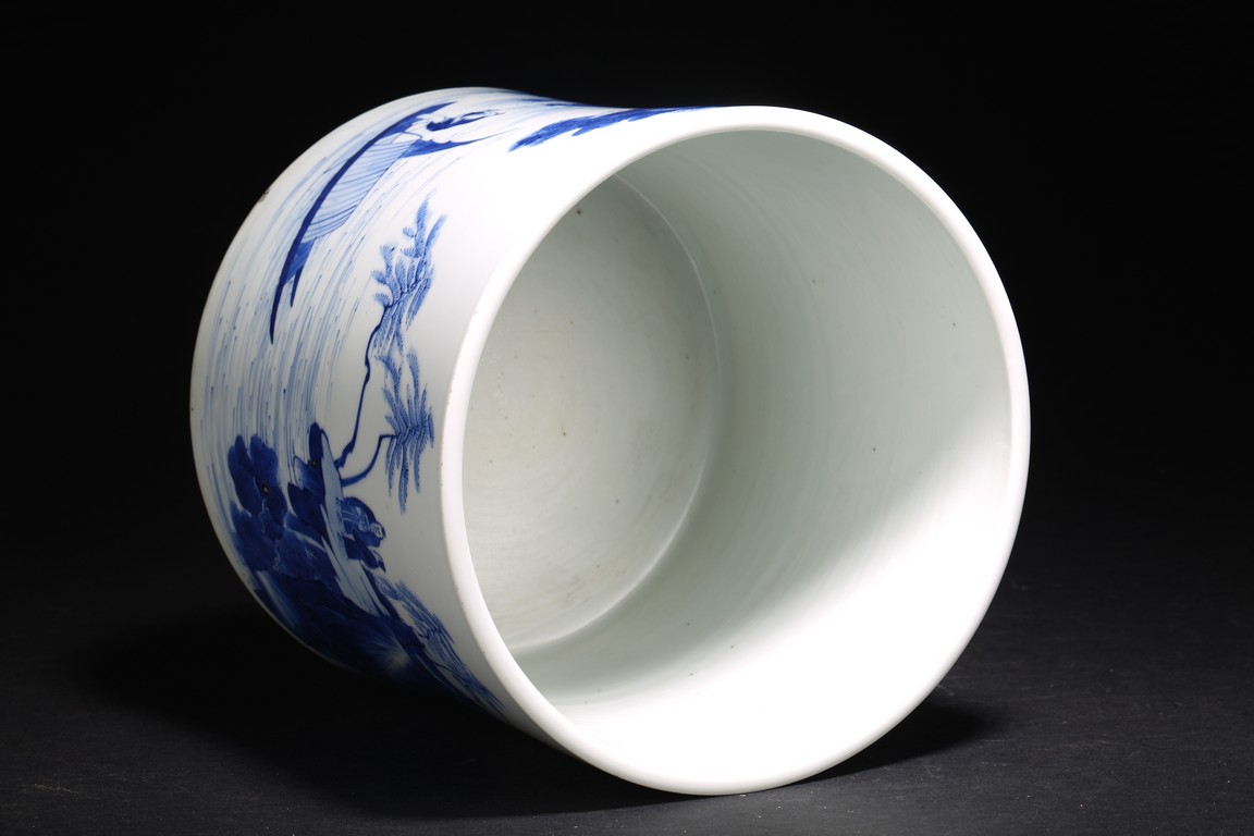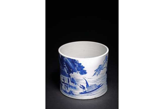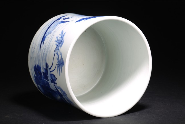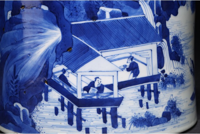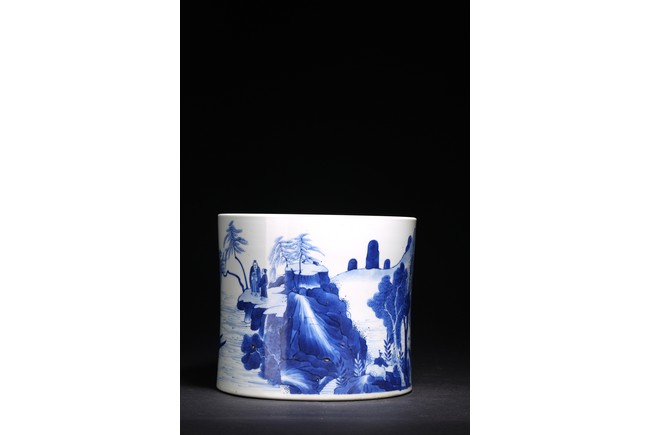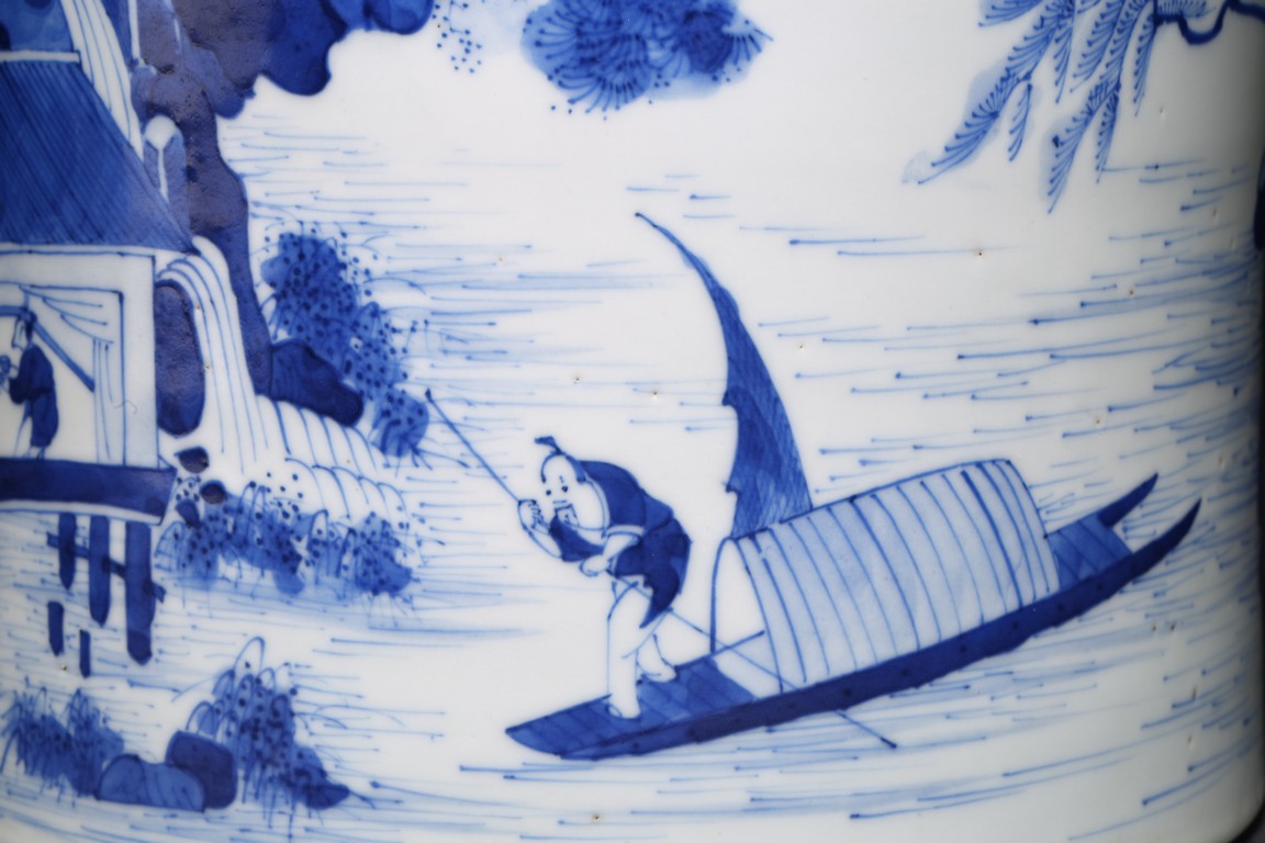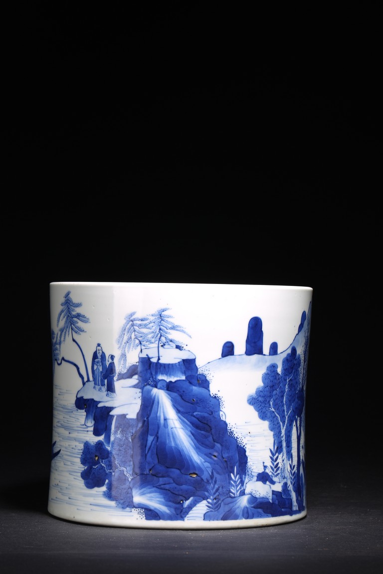 Qing Dynasty Kangxi period. Of cylindrical form, it is finely painted in cobalt blue around the body to depict two scholars conversing on a cliff, the other side depicts scholars appreciating the lake scene, the base with a central recessed roundel and written with seven characters.