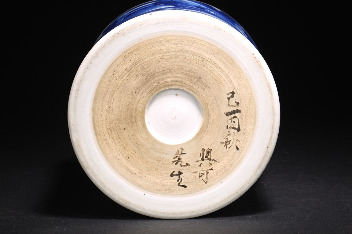 筆筒呈直筒形,玉璧底,胎堅厚重,通體施白釉,釉面瑩透滋潤平滑。器身用青花繪“山水人物紋”,青花发色青翠明麗,濃淡深淺運用自如,人物神情勾勒細膩、生動,周圍襯以山石樹木,亭台樓閣,漁人乘船,層次清晰,底部墨書“已酋秋羿可先生”,字跡清晰,筆法老道。 來源: 洛杉磯資深藏家收藏 Provenance: Property from an important private collection, Los Angeles