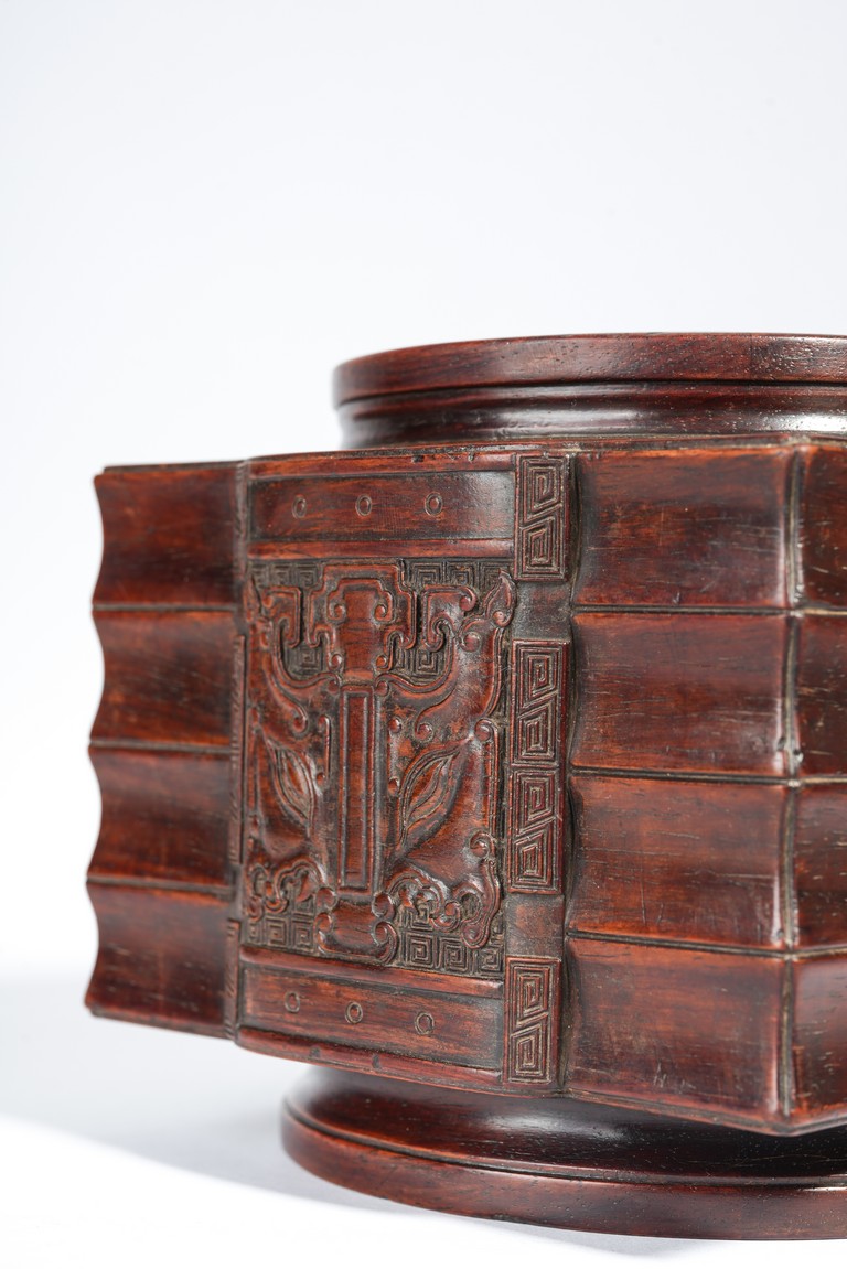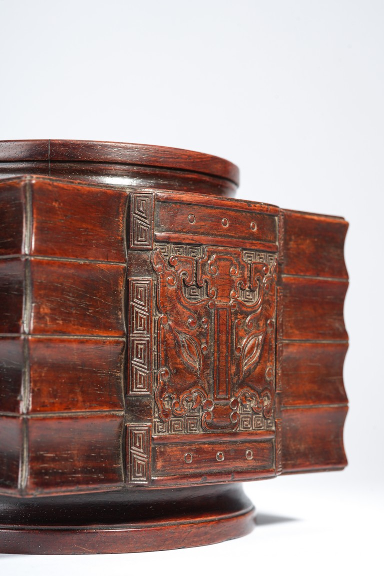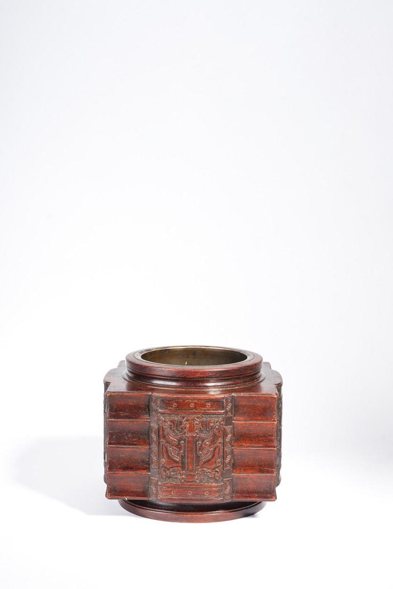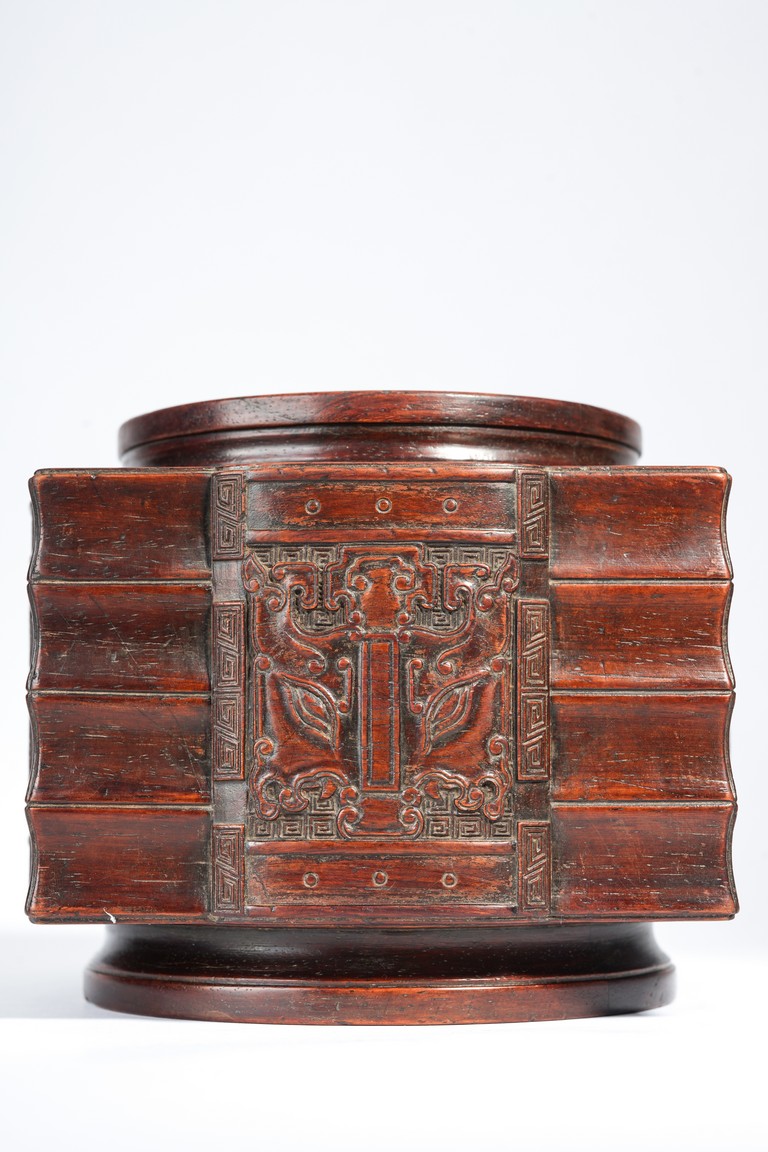 Qing Dynasty period. Of cylindrical form with square projections on four sides, divided into three registers and the center raised panel carved in shallow relief with stylized taotie mask, the interior carved out with copper lining.