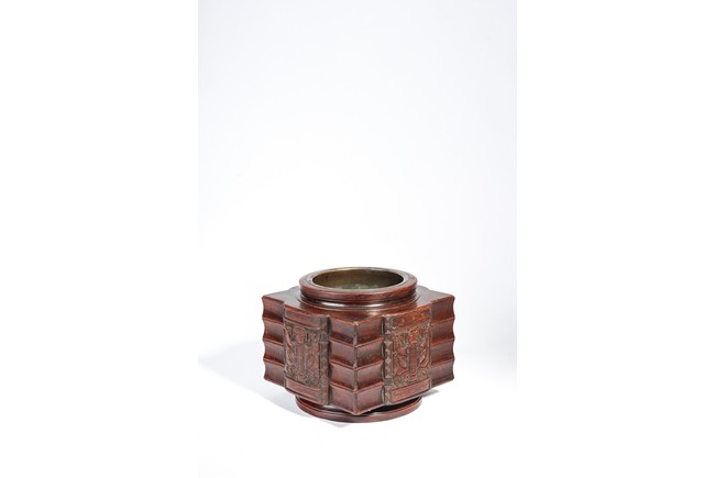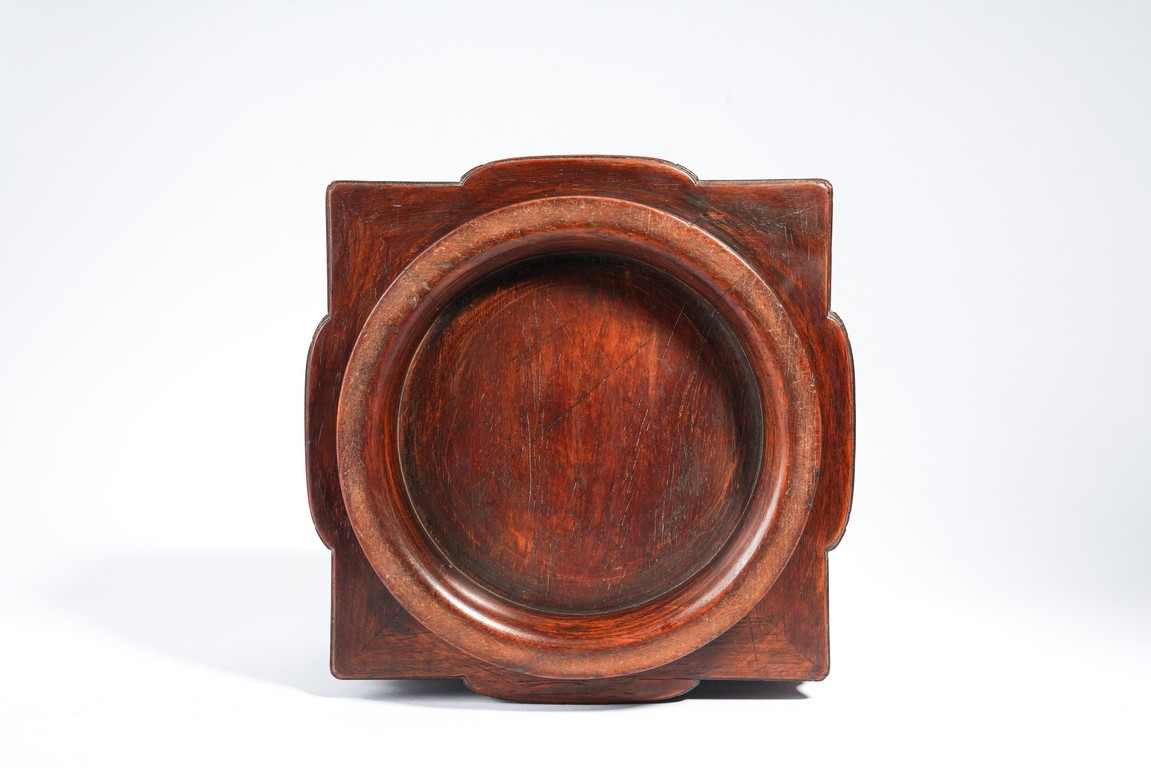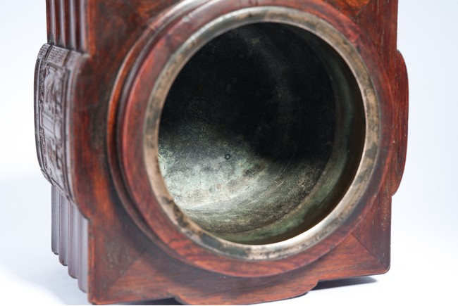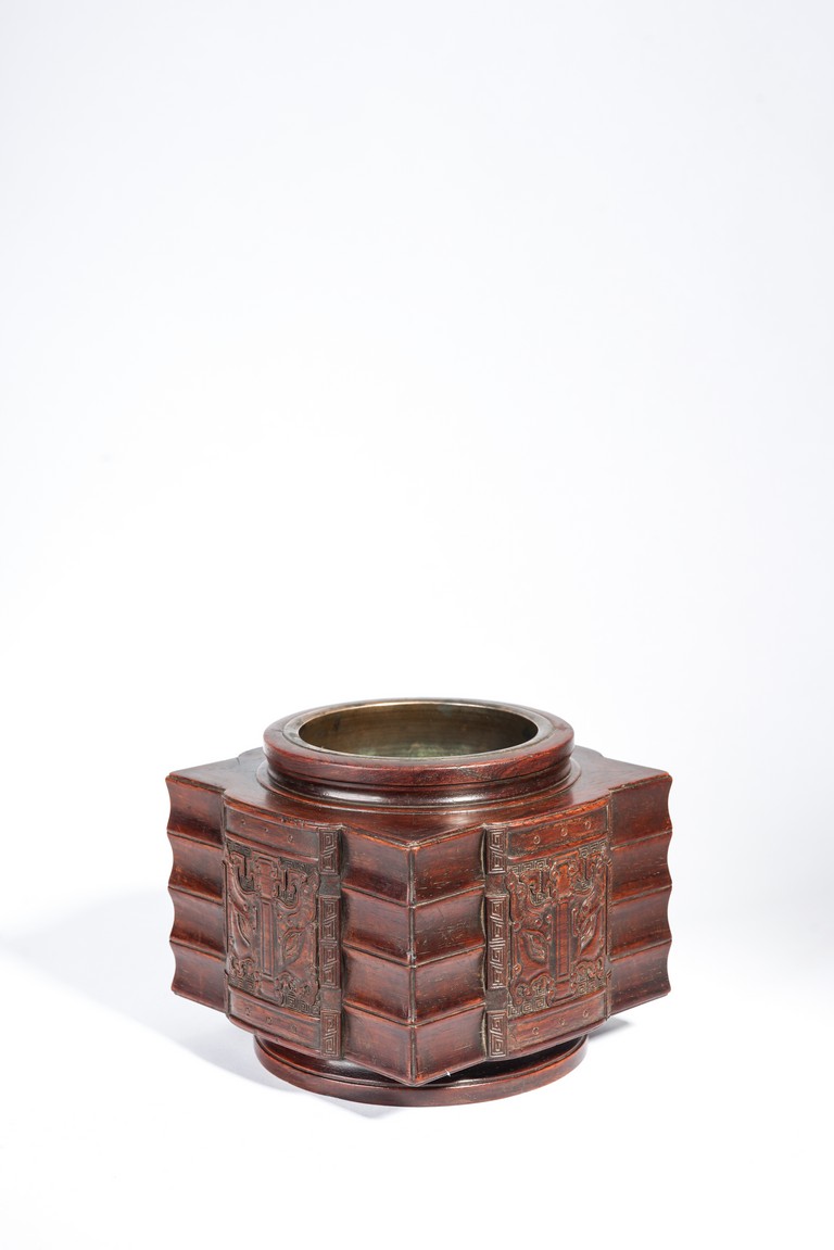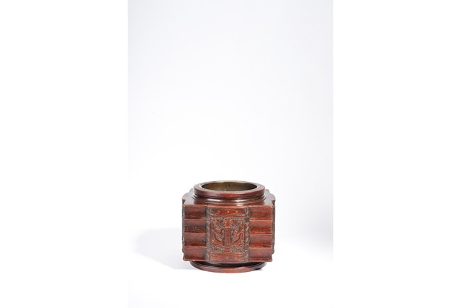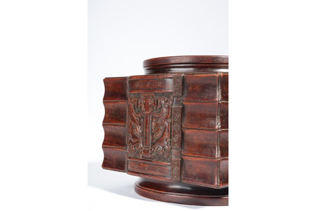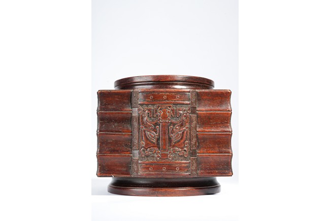 Qing Dynasty period. Of cylindrical form with square projections on four sides, divided into three registers and the center raised panel carved in shallow relief with stylized taotie mask, the interior carved out with copper lining.