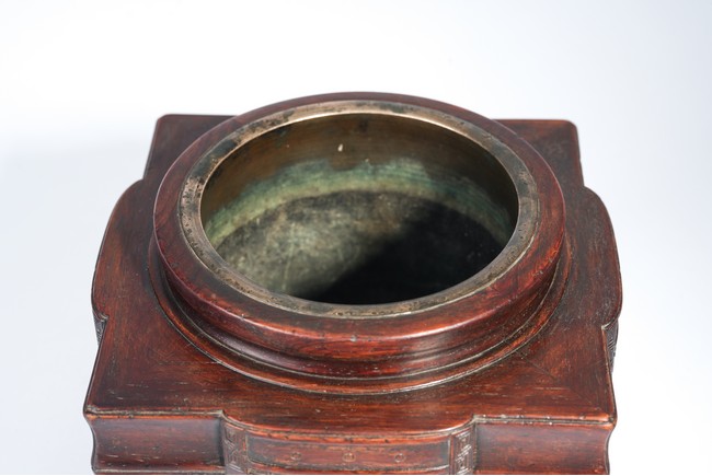 琮這種器型最早來自上古玉琮。玉琮是一種內圓外方的筒形玉器,為中國古代的重要禮器之一。據戰國《周禮·春宮·大宗伯》記載:“以玉作六器,以禮天地四方。以蒼壁禮天,以黃琮禮地。”一般認為,玉琮與宗教祭祀、財富權力有關。此件爐器型仿玉琮而制,用黃花梨制成,色澤沈斂紅潤,文理美觀,包漿厚重。整體外方內圓,圓口,短直頸,平折肩,四面方體,寓天圓地方之意。器身四面皆浮雕“饕餮紋”,刀工流暢細膩,可謂精工巧奪。爐心為紅銅制成,銅質優良。整體氣勢恢宏,為具陳設和實用於一身的佳品。類似名貴木製香爐十分罕見,查閱資料,尚未發現第二尊黃花梨製香爐。市場上唯一類似藏品可參考一件清代紫檀饕餮紋香爐,北京翰海2014年10月拍賣,拍品號3363,成交價345,000RMB。來源: 洛杉磯重要藏家收藏 Provenance:From an Important private collection, Los Angeles