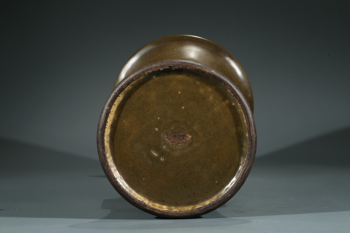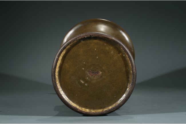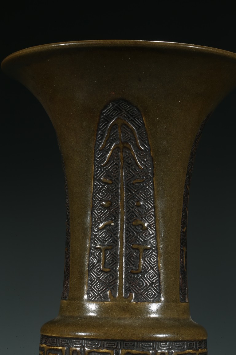 撇口似喇叭、足外撇,胎骨堅細厚重。通體施茶葉末釉,釉色瑩潤光亮,青綠色夾雜黃黑星點,給人凝重神秘的感覺。器身印“蕉葉紋”“迴紋”。造型雋秀,端莊大方,線條變化十分豐富。