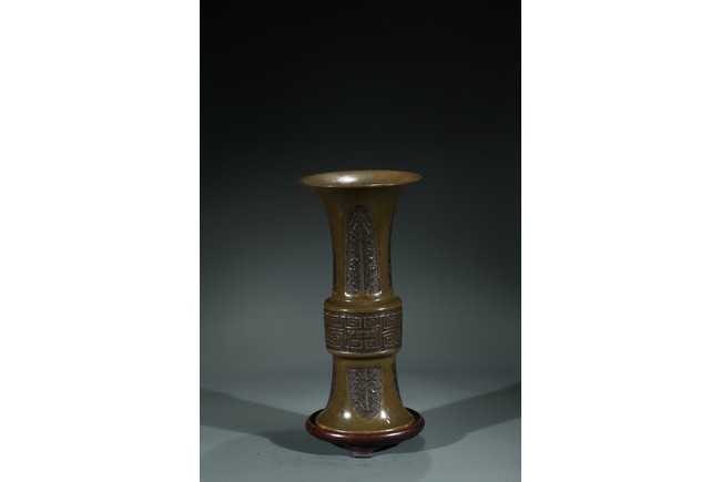 Qing Dynasty period. Of archaistic gu form, of slender form rising from a flared foot to a trumpet mouth, the waisted center carved with key-fret pattern, beneath upright and pendent panels of plantain leaves, covered overall in a deep olive-green, fitted on wood stand.