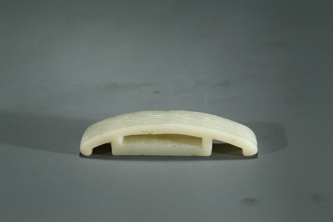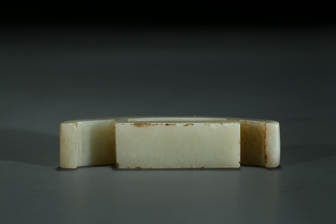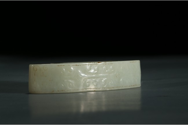 白玉製成,玉質潔白細膩,包漿厚重,長方扁形,中間有方孔可縛於劍鞘之上,紋飾以勾雲紋為主。