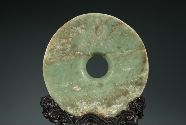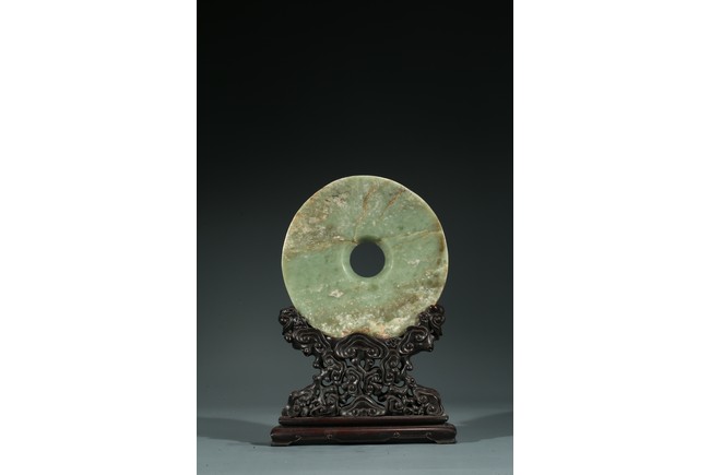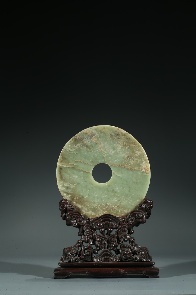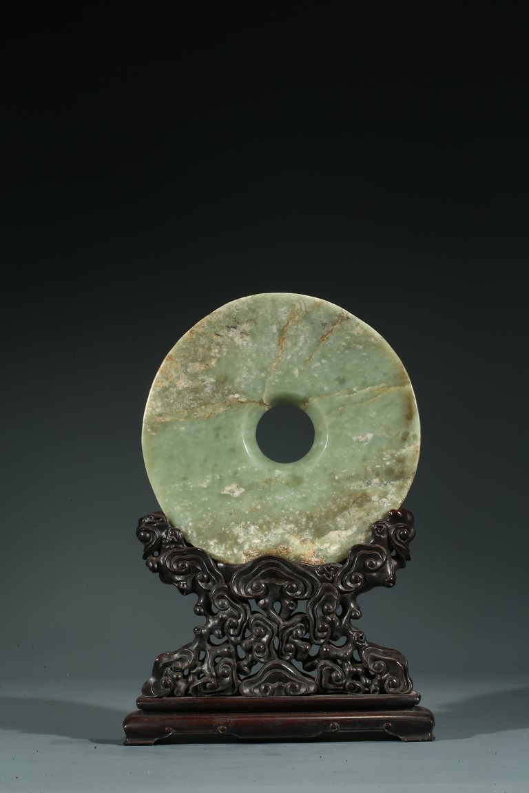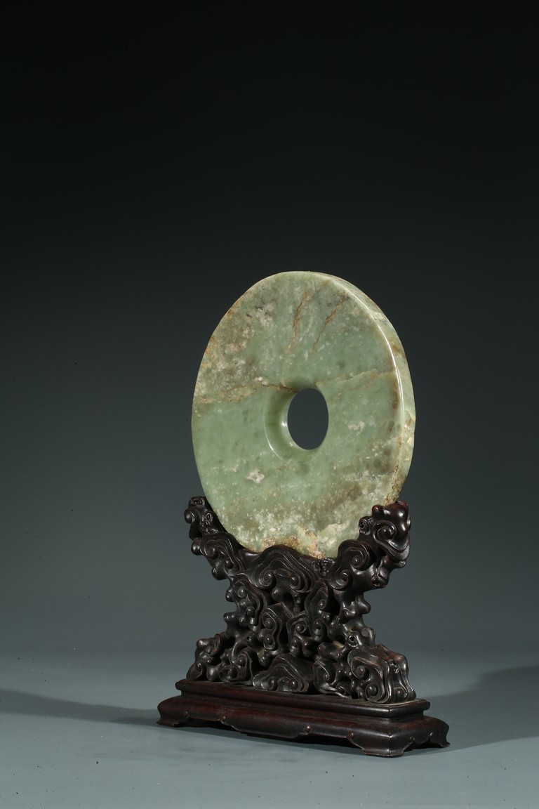 說文》稱:“璧圓像天”,《周禮》則有“以蒼璧禮天”之說。這說明璧之圓形是仿“天圓”而作。其功能主要用於祭天的禮器,另外也有辟邪或是等級與財富的象徵。此璧玉璧深綠色,用料上乘,典雅古樸,雜有大片的褐黃色斑,半透明。圓整,平廓;中孔、外緣齊整。配硬木底座,座以滿浮雕如意云紋裝飾,雕工純熟。本器有天下太平、洪福齊天之吉祥寓意。