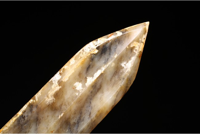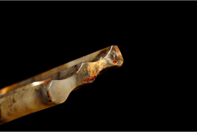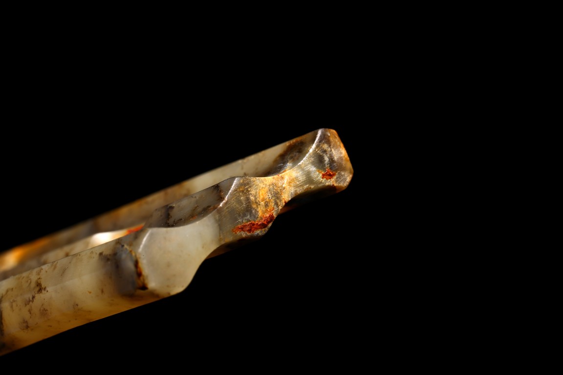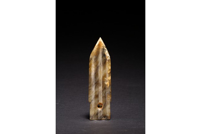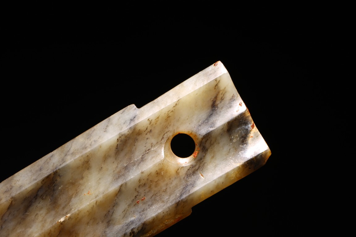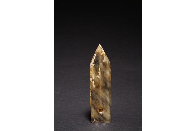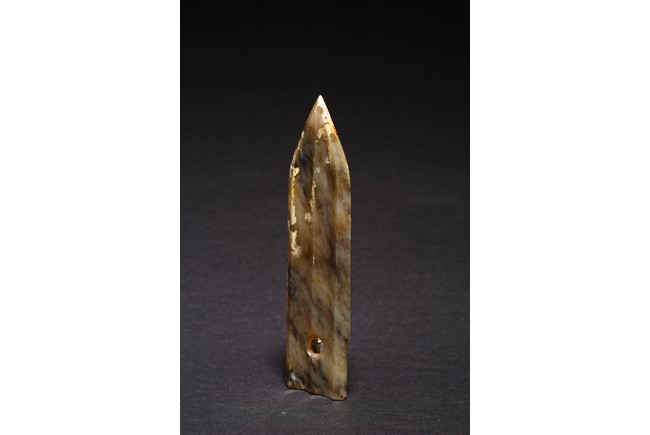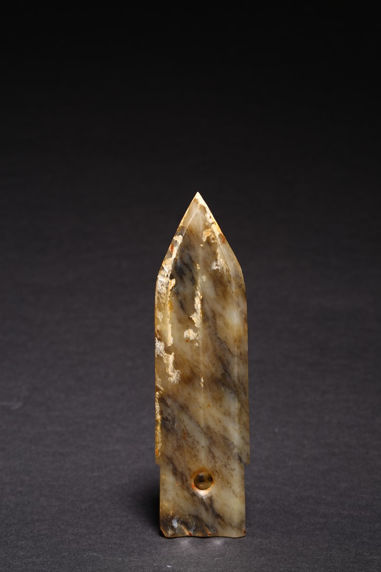 Shang Dynasty or later. With bevelled edges tapering to an upward curving tip, centered with a raised ridge along the base of the offset tang to the sharp tip, pierced with an aperture, the stone of a mottled grey, white, and beige tone.