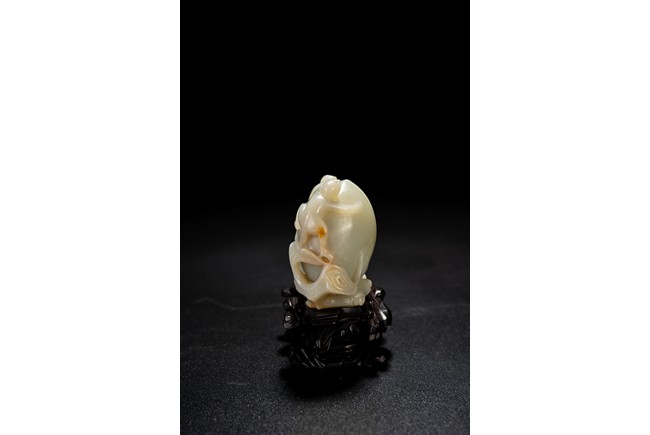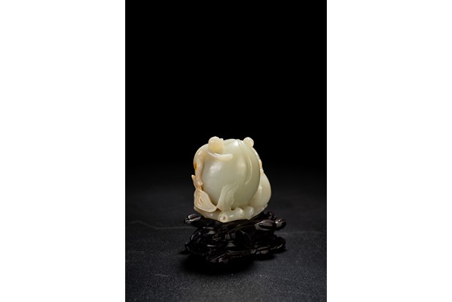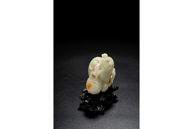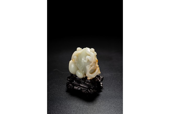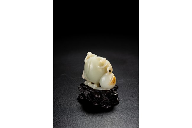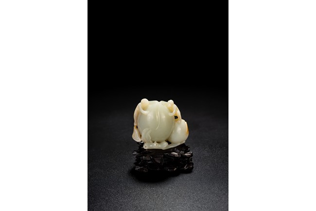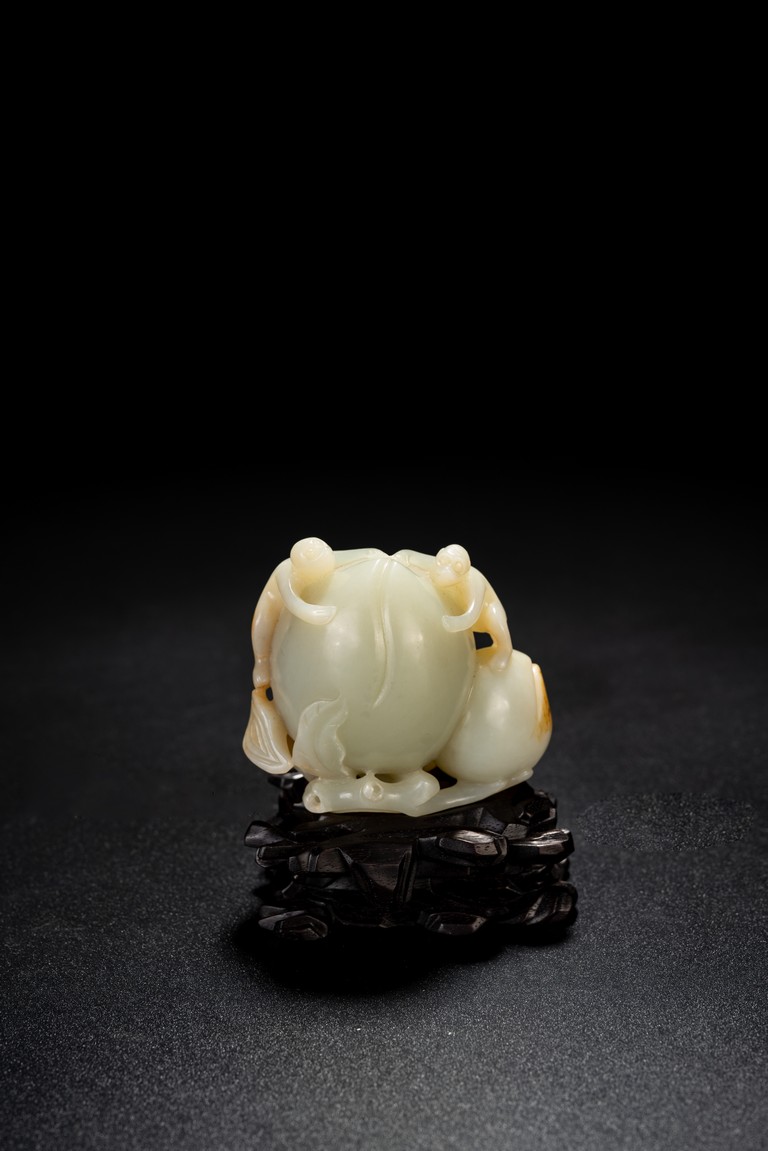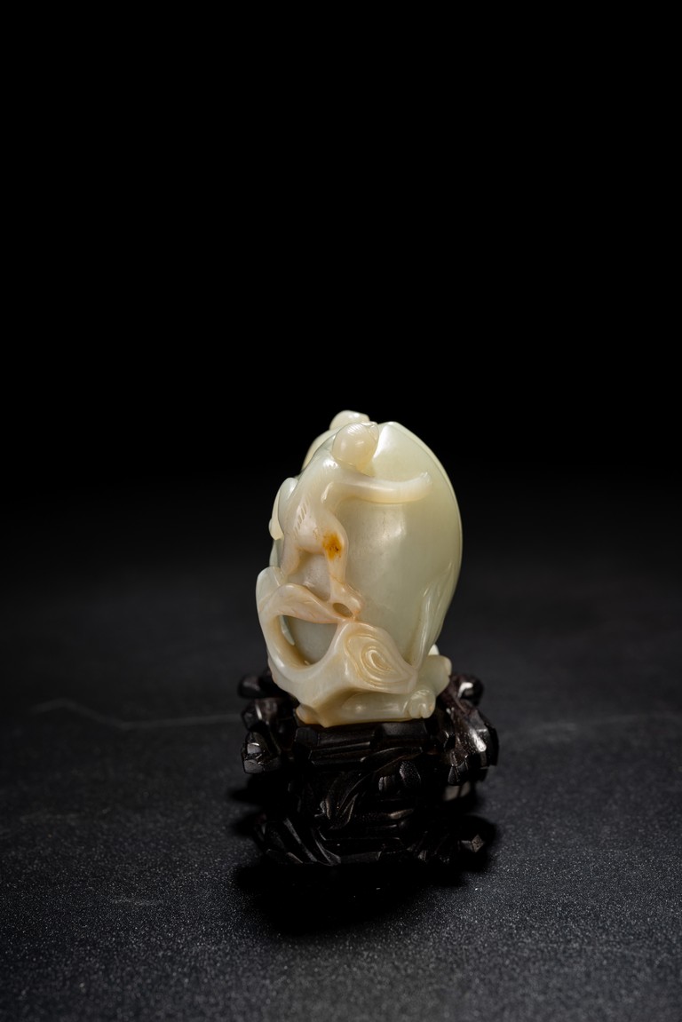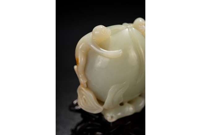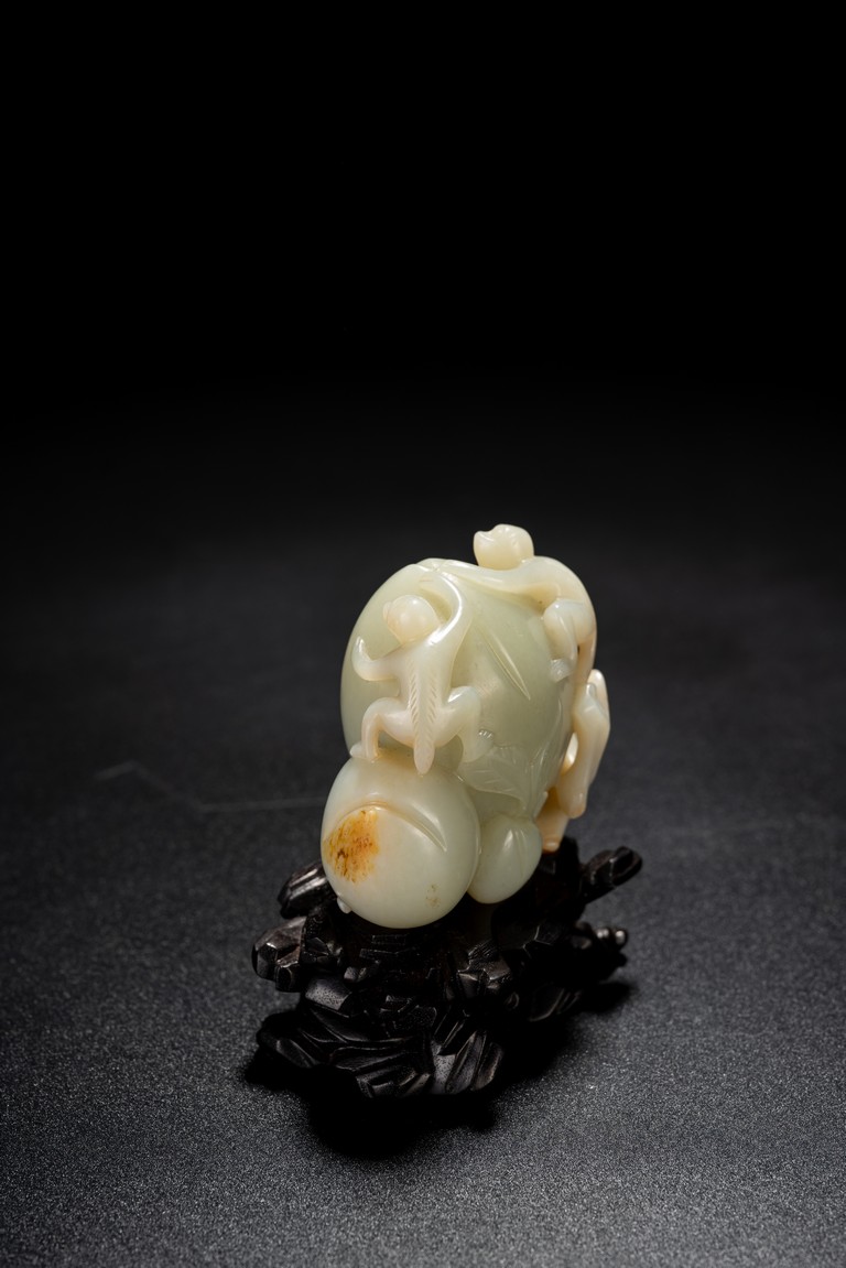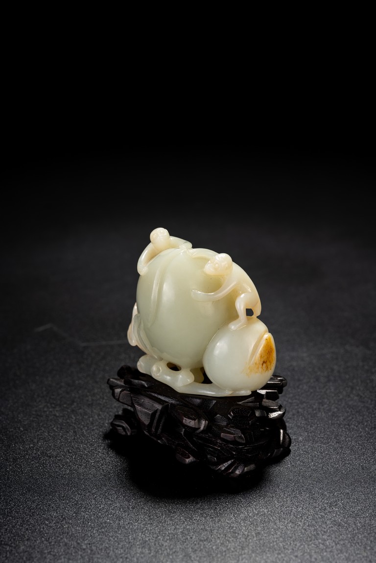 和田白玉帶皮,溫潤如凝脂,立體圓雕一雙活潑可愛的猴子在桃樹上嬉戲玩耍。桃樹碩果累累,枝藤卷曲,飽滿誘人,象征長壽美滿。整體雕工精湛細致,造型惟妙惟肖,生動傳神。