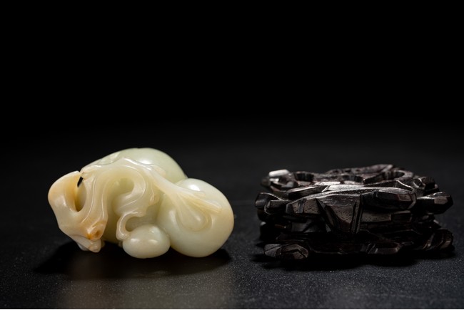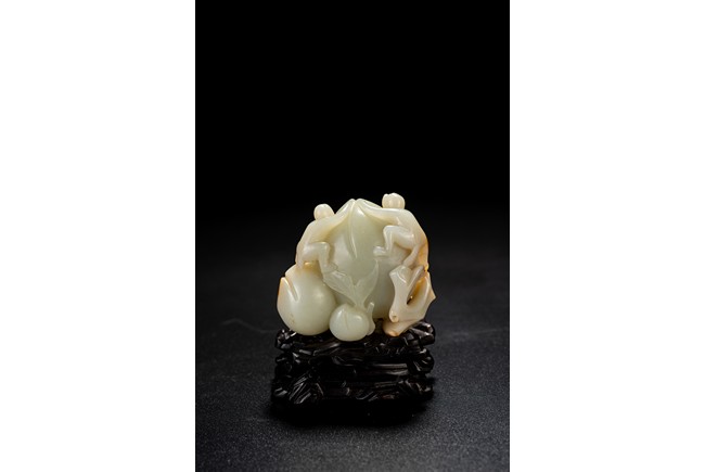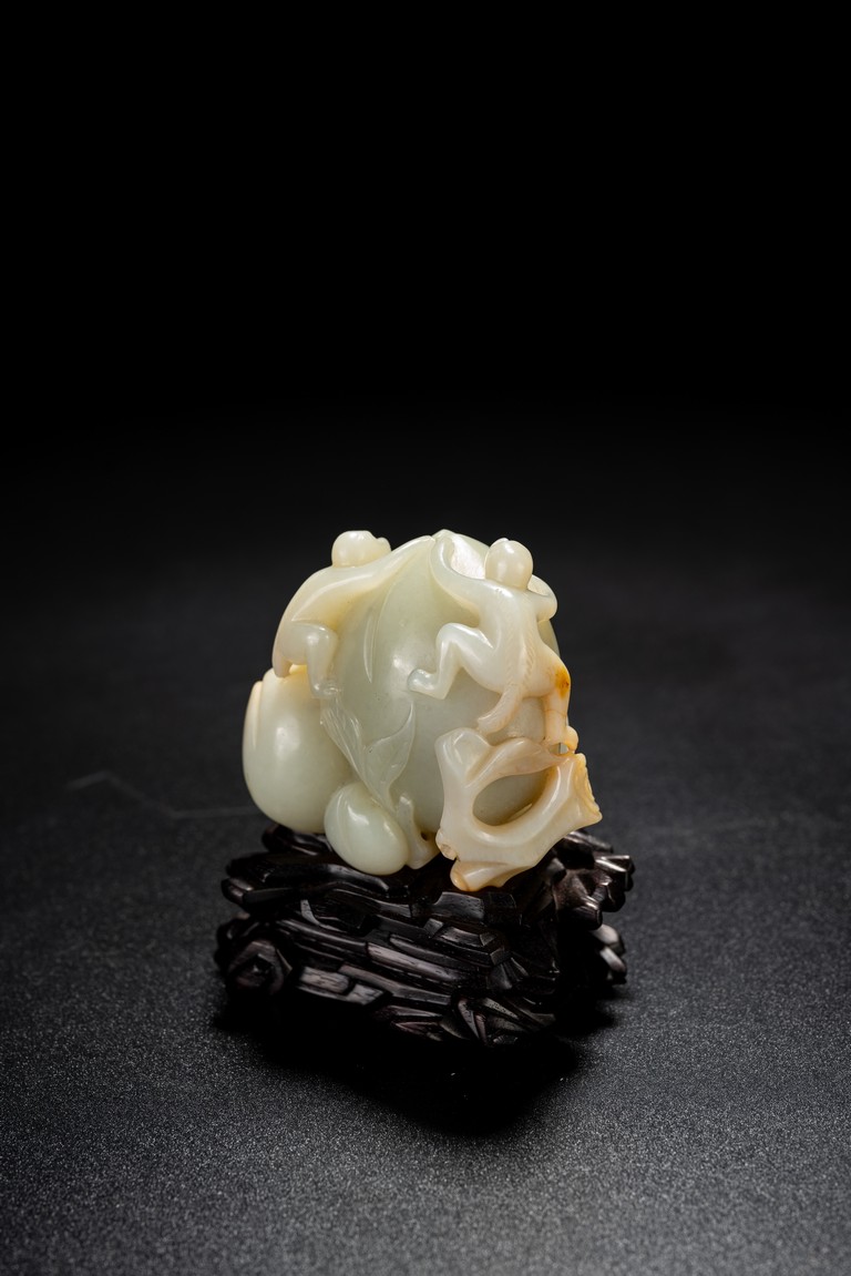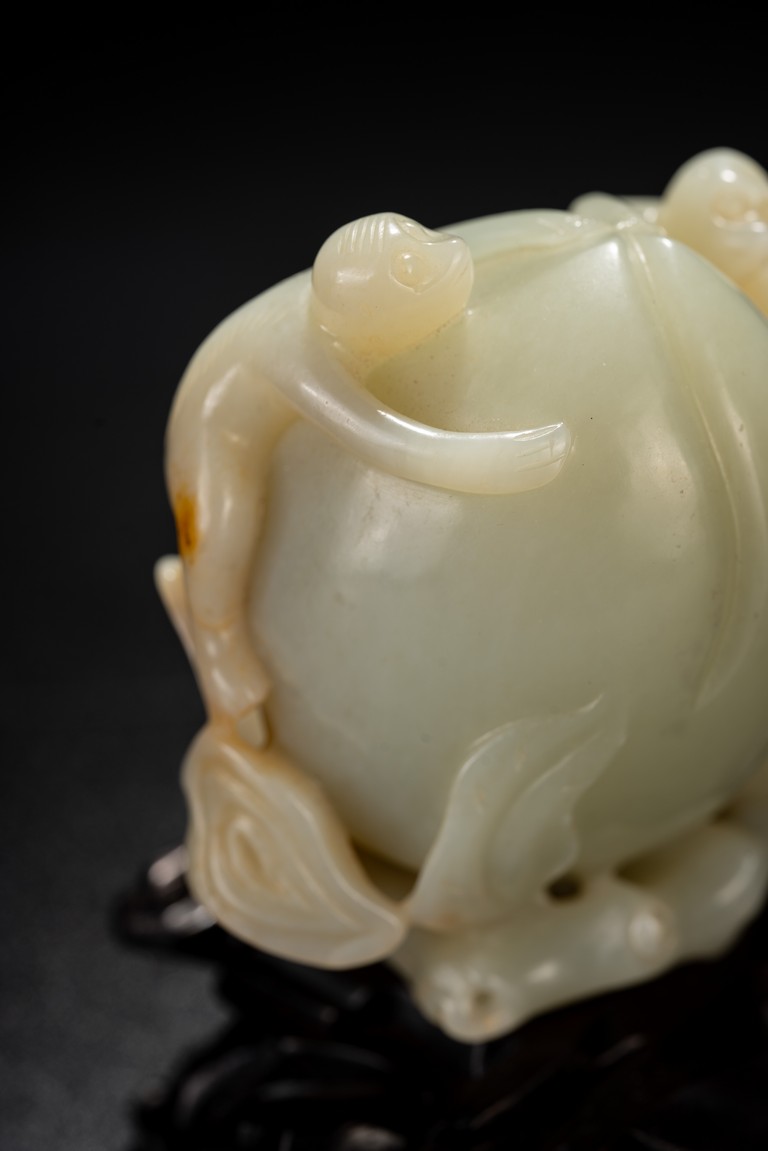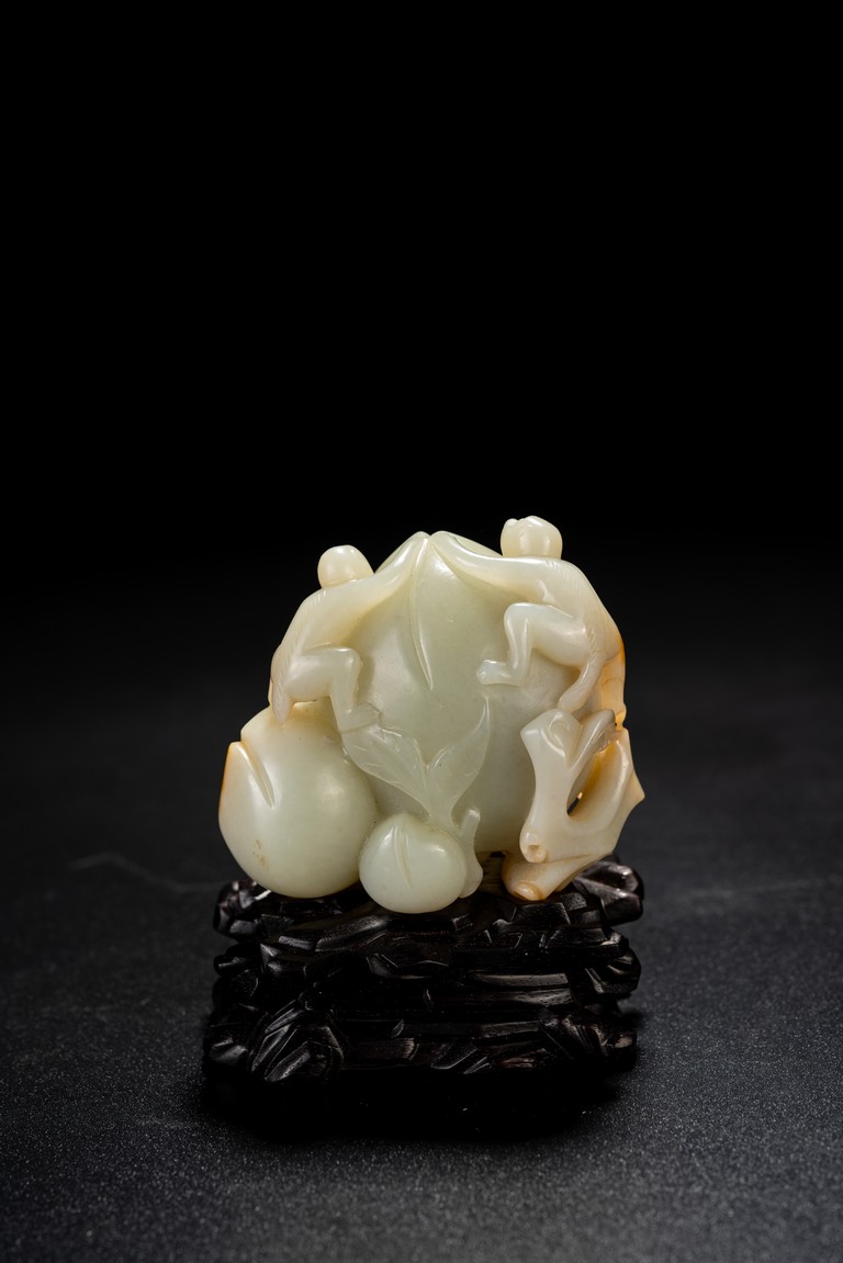 Qing Dynasty period. Carved in the form of monkeys clambering on large peach fruit, hardwood stand.